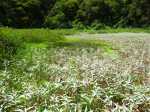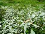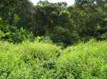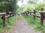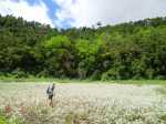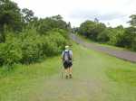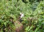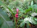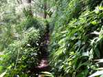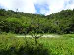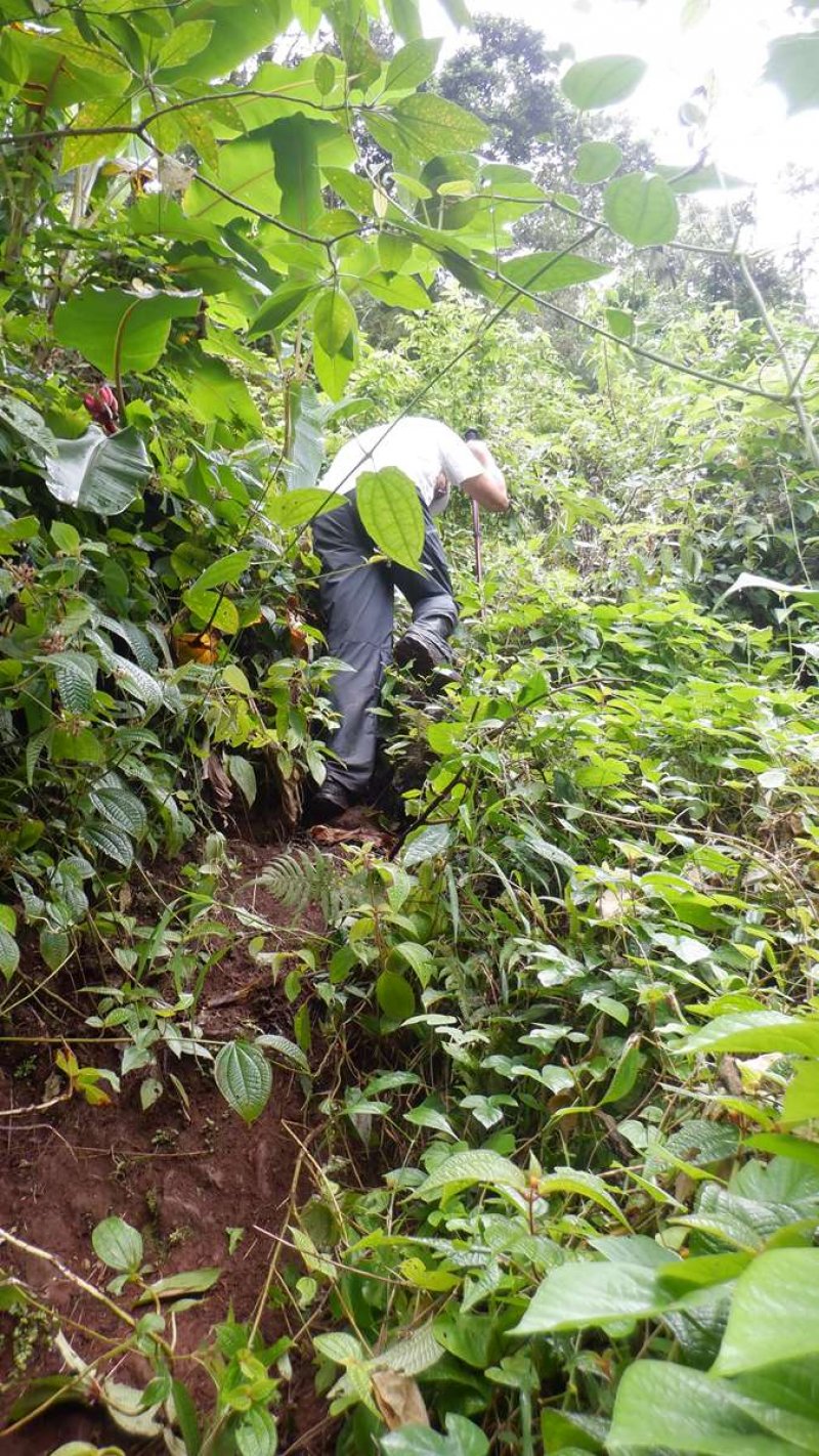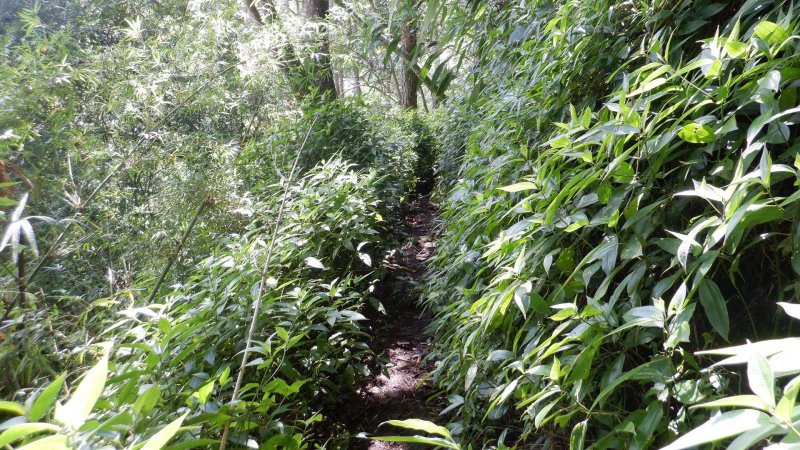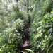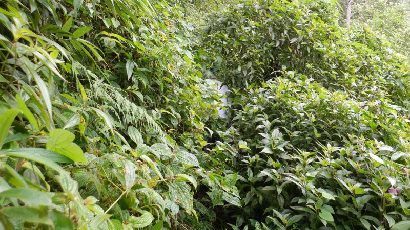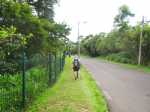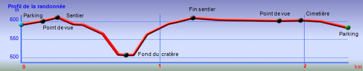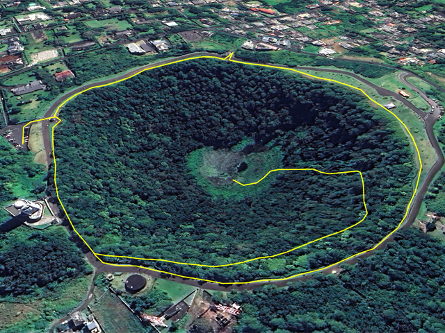 La randonnée débute au parking situé au carrefour de l'Avenue de la Vignac et Georges V Avenue qu'on atteint difficilement sans GPS si l'on ne connait pas la ville. Suivre le flot de touristes étonnés de croiser des marcheurs portant sac à dos et bâton ! On arrive sur une large avenue permettant d'apercevoir sur la droite la haute tour bleue de la station météorologique (Photo 1). Avant de se lancer sur le tour du cratère, se diriger vers un point de vue permettant de distinguer le fond pour en apprécier la profondeur et la végétation couvrant les flancs (Photo 2). Partir vers la droite puis longer le petit sentier qui borde l'avenue (Photo 3). Dépasser un peu la station météo et trouver la porte dans le grillage qui annonce le début du sentier (Photo 4). Le sentier ne plonge pas vers le centre. Il longe le rempart en descente douce en passant au début sous des touffes sombres de bambous (Photo 5). Le passage, peu fréquenté, n'est pas très large mais se suit sans hésitation dans une végétation très variée (Photo 6). Il est parfois très envahi et il faut un peu jouer des coudes pour pousser les tabacs bœuf et autres invasives (Photo 7). On a l'impression de côtoyer toutes les plantes et arbres de l'île, jusqu'aux ravenelles et pins (Photo 8). On aperçoit le fond entre les trouées. La tour bleue dépasse de la cime des arbres (Photo 9). Après quelques passages étroits et glissants où le pied a vite fait de partir dans le vide, on parvient au début d'une descente beaucoup plus forte que depuis le portillon (Photo 11). C'est le seul passage délicat car la glissade est facile malgré les plantes pour se maintenir (Photo 12). On parvient presque au fond du cratère. Il faut ensuite traverser une zone couverte de bananiers à fleurs poussant dans une zone humide où il est facile de perdre la trace (Photo 13). On remarque des murets, signe de l'organisation du lieu quelques décennies en arrière. Poursuivre et traverser une zone très envahie où la trace se rebouche aussitôt après le passage (Photo 14). Le sol, au fond du cratère, est presque entièrement couvert d'une plante aux feuilles grises, la persicaire du Sénégal, adepte des sols humides (Photo 15). Beaucoup de photos du lieu montrent un petit lac recouvrant le fond du cratère. Lors de notre passage, seule une mare d'eau croupissante occupait une petite place dans les persicaires (Photo 16). Le sol est d'ailleurs assez ferme pour pouvoir marcher sans crainte (Photo 17). Reprendre le chemin inverse puis traverser les hautes plantes en direction des bananiers (Photo 18). Traverser les bananiers et de grandes étendues de taros (Photo 19). Reprendre la montée, courte mais difficile sur le sentier étroit et envahi (Photo 20). On retrouve les zones de tabac bœuf où il faut faire très attention où poser le pied car la glissade est fréquente, mais heureusement stoppée par la végétation (Photo 21). Passer le portillon et reprendre le sentier entre grillage et route (Photo 22). Sur la droite, un écart est possible vers une zone verte en empruntant un beau sentier bordé de barrières (Photo 23). Profiter des panoramas en direction des montagnes à l'horizon (Photo 24). Idéalement placée au centre de l'île, la ville permet de repérer les principaux sommets dont la Montagne des Remparts et le Mont-Saint-Pierre, tout proche. On frôle un autre parking tout aussi fréquenté que celui du départ. La fin de la boucle longe toujours au plus près le grillage sans risque de s'égarer (Photo 25). Un nouvel écart permet de se rapprocher du cimetière des Esclaves malgaches où des cérémonies sont organisées à l'occasion de la fête de l'abolition (Photo 26). Un point de vue plus important que les autres donne sur le fond du cratère pour repérer les lieux visités 30 minutes avant (Photo 27). On rejoint très vite le parking.