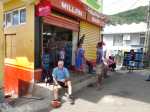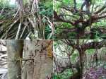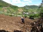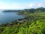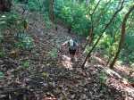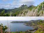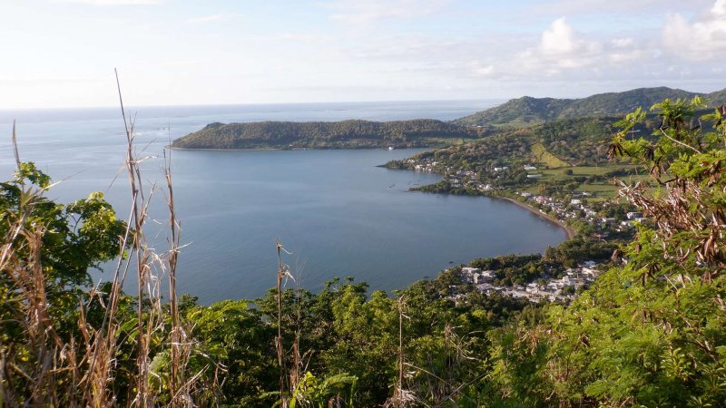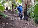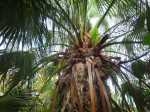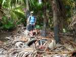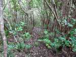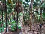La boucle, plus aventureuse : Les autres marcheront une trentaine de mètres sur le sentier de montée et bifurqueront à gauche au premier croisement. Les images ne peuvent pas représenter le fort pourcentage de la plongée dans les goyaviers (Photo 17). Toujours pas de lacets pour ralentir le corps qui est soumis à la forte attraction de la pente où les mains sont autant utilisées que les jambes (Photo 18). On parvient donc très vite à la lisière d'une grande palmeraie où l'épais tapis de feuilles mortes empêche de voir la trace (Photo 19). Heureusement, les taches de peinture rouge guident, de tronc en tronc, dans une pente toujours très forte (Photo 20). Ces grands lataniers peuvent atteindre les 20 m (Photo 21). Le sentier principal balisé de rouge se poursuit tout droit vers le bas de la pente. L'autre, menant à Marie Jeanne, débute à droite, toujours sous les palmiers. Il n'est pas facile à repérer. Guetter les bandes de tissu enroulées autour des troncs pour éviter de s'égarer dans cette immense palmeraie (Photo 22). Si l'on prend la peine de bien longer les arbres marqués, on arrive à une piste également bordée de palmiers (Photo 23). Suivre alors plusieurs pistes, le plus souvent encombrées de hautes herbes qui ne gênent pas la marche (Photo 24). Plus on descend, plus les pistes sont de bonne qualité. Les premières habitations isolées apparaissent. Le chemin est remplacé par deux bandes de roulement bétonnées bordées de vétiver (Photo 25). Le parcours se poursuit à partir du village de Marie Jeanne en filant tout droit. Pourtant, il est fort agréable de se diriger vers la boutique du village pour y déguster des pâtisseries locales ou se désaltérer avec des boissons rafraîchissantes (Photo 26). L'accueil est soigné et les discussions avec les habitants immédiates. Entamer la dernière partie, la plus difficile. Continuer sur la piste qui prolonge la route. Suite aux travaux de mise en place d'un nouveau champ, le sentier a disparu sur une centaine de mètres. Le mieux consiste à remonter ce champ (Photo 27) et pénétrer dans le bois pour retrouver le sentier grâce au GPS. La trace est aussi discrète que celle utilisée au départ, de plus, elle ne comporte pas de balisage. L'arrivée au gros figuier étrangleur confirme le bon itinéraire (Photo 28). On retrouve très vite le sentier emprunté sur la crête pour monter au Chat. Partir à gauche et retrouver le véhicule en reprenant le chemin à l'envers.