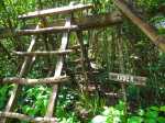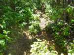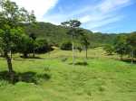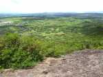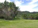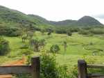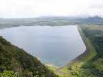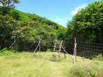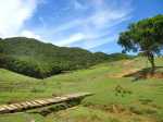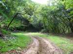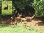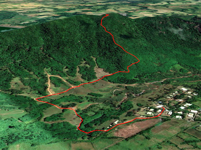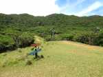 La randonnée débute au bureau d'accueil après avoir pris un petit déjeuner ou après avoir payé son droit de passage. Si on ignore quel type d'élevage pratique le domaine, inutile de demander ; le trophée du cerf de Java est assez explicite (Photo 1). Repérer le départ de tous les circuits très bien indiqués grâce à des panneaux et des flèches colorées. Longer quelques habitations et effectuer un court détour pour saluer les petits cochons noirs qui se précipitent, pensant obtenir de la nourriture (Photo 2). On pénètre réellement dans le domaine aux premiers pâturages ponctués, ça et là, de touffes de ravenelles (Photo 3). Poursuivre sur une piste bétonnée et glissante qui descend de plus en plus en effectuant des virages à travers une végétation clairsemée (Photo 4). Franchir le radier d'une des rivières traversant le domaine (Photo 5). Poursuivre en longeant des clôtures électrifiées ou en s'approchant de mangeoires destinées aux cervidés. L'endroit, fréquenté par les cerfs, a été labouré par les sabots (Photo 6). Marcher sans bruit pour être certain de les surprendre. Ils sont assez faciles à apercevoir même s'ils sont craintifs et fuient au moindre bruit (Photo 7). Sans doute les chasses organisées pour de riches touristes y sont-elles pour quelque chose ? Les chemins sont très agréables. Des arbres sont restés en place pour procurer de l'ombre aux animaux (Photo 8). Le terrain est vallonné, la marche s'effectue en guettant les cerfs et biches immobiles qui épient le randonneur ou qui s'enfuient (Photo 9). Des miradors destinés aux chasseurs et éleveurs se grimpent facilement pour permettre de les repérer (Photo 10). Le terrain étant assez plat, de petits ruisseaux effectuent d'agréables méandres donnant du cachet au paysage (Photo 11). Ils sont parfois à sec mais se rempliront sans doute à la première pluie (Photo 12). Impossible de s'égarer car les panneaux de couleur sont à chaque embranchement (Photo 13). Depuis le départ, collines et petites montagnes entourant ou faisant partie du domaine se repèrent à l'horizon (Photo 15). La piste se recouvre petit à petit d'herbe et la marche devient vraiment bucolique. De piste en chemin, on parvient à une clôture grillagée qui se franchit facilement par une double échelle en bois (Photo 16). L'allée bordée de jamrosats descend un peu et s'enfonce dans les bois. Les clôtures encore présentes, indiquent que les cervidés ne vivent pas que dans les prés. Ne pas manquer les nouveaux panneaux colorés qui sont à l'ombre. Le circuit noir et le jaune se poursuivent par la piste. Le rouge indique le sentier entamant la montée vers le point culminant à 640 m (Photo 17). La balade sur piste est finie ; la partie randonnée débute donc ici sur un passage de plus en plus étroit qui traverse une petite ravine au fond caillouteux (Photo 18). Il monte graduellement dans une forêt assez dense. Quelques rares rochers obligent à de petits contournements (Photo 19). Les arbres sont parfois si serrés qu'on se demande comment les mâles réussissent à passer entre les branches avec leurs grands bois (Photo 20). Une forte pente amène à un nouveau grillage. Prendre à gauche puis poursuivre sur le sentier (Photo 21). Il est assez terreux, parfois boueux avec de possibles glissades (Photo 22). Une nouvelle échelle confirme à nouveau qu'une rencontre est possible avec le cerf de Java (Photo 23). La suite est toujours du même acabit, branches, troncs en travers, roches et surtout parties glissantes (Photo 24). Après 30 minutes de montée, on parvient à un gros rocher occupant le sommet du Mount Lagrave. Il ne reste plus qu'à s'asseoir et contempler les immenses panoramas depuis ce centre presque parfait de l'île (Photo 25). De là, le domaine paraît encore plus vaste qu'on l'imaginait, mais difficile à cette distance, de repérer les biches (Photo 26). Pas de difficulté ni trop de danger de parcourir la zone rocheuse, excepté sans doute par temps de pluie (Photo 27). Au pied de la montagne couverte de forêt de chaque côté, on ne manque pas un m² du Midlands Dam Reservoir qui semble moins souffrir de la sécheresse que d'autres de l'île comme la Mare aux Vacoas. L'endroit est idéal pour prendre un casse croûte avant de reprendre le chemin à l'envers pour rejoindre le domaine.