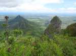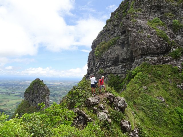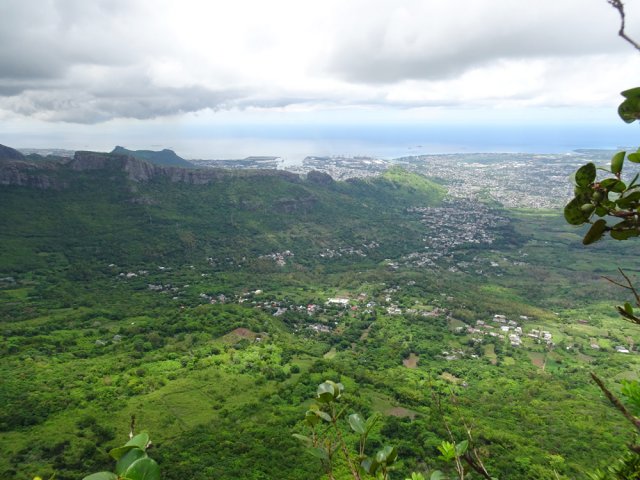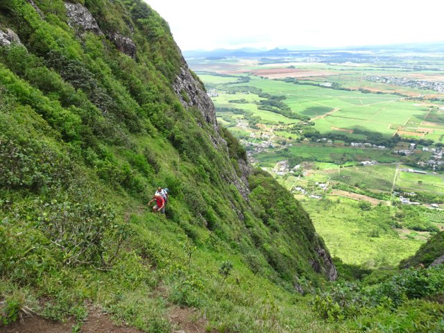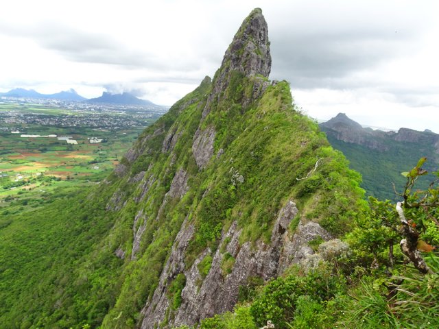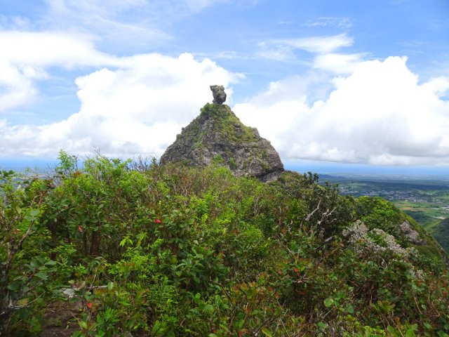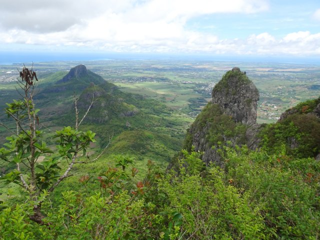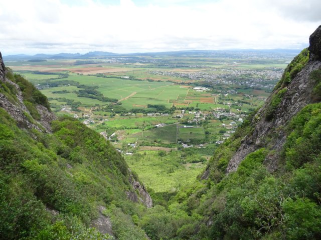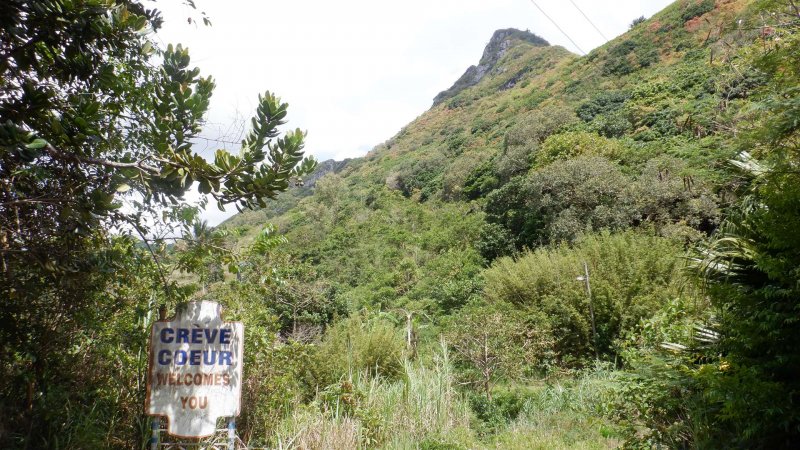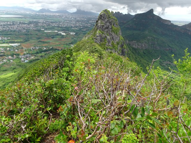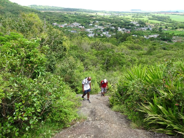 La randonnée débute à la fin de la route étroite où il n'est pas toujours facile de stationner sans gêner. Pour avoir une vue générale du massif et de la profonde faille, il vaut mieux être à La Laura (Photo 1). La descente n'est pas à la portée de tous et elle nécessite de très longues cordes (Photo 2). Une fois garé à Crève-Cœur entamer la sortie par une petite route qui se poursuit en chemin carrossable à condition de rouler lentement. Le chemin oblique sur la droite en franchissant une petite ravine. Passer sur le sentier créé dans les bambous balai pour se rapprocher du lit en rive droite. Une fine cascade coule en amont, plus importante en saison des pluies (Photo 3). Puis on repère à gauche le début de l'escalier en direction de Malenga qui se termine à un superbe point de vue sur les Deux Mamelles (Photo 4). L'escalier n'est pas très abrupt. Il comporte des paliers de deux rangées de marches, séparées par une bande destinée à faire passer les vélos (Photo 5). Situé en début de randonnée, il est préférable de l'entamer lentement pour chauffer les muscles puis on passe un beau kiosque sur la gauche. Peu d'ombre durant cette montée mais on en trouvera plus loin sous les goyaviers (Photo 6). L'escalier est remplacé par une large piste herbeuse longeant une tuyauterie. Après le point de vue, prendre à droite et emprunter la rue étroite qui traverse Malenga en direction du stade de La Laura. Passer de grandes demeures et tourner à droite à la troisième, là où pousse un grand pêcher et un manguier. On se retrouve vite sur une piste montant en direction du Pieter Both (Photo 7). La piste se transforme en sentier assez peu fréquenté mais facile à suivre en pente douce (Photo 8). Après un talus, il se termine au sentier classique de Pieter Both. La montée débute sur les roches entre les goyaviers. Quelques zones rocheuses imposent de se pencher vers l'avant pour ne pas glisser (Photo 9). Le sentier grimpe à l'assaut du rempart avec de hautes marches en pierre obligeant à mettre les mains. Plus on monte et plus la pente augmente. Les premières barres rocheuses abruptes arrivent. Heureusement, pas de difficulté pour les passer si les cordes installées par les guides sont toujours là (Photo 10). Les vues sur la campagne plantée de canne à sucre grandissent chaque minute, encadrées par les remparts du Pieter Both et du Crève-Cœur (Photo 11). Après plusieurs passages techniques et un virage à droite, le sentier devient plus rocheux et l'on parvient à un croisement de sentiers. Délaisser celui de droite menant à l'escalade du Pieter Both et poursuivre tout droit en direction du col (Photo 12). La trace jusqu'à l'arête rocheuse est étroite et glissante (Photo 13) mais quelques arbustes servent à se maintenir. Une fois au col, partir sur la gauche sur une trace dans les goyaviers. Une première partie rocheuse se franchit aisément sans forcément utiliser les barreaux scellés dans la roche (Photo 14). Le manque de végétation permet de belles vues sur l'île du côté des Deux Mamelles ou La Laura du côté sud (Photo 15). De l'autre côté, l'imposante face nord du Peter Both ne cache pas l'océan et d'autres pitons proches de la capitale (Photo 16). Mais le plus impressionnant est bien le Mont Crève-Cœur duquel on va s'approcher, sans pouvoir l'atteindre en raison de la faille (Photo 17). Le sentier est étroit dans les goyaviers (Photo 18). Plus on avance et plus il s'approche du vide au nord. Il n'est pas très fréquenté mais toujours visible et facile à suivre (Photo 19). Les goyaviers et quelques bois de couleur cachent le plus souvent le paysage. On remarque cependant la colline qu'on va franchir pour descendre en direction de Fente Brigitte (Photo 20). Une fois atteint le sommet, quel spectacle sur tous les pics de la région et même au-delà (Photo 21) ! Le Mont Crève-Cœur, sous cet angle, est presque aussi impressionnant que le Pieter Both (Photo 22). On se retrouve bientôt au plus près de la grande faille. Partir plutôt vers la gauche à travers les arbres pour parvenir au plus près (Photo 23). On a du mal à distinguer la cassure entre les deux pitons mais le Mont Crève-Cœur a encore pris de la superbe avec ses parois quasi verticales (Photo 24). La sortie, même sans la descente, vaut la peine d'être effectuée jusque là. Repartir vers la dernière colline pour profiter à nouveau de beaux paysages en direction de la Vallée des Prêtres, de Dauguet, du Pouce et de Snail Rock (Photo 25). On a également une vue globale sur la capitale et le port (Photo 26). Le retour emprunte le même itinéraire avec les goyaviers et les rochers à franchir (Photo 27). Juste avant d'arriver au col, le Pieter Both présente un profil original (Photo 28). Le retour à Crève-Cœur s'effectue tout en descente sur les rochers avec les cordes. Le sentier dans les pierres et les goyaviers semble interminable mais les marches de l'escalier permettent de descendre en trottinant.