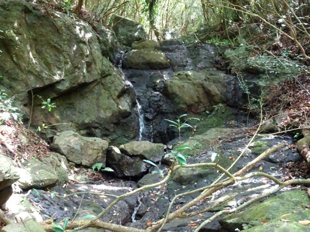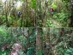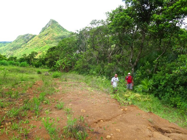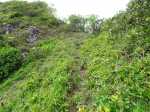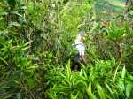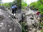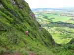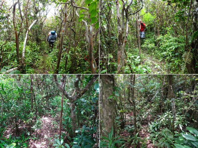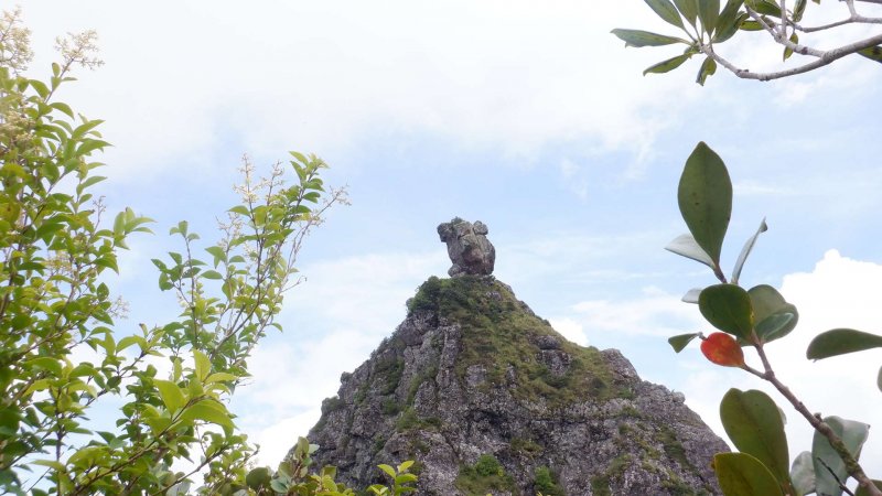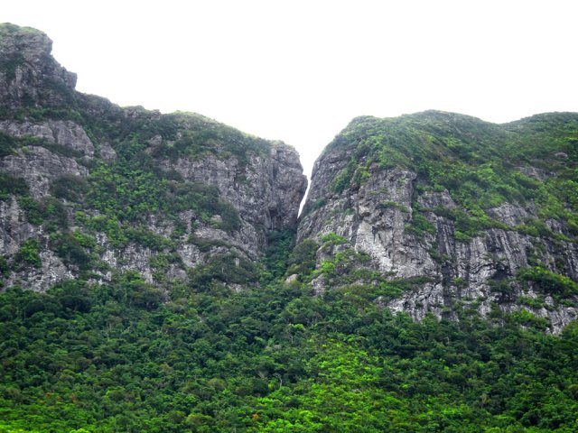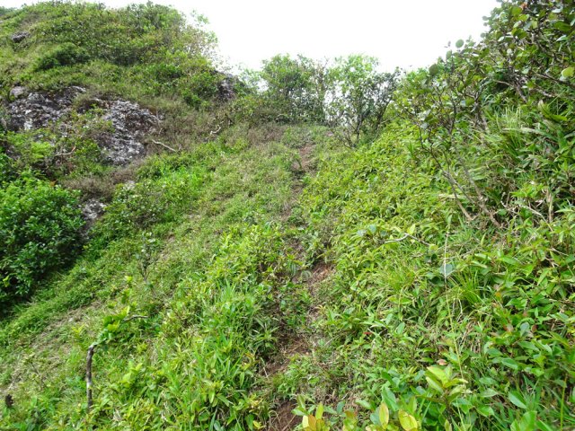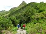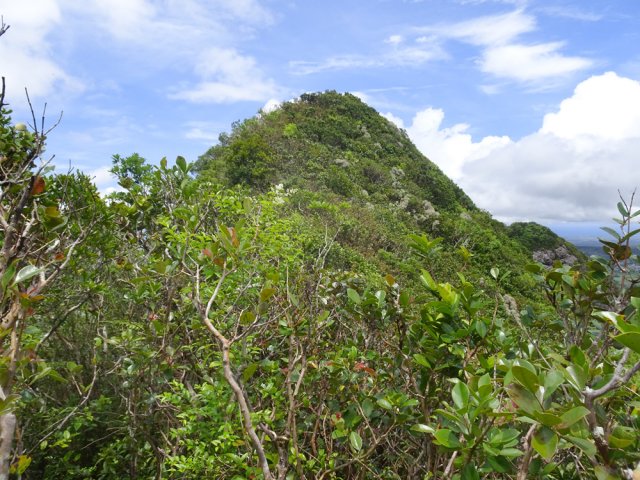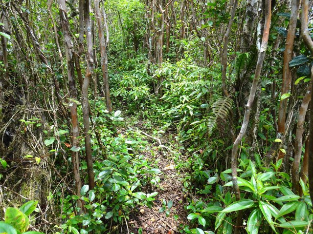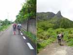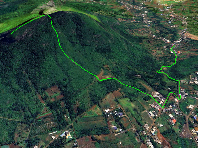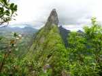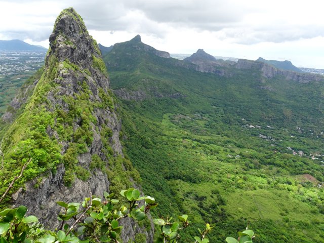 La randonnée débute à la fin de la route étroite où il n'est pas toujours facile de stationner sans gêner. Pour avoir une vue générale du massif et de la profonde faille, il vaut mieux être à La Laura (Photo 1). La descente n'est pas à la portée de tous et elle nécessite de très longues cordes (Photo 2). Une fois garé à Crève-Cœur entamer la sortie par une petite route qui se poursuit en chemin carrossable à condition de rouler lentement. Le chemin oblique sur la droite en franchissant une petite ravine. Passer sur le sentier créé dans les bambous balai pour se rapprocher du lit en rive droite. Une fine cascade coule en amont, plus importante en saison des pluies (Photo 3). Puis on repère à gauche le début de l'escalier en direction de Malenga qui se termine à un superbe point de vue sur les Deux Mamelles (Photo 4). L'escalier n'est pas très abrupt. Il comporte des paliers de deux rangées de marches, séparées par une bande destinée à faire passer les vélos (Photo 5). Situé en début de randonnée, il est préférable de l'entamer lentement pour chauffer les muscles puis on passe un beau kiosque sur la gauche. Peu d'ombre durant cette montée mais on en trouvera plus loin sous les goyaviers (Photo 6). L'escalier est remplacé par une large piste herbeuse longeant une tuyauterie. Après le point de vue, prendre à droite et emprunter la rue étroite qui traverse Malenga en direction du stade de La Laura. Passer de grandes demeures et tourner à droite à la troisième, là où pousse un grand pêcher et un manguier. On se retrouve vite sur une piste montant en direction du Pieter Both (Photo 7). La piste se transforme en sentier assez peu fréquenté mais facile à suivre en pente douce (Photo 8). Après un talus, il se termine au sentier classique de Pieter Both. La montée débute sur les roches entre les goyaviers. Quelques zones rocheuses imposent de se pencher vers l'avant pour ne pas glisser (Photo 9). Le sentier grimpe à l'assaut du rempart avec de hautes marches en pierre obligeant à mettre les mains. Plus on monte et plus la pente augmente. Les premières barres rocheuses abruptes arrivent. Heureusement, pas de difficulté pour les passer si les cordes installées par les guides sont toujours là (Photo 10). Les vues sur la campagne plantée de canne à sucre grandissent chaque minute, encadrées par les remparts du Pieter Both et du Crève-Cœur (Photo 11). Après plusieurs passages techniques et un virage à droite, le sentier devient plus rocheux et l'on parvient à un croisement de sentiers. Délaisser celui de droite menant à l'escalade du Pieter Both et poursuivre tout droit en direction du col (Photo 12). La trace jusqu'à l'arête rocheuse est étroite et glissante (Photo 13) mais quelques arbustes servent à se maintenir. Une fois au col, partir sur la gauche sur une trace dans les goyaviers. Une première partie rocheuse se franchit aisément sans forcément utiliser les barreaux scellés dans la roche (Photo 14). Le manque de végétation permet de belles vues sur l'île du côté des Deux Mamelles ou La Laura du côté sud (Photo 15). De l'autre côté, l'imposante face nord du Peter Both ne cache pas l'océan et d'autres pitons proches de la capitale (Photo 16). Mais le plus impressionnant est bien le Mont Crève-Cœur duquel on va s'approcher, sans pouvoir l'atteindre en raison de la faille (Photo 17). Le sentier est étroit dans les goyaviers (Photo 18). Plus on avance et plus il s'approche du vide au nord. Il n'est pas très fréquenté mais toujours visible et facile à suivre (Photo 19). Les goyaviers et quelques bois de couleur cachent le plus souvent le paysage. On remarque cependant la colline qu'on va franchir pour descendre en direction de Fente Brigitte (Photo 20). Une fois atteint le sommet, quel spectacle sur tous les pics de la région et même au-delà (Photo 21) ! Le Mont Crève-Cœur, sous cet angle, est presque aussi impressionnant que le Pieter Both (Photo 22). On se retrouve bientôt au plus près de la grande faille. Partir plutôt vers la gauche à travers les arbres pour parvenir au plus près (Photo 23). On a du mal à distinguer la cassure entre les deux pitons mais le Mont Crève-Cœur a encore pris de la superbe avec ses parois quasi verticales (Photo 24). La sortie, même sans la descente, vaut la peine d'être effectuée jusque là. Repartir vers la dernière colline pour profiter à nouveau de beaux paysages en direction de la Vallée des Prêtres, de Dauguet, du Pouce et de Snail Rock (Photo 25). On a également une vue globale sur la capitale et le port (Photo 26). Le retour emprunte le même itinéraire avec les goyaviers et les rochers à franchir (Photo 27). Juste avant d'arriver au col, le Pieter Both présente un profil original (Photo 28). Le retour à Crève-Cœur s'effectue tout en descente sur les rochers avec les cordes. Le sentier dans les pierres et les goyaviers semble interminable mais les marches de l'escalier permettent de descendre en trottinant.
