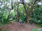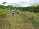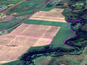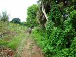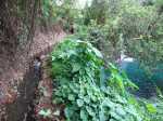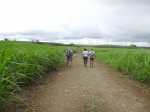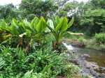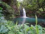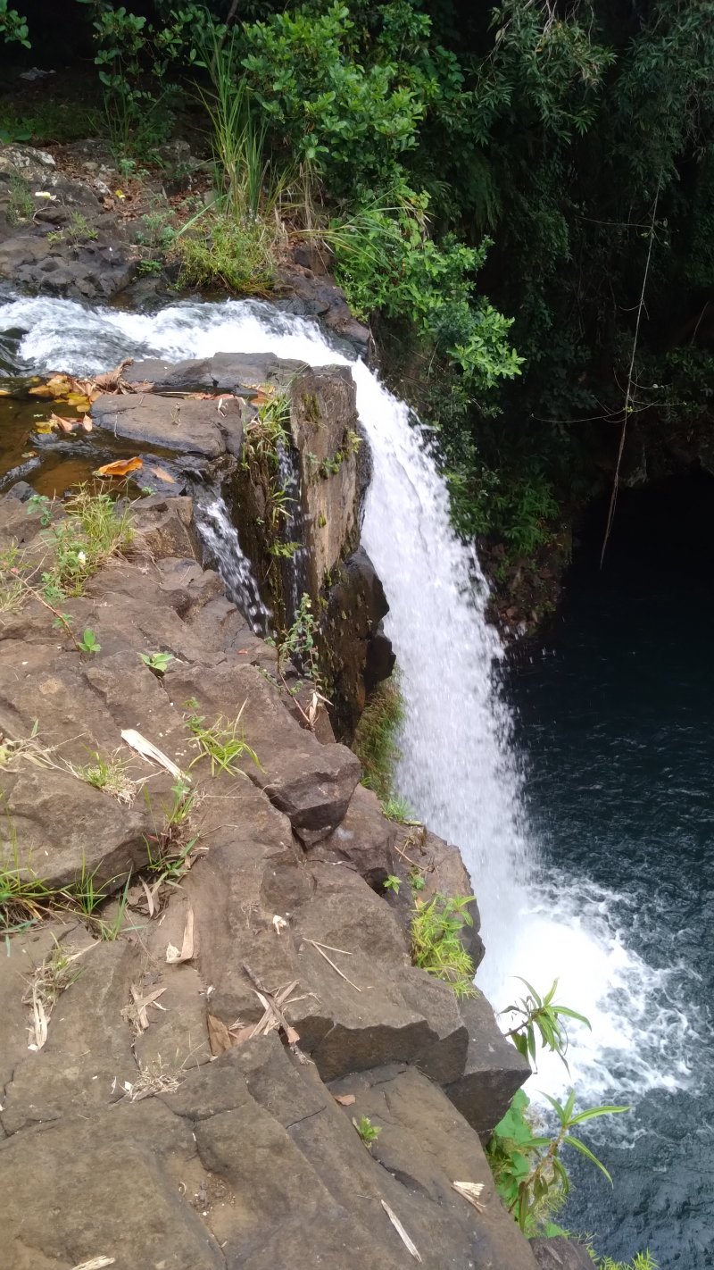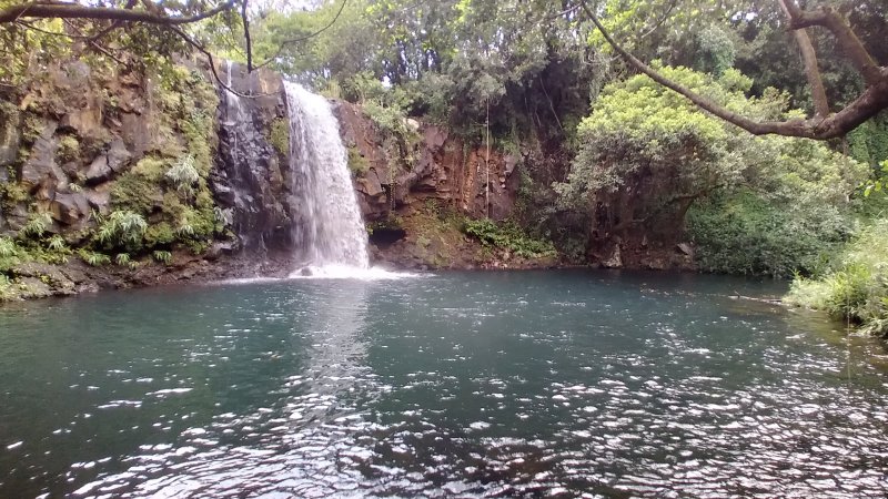 La randonnée débute en face de PWC, à un rond-point offrant plusieurs places de stationnement. Entamer la courte randonnée en partant sur la piste rectiligne entre les cannes (Photo 1). Très vite, on s'approche de la Rivière Cascade qui, par ses abords boisés, vient rompre la monotonie des paysages de champs plats couverts de canne à sucre (Photo 2). En arrivant au bord de la rivière coulant une dizaine de mètres plus bas, il est possible de marcher une cinquantaine de mètres vers l'aval pour la voir davantage (Photo 3). Repartir vers l'amont en longeant de grandes étendues de lianes recouvrant les berges (Photo 4). Pas de difficulté pour trouver le petit sentier qui débute à droite de la piste en terre (Photo 6). Très vite, il pénètre dans le sous-bois pour se rapprocher de la rivière (Photo 7). Nouvelle balade facile et plus pittoresque entre les grands arbres (Photo 8) et palmiers éventails de Chine qui encombrent les berges (Photo 9). Rejoindre les arbres avant d'entamer la descente vers l'eau (Photo 10). Longer quelques jardins ou maraîchages sur la droite (Photo 11). On parvient, à peine un quart d'heure après le départ du rond-point, en vue de la cascade qu'on entendait depuis deux minutes (Photo 12). En se mouillant un peu les pieds, on atteint la rive gauche pour contourner le bassin et se rapprocher de la belle chute d'eau (Photo 13). Profiter du bassin en fonction de la saison, du chrono ou de la météo. Avant de faire demi-tour, emprunter le sentier qui remonte vers les champs puis bifurquer à droite pour longer un petit canal de récupération d'eau (Photo 14). Destinée à l'arrosage des cultures, elle est récupérée grâce à une écluse (Photo 15). Vers l'aval, le haut de la chute est facile à rejoindre pour apercevoir le grand bassin (Photo 16). Quitter l'écluse bordée de grandes oreilles d'éléphant (Photo 17) et regagner le rond-point du départ en empruntant le même itinéraire ou d'autres pistes à travers champs.