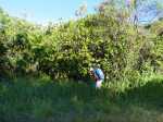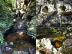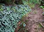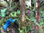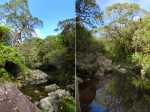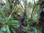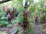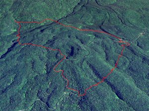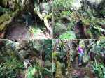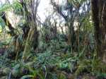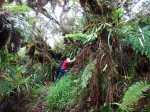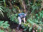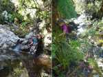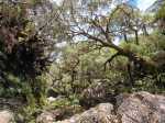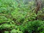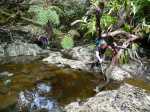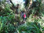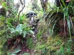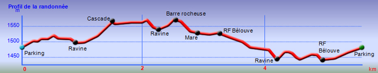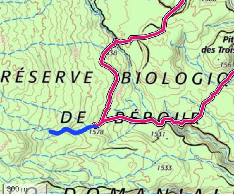 La randonnée débute à quelques mètres du minuscule parking herbeux, côté Sud. Aucune trace de passage durant deux mètres, comme si ce départ de sente devait rester invisible le plus possible (Photo 1). On est immédiatement enveloppé par cette magnifique forêt primaire ou les arbres moussus abritent des dizaines de variétés d'épiphytes (Photo 2). Ne pas se lancer sans garder à l'esprit que la trace sera très difficile à repérer. Des signes ne trompent pourtant pas. On remarque régulièrement des entailles plus ou moins discrètes sur les écorces des arbres ou arbustes, une absence de mousse là où les pieds ou les fesses se posent sur les troncs, les éternelles bouteilles et boîtes vides, des morceaux de sacs plastiques, le tout laissé par les visiteurs (Photo 3). Côté effort, se préparer à se baisser souvent pour passer sous les arches végétales, à grimper ou descendre des talus et enjamber des dizaines d'arbres couchés au sol depuis des décennies (Photo 4). Hormis ces détails, la description de la boucle est assez facile : marcher dans la forêt primaire en prenant garde à ne pas quitter le sentier et tenter de reconnaître toutes les plantes rencontrées (Photo 5). La forêt est très touffue excepté quelques courts tronçons où le regard porte à une trentaine de mètres (Photo 6). Un seul point de vue, à travers les arbres, est possible sur la face est du Piton des Neiges (Photo 7). On le retrouvera lors de la traversée du Plateau de Thym. Le sentier, toujours aussi étroit, traverse facilement plusieurs petites ravines avant de parvenir à une plus importante, affluent de la Rivière des Marsouins. Pas de sentier en rive droite escaladant le talus vertical. Il faut donc partir vers l'amont de la ravine en suivant les traces encore plus discrètes qu'en forêt ou marcher sur les galets (Photo 8). De grands bassins bordés de magnifiques tamarins s'évitent par des traces de contournement (Photo 9). La ravine, qu'il faut suivre sur exactement 600 m, traverse la belle forêt où les énormes branles moussus côtoient les tamarins des Hauts et fanjans (Photo 10). Certains passages peuvent s'avérer techniques ou glissants. Prendre son temps pour ces passages qui ralentissent une marche déjà très lente (Photo 11). Comme toutes les ravines de l'île, le fond basaltique peut être très découpé et proposer marmites, petites chutes ou bassins d'eau souvent rougie par les oxydes de fer (Photo 12). Si elle inspire peu pour la baignade, elle s'avère agréable pour laver la boue des chaussures. Après 500 m de montée, repérer une petite chute et deux grottes sur les côtés. C'est là que se poursuit la boucle. Mais avant de revenir en forêt profonde, poursuivre vers l'amont jusqu'au camp de braconniers. Ils ont choisi le meilleur emplacement pour pouvoir se reposer à plat mais aussi se baigner sous une petite cascade et son grand bassin (Photo 13). Redescendre jusqu'aux deux fanjans repérés en montant au milieu du lit de la ravine (Photo 14). C'est reparti pour la marche en forêt en escaladant tout d'abord la rive gauche au plus près de la grotte (Photo 15). C'est aussi reparti pour la chasse aux encoches ou emplacements privés de mousse sur des pentes parfois très fortes (Photo 16). On retrouve avec plaisir arbres, épiphytes, mousse, fougères et orchidées (Photo 17). Il faut à nouveau franchir de petites ravines sans eau (Photo 18). L'une d'entre elles, plus large et plus profonde que les autres est totalement envahie de bringeliers, jouvences mais surtout vigne marronne qui peut griffer au passage (Photo 19). La pente est forte pour sortir de la vallée. En arrivant plus haut, plusieurs passages semblent se présenter. Les délaisser pour partir à angle droit vers la droite en se repérant aux écorces blessées. Quelques efforts sont encore nécessaires pour le franchissement de talus assez hauts et bien marqués sur les cartes (Photo 20). Après 4 heures de marche, le sentier descend et l'on devine plus de lumière à l'avant (Photo 21). On se retrouve sans transition sur le Plateau de Thym entouré de falaises verticales. Les branles ont remplacé la forêt. Le sol est recouvert de mousse, d'herbe et de faux thym (Erica galioides : Photo 22). Le sentier est très difficile à suivre mais il est impossible de s'égarer. On arrive ainsi à la mare pour une seconde vue sur le Piton des Neiges (Photo 23). En arrivant près de la route, on comprend pourquoi ce plateau est de moins en moins visité par les randonneurs. Partout sur les arbustes ou près des falaises, des grigris à forte connotation ésotérique peuvent rebuter les plus sensibles (Photo 24). Rejoindre la route puis le sentier des Mares et des Bois de Couleurs de l'autre côté. Délaissé par l'ONF, ce sentier est encore en assez bon état (Photo 25). Il ondule au gré du relief sur un sol pierreux mais surtout boueux. Plusieurs ravines à franchir obligent à descendre pour remonter aussitôt (Photo 26). Par beau temps ce sentier est un paradis pour les photographes (Photo 27). Outre les fougères, longoses et jouvences, on remarque une invasion de plus en plus spectaculaire du bégonia royal (Photo 28). Le premier sentier à droite mène à la route qu'il suffit de suivre sur 600 m pour retrouver le petit parking de départ.