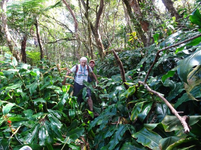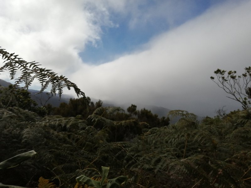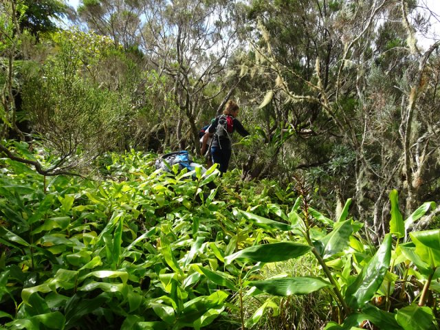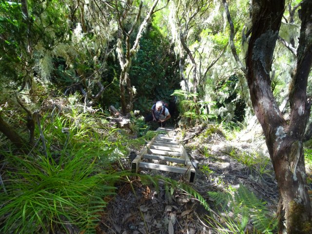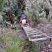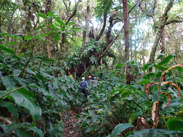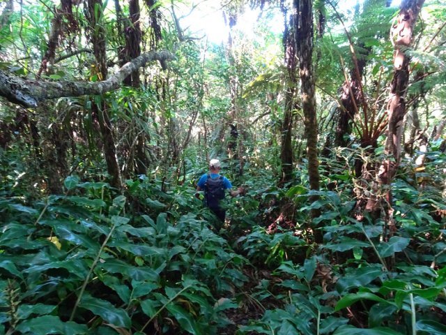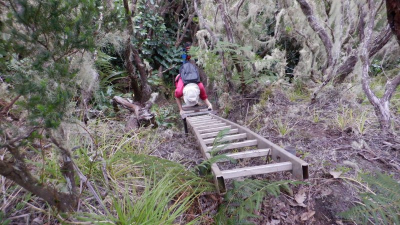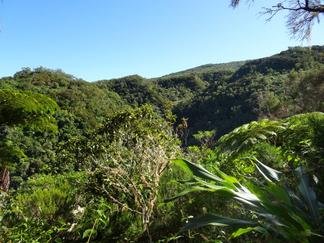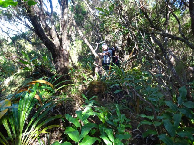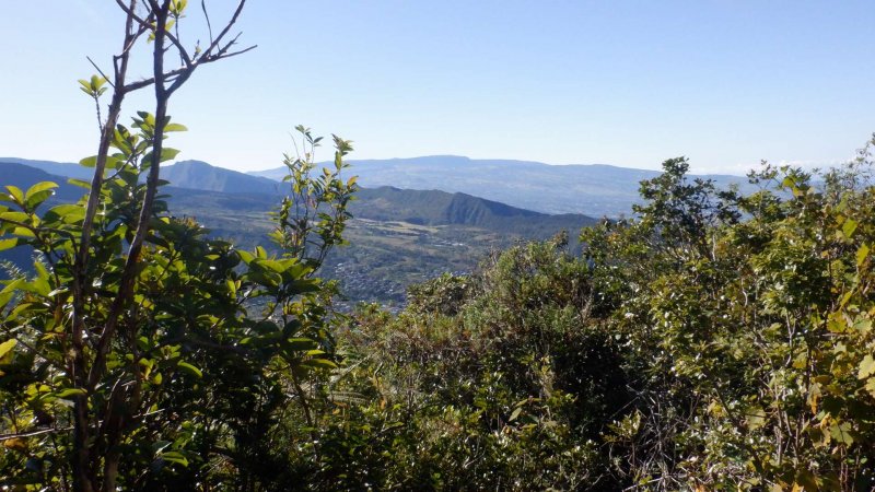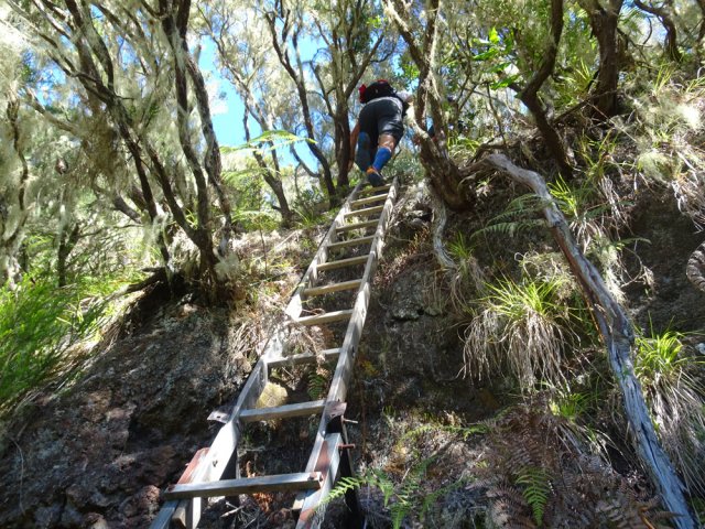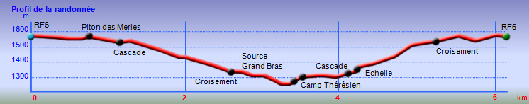 La randonnée débute dans un lacet de la RF6 à un petit emplacement de stationnement au départ du sentier du Piton des Merles. Le sentier est discret dans la vigne marronne entre les tamarins des Hauts (Photo 1). Le sentier, peu fréquenté, est tout de même bien visible entre des haies de longoses qui cherchent à l'obstruer (Photo 2). C'est le moment de faire demi-tour si l'on est allergique aux longoses qu'on côtoiera jusqu'à la fin de la boucle. La végétation est surtout constituée de hauts fanjans et de quelques bois de couleurs dont de beaux tans rouges, bois maigres et des tamarins qui procurent un peu d'ombre (Photo 3). Par moments, les parties les plus étroites du sentier sont dues à la présence de renouées du chinois (Persicaria chinensis). Le sol descend régulièrement pour franchir des petites ravines dont le Bras Vera et le Bras de la Loge (Photo 4). Après 45 minutes à travers les longoses, le sentier s'approche d'un bassin et du Piton des Merles totalement invisible. Avant de poursuivre en rive gauche du Bras de la Ravine Sèche, poursuivre un peu pour s'approcher du bassin et de sa petite cascade qui coule peu (Photo 5). Le sentier se poursuit dans les mêmes conditions et les mêmes éléments sur une pente en faible descente (Photo 6). Jamais on ne se pose la question de l'itinéraire tant la trace est bien marquée (Photo 7). Le sentier est très souvent élargi par les labourages incessants des cochons sauvages qui creusent la terre jusqu'à 40 cm par endroits (Photo 8). Il faut bien 90 minutes pour atteindre le croisement des sentiers venant du Piton de la Croix et reliant celui du Malabar Mort. Le point de vue sur les Makes, la Plaine des Cafres et le Morne Langevin est toujours aussi agréable (Photo 9). La descente vers le Piton de la Croix et Source Nouvelle est un peu moins marquée que le sentier précédent mais le coupe-coupe n'est pas encore nécessaire (Photo 10). Le terrain devient plus irrégulier avec de fortes descentes vers les petites ravines suivies de tout aussi fortes montées (Photo 11). Toujours aucun changement dans la végétation au cœur de cette forêt du Tévelave (Photo 12). On longe le Bras de la Ravine Sèche coulant au fond d'une profonde vallée (Photo 13). Après ces dents de scie comportant plusieurs endroits glissants, on parvient au sentier longeant une canalisation venant des captages du Grand Bras (Photo 14). On a du mal à deviner la tuyauterie en raison des longoses, excepté lors du franchissement des petites ravines (Photo 15). Juste après le franchissement du Grand Bras en remontant un peu la ravine, le sentier passe dans une tranchée. Repérer, sur la droite, le petit sentier qui monte en quelques marches au Camp Thérésien abritant encore la panthère des longoses qui a mal vieilli mais veille encore sur le lieu servant d'abri ou de refuge (Photo 16). Saluer au passage un oratoire dédié à un concurrent du Grand Raid, reprendre la marche et rejoindre le Bras de la Ravine Sèche qui abrite un captage. Le sentier se poursuit après la traversée du bras mais il est conseillé de remonter la ravine sur les grosses roches moussues pour atteindre le bassin de recueil (Photo 17). Rejoindre la retenue destinée au captage et partir vers l'amont sur quelques mètres pour apercevoir la modeste cascade en période sèche (Photo 18). Après cet intermède facultatif, reprendre le sentier, qui, très vite, devient de plus en plus difficile à suivre dans les longoses et pailles sabres (Photo 19). C'est est fini de la longue descente. La remontée est de plus en plus sportive. Des sangles, heureusement installées dans les plus fortes pentes, facilitent les passages. L'une d'entre elles permet de franchir un véritable mur où elle s'avère très utile (Photo 20). Aussitôt l'obstacle franchi, le rempart devient encore plus vertical mais une échelle aide à son franchissement (Photo 21). Elle n'est pas très haute mais il vaut mieux éviter d'amener des chiens qu'il faudrait sans doute porter (Photo 22). Après l'échelle, on se retrouve sur une ligne de crête peuplée cette fois de gros branles moussus où les longoses tentent cependant de s'incruster (Photo 23). Les vues sur le Bras de la Ravine Sèche sont aussi impressionnantes que les précédentes (Photo 24). La trace, de plus en plus difficile à suivre impose de couper les longoses pour rassurer sur l'itinéraire (Photo 25). La pente reste raisonnable dans cette forêt qui n'aura jamais changé de physionomie hormis après l'échelle (Photo 26). On retrouve une courte portion de branles annonçant l'arrivée proche du sentier du Piton des Merles emprunté à l'aller (Photo 27). Une fois sur ce sentier, partir à gauche dans les joncs, chèvrefeuilles et vigne marronne et retrouver le parking du départ après une dernière immersion dans les longoses qu'on aura traversés durant plus de 6 heures.