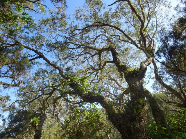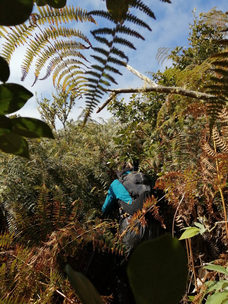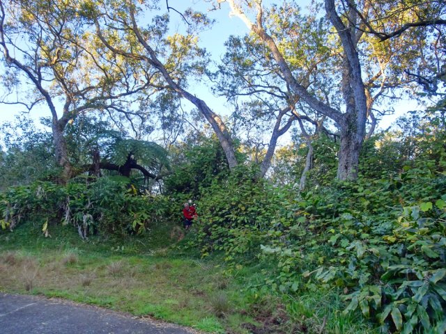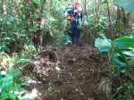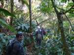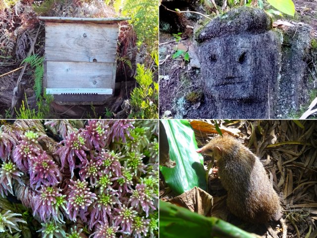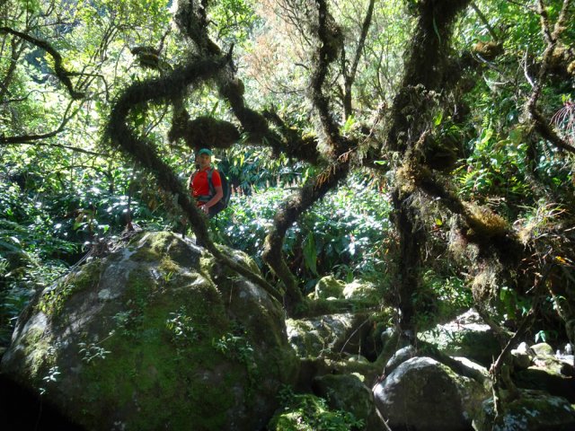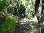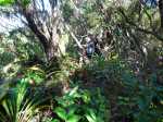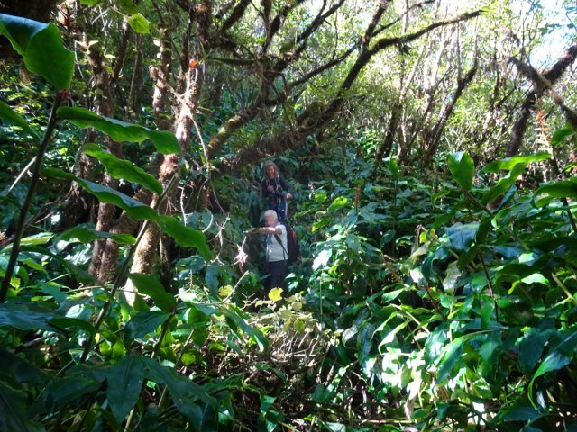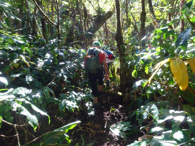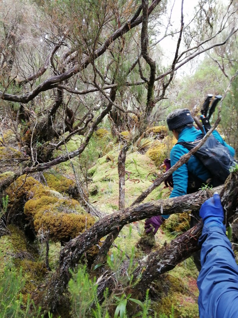 La randonnée débute dans un lacet de la RF6 à un petit emplacement de stationnement au départ du sentier du Piton des Merles. Le sentier est discret dans la vigne marronne entre les tamarins des Hauts (Photo 1). Le sentier, peu fréquenté, est tout de même bien visible entre des haies de longoses qui cherchent à l'obstruer (Photo 2). C'est le moment de faire demi-tour si l'on est allergique aux longoses qu'on côtoiera jusqu'à la fin de la boucle. La végétation est surtout constituée de hauts fanjans et de quelques bois de couleurs dont de beaux tans rouges, bois maigres et des tamarins qui procurent un peu d'ombre (Photo 3). Par moments, les parties les plus étroites du sentier sont dues à la présence de renouées du chinois (Persicaria chinensis). Le sol descend régulièrement pour franchir des petites ravines dont le Bras Vera et le Bras de la Loge (Photo 4). Après 45 minutes à travers les longoses, le sentier s'approche d'un bassin et du Piton des Merles totalement invisible. Avant de poursuivre en rive gauche du Bras de la Ravine Sèche, poursuivre un peu pour s'approcher du bassin et de sa petite cascade qui coule peu (Photo 5). Le sentier se poursuit dans les mêmes conditions et les mêmes éléments sur une pente en faible descente (Photo 6). Jamais on ne se pose la question de l'itinéraire tant la trace est bien marquée (Photo 7). Le sentier est très souvent élargi par les labourages incessants des cochons sauvages qui creusent la terre jusqu'à 40 cm par endroits (Photo 8). Il faut bien 90 minutes pour atteindre le croisement des sentiers venant du Piton de la Croix et reliant celui du Malabar Mort. Le point de vue sur les Makes, la Plaine des Cafres et le Morne Langevin est toujours aussi agréable (Photo 9). La descente vers le Piton de la Croix et Source Nouvelle est un peu moins marquée que le sentier précédent mais le coupe-coupe n'est pas encore nécessaire (Photo 10). Le terrain devient plus irrégulier avec de fortes descentes vers les petites ravines suivies de tout aussi fortes montées (Photo 11). Toujours aucun changement dans la végétation au cœur de cette forêt du Tévelave (Photo 12). On longe le Bras de la Ravine Sèche coulant au fond d'une profonde vallée (Photo 13). Après ces dents de scie comportant plusieurs endroits glissants, on parvient au sentier longeant une canalisation venant des captages du Grand Bras (Photo 14). On a du mal à deviner la tuyauterie en raison des longoses, excepté lors du franchissement des petites ravines (Photo 15). Juste après le franchissement du Grand Bras en remontant un peu la ravine, le sentier passe dans une tranchée. Repérer, sur la droite, le petit sentier qui monte en quelques marches au Camp Thérésien abritant encore la panthère des longoses qui a mal vieilli mais veille encore sur le lieu servant d'abri ou de refuge (Photo 16). Saluer au passage un oratoire dédié à un concurrent du Grand Raid, reprendre la marche et rejoindre le Bras de la Ravine Sèche qui abrite un captage. Le sentier se poursuit après la traversée du bras mais il est conseillé de remonter la ravine sur les grosses roches moussues pour atteindre le bassin de recueil (Photo 17). Rejoindre la retenue destinée au captage et partir vers l'amont sur quelques mètres pour apercevoir la modeste cascade en période sèche (Photo 18). Après cet intermède facultatif, reprendre le sentier, qui, très vite, devient de plus en plus difficile à suivre dans les longoses et pailles sabres (Photo 19). C'est est fini de la longue descente. La remontée est de plus en plus sportive. Des sangles, heureusement installées dans les plus fortes pentes, facilitent les passages. L'une d'entre elles permet de franchir un véritable mur où elle s'avère très utile (Photo 20). Aussitôt l'obstacle franchi, le rempart devient encore plus vertical mais une échelle aide à son franchissement (Photo 21). Elle n'est pas très haute mais il vaut mieux éviter d'amener des chiens qu'il faudrait sans doute porter (Photo 22). Après l'échelle, on se retrouve sur une ligne de crête peuplée cette fois de gros branles moussus où les longoses tentent cependant de s'incruster (Photo 23). Les vues sur le Bras de la Ravine Sèche sont aussi impressionnantes que les précédentes (Photo 24). La trace, de plus en plus difficile à suivre impose de couper les longoses pour rassurer sur l'itinéraire (Photo 25). La pente reste raisonnable dans cette forêt qui n'aura jamais changé de physionomie hormis après l'échelle (Photo 26). On retrouve une courte portion de branles annonçant l'arrivée proche du sentier du Piton des Merles emprunté à l'aller (Photo 27). Une fois sur ce sentier, partir à gauche dans les joncs, chèvrefeuilles et vigne marronne et retrouver le parking du départ après une dernière immersion dans les longoses qu'on aura traversés durant plus de 6 heures.