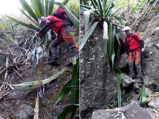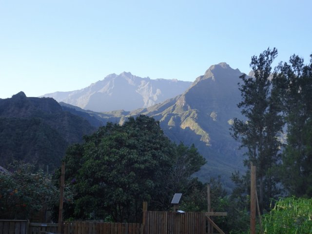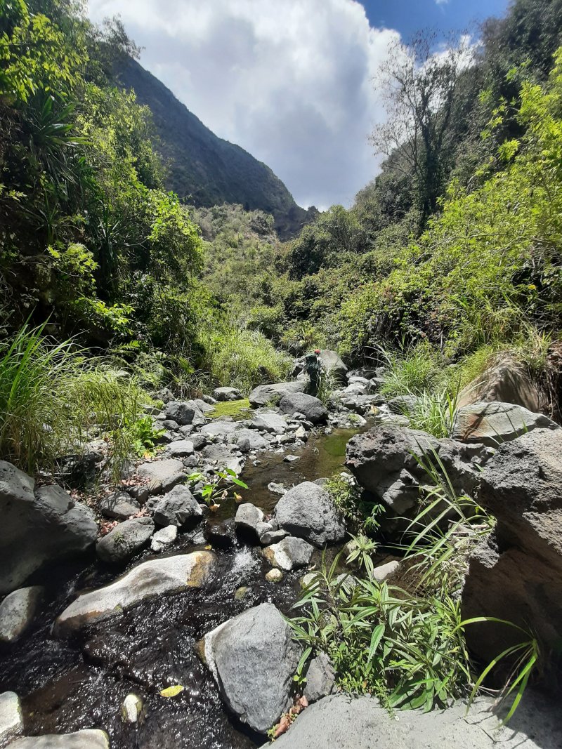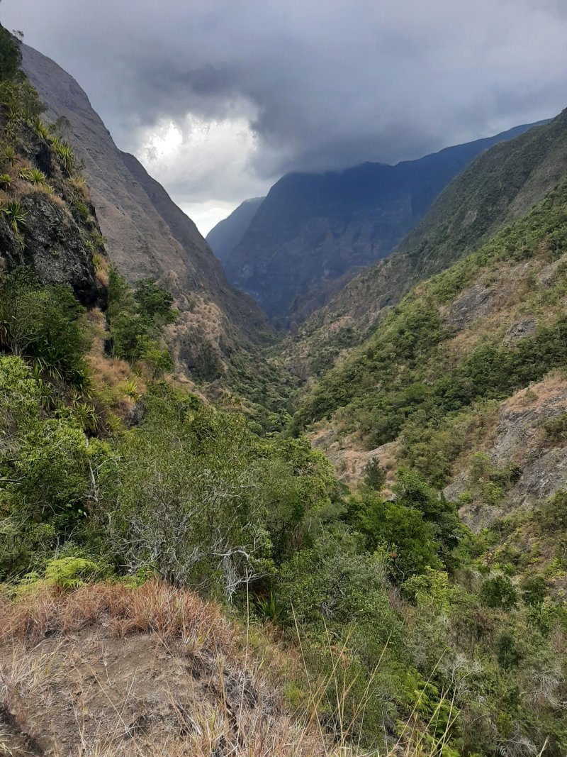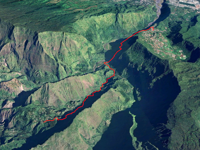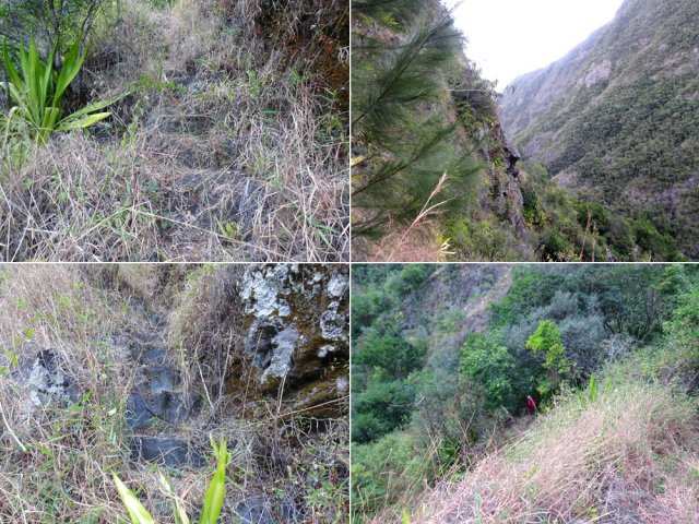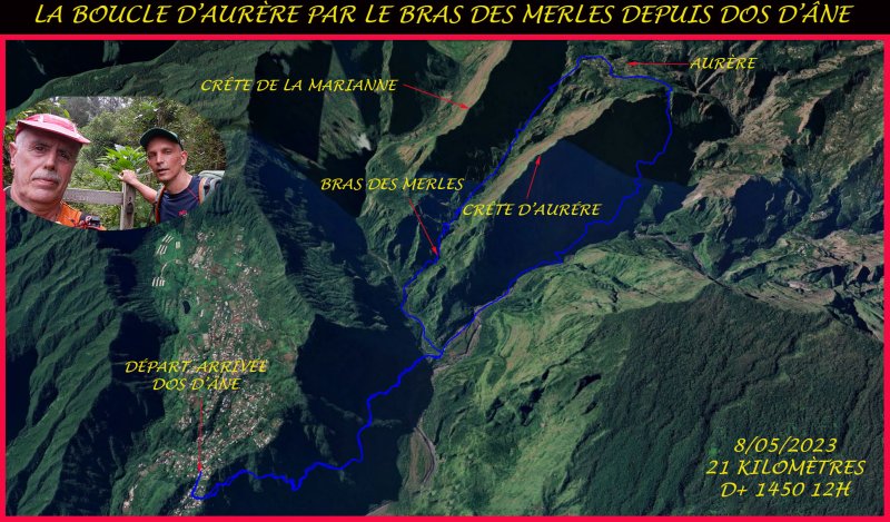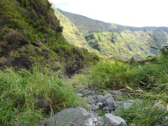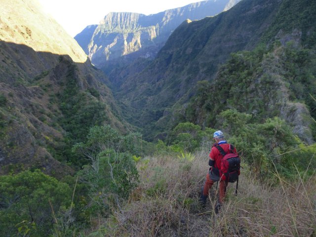 La randonnée débute au cœur de l'îlet d'Aurère situé à 950 m d'altitude où de nombreux gîtes accueillent les randonneurs de passage. Rejoindre l'épicerie par une des voies principales bordée de filaos (Photo 1). Après le petit déjeuner, on croise de nombreux groupes partant dans toutes les directions. Le soleil n'éclaire pas encore les habitations mais fait bien ressortir les plus hauts sommets (Photo 2). Partir plein nord et marcher en direction de la Réserve et du sentier Augustave. Comme souvent sur l'île, de magnifiques poteaux de l'ONF annoncent la destination et le temps nécessaire mais, tout près, d'autres en interdisent l'accès (Photo 3). Prendre donc ses responsabilités pour poursuivre sachant que cet itinéraire ne sera sans doute jamais réhabilité. Le sentier est superbe, bien entretenu et la progression laisse imaginer qu'on est effectivement parti pour 2h55 jusqu'à Deux Bras (Photo 4). Entretenu par les propriétaires de parcelles, il est emprunté quotidiennement. Parvenu au dernier verger, on comprend très vite que c'en est fini de la belle trace. Il faut longer la clôture de ce dernier dans les galaberts qui auront tôt fait d'envahir totalement le passage (Photo 5). La portion mal entretenue est très courte et l'on retrouve rapidement des morceaux du sentier historique. Admirer, avant d'entamer la descente, le sommet du Piton Cabris déjà noyé de soleil alors que l'ombre subsistera encore longtemps dans la profonde vallée (Photo 6). On embrasse du regard toute l'aventure à venir pour atteindre le fond de la vallée et le pied de la Crête de la Marianne pour retrouver le Bras de Ste-Suzanne (Photo 7). Le sentier, qui comporte encore de belles portions de marches, est vertigineux et glissant sur les portions sableuses (Photo 8). Les fougères se sont implantées sur des crêtes plus plates et peuvent vite créer des barrages végétaux, heureusement marqués par des traces de passage (Photo 9). Plus bas, en s'approchant de la falaise de gauche, on remarque le sentier emporté par un éboulis. Un autre sentier sommaire créé par les braconniers plonge en direction du Bras des Merles. C'est le plus souvent sur les fesses que se franchira ce passage entre chocas et arbres bien utiles pour ralentir la descente (Photo 10). On parvient rapidement à une petite cascade et son bassin d'eau claire. Il y en aura bien d'autres durant la descente (Photo 11). Comme le sentier n'est pas toujours facile à trouver ou à suivre, il est préférable d'entreprendre la descente au plus près du petit torrent. Quelques passages un peu techniques demandent plus d'attention mais ne sont jamais dangereux (Photo 12). Le plus souvent, la marche s'effectue sur les galets et roches de fonds de ravines (Photo 13). Quand on préfère le sentier rencontré à maintes reprises, c'est aussitôt la galère dans les chocas, galaberts et fougères (Photo 14). Deux heures après le départ de La Réserve, on rencontre les premiers barreaux en fer à béton fixés dans les roches pour éviter les glissades (Photo 15). Il y a de plus en plus d'eau dans le bras mais tous les bassins ou petites chutes se contournent aisément (Photo 16). On retrouve ci et là de nouvelles portions de sentier dans les rochers (Photo 17). Ne pas manquer, près de l'eau, après 3 heures de descente, le plus vieux benjoin de l'Île qui doit être multi-centenaire. Son énorme tronc est proche d'un autre benjoin. Ils ont tous les deux résisté aux cyclones et crues et méritent le respect (Photo 18). Poursuivre, toujours au plus près de l'eau. On passe ensuite près d'un énorme rocher puis plus loin sur de longues plaques basaltiques où la marche s'accélère. On sent parfois comme de fortes odeurs de biquettes, sans doute venues boire récemment. Puis, au détour d'un virage donnant de belles vues du le Piton Cabris, on aperçoit deux troupeaux à plus de mille mètres d'altitude. Les chèvres se baladent sur les falaises sans peur de glisser (Photo 19). Déjà très présentes dans tout le cirque, elles semblent apprécier ce lieu beaucoup moins fréquenté ou plus difficile d'accès aux braconniers ! Les barreaux fixés aux rochers se multiplient, signe qu'on est sur le bon itinéraire (Photo 20). Continuer la descente, toujours dans le lit du bras ou en tentant de temps en temps des morceaux de sentier semblant encore en bon état. Hélas, on s'y griffe plus que dans le lit et la progression est lente. Les lianes et chocas se chargent lentement de tout cacher à la vue des randonneurs (Photo 21). Plus de 4 heures après le début de la descente, le bras emprunte un canyon étroit où la marche est aisée en suivant un tuyau (Photo 22). Au confluent avec le Bras de Ste-Suzanne, partir à gauche et continuer à chercher le meilleur passage sur les roches. On peut marcher sans se mouiller les pieds en choisissant son parcours (Photo 23). Les hectares de canne fourragère emportés par les crues de Bélal facilitent grandement la progression mais cela ne durera pas très longtemps (Photo 24). A l'approche de Deux Bras, elles sont encore très présentes et touffues (Photo 25). Ne pas manquer la piste en rive gauche menant à celle empruntée par les taxis de Mafate, sinon, poursuivre par la rivière. Au gué, partir à droite, et se préparer à la prochaine difficulté de la journée. Après 6 heures de descente des deux bras, il faut encore de l'énergie pour affronter la rude montée vers Dos d’Âne. Elle débute dans les pierres de l'îlet Albert (Photo 26). Prendre son temps avec un rythme adapté et le conserver pour franchir sereinement les multiples obstacles du sentier, sécurisés ou non par des câbles (Photo 27). La montée est rude jusqu'à l'échelle. Elle est un peu moins technique après. Les parties plates sont plus nombreuses. L'arrivée à la première touffe de bambous, à l'oratoire puis à l'escalier pour franchir un éboulis signent la fin proche de l'ascension (Photo 28). 