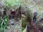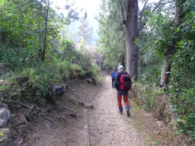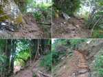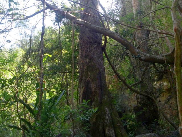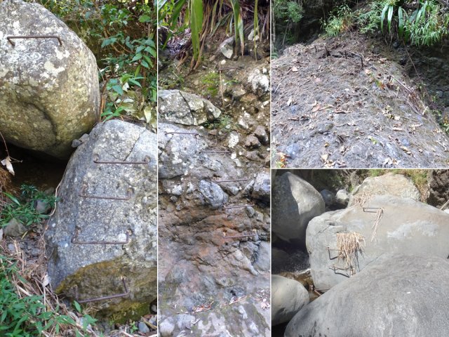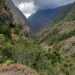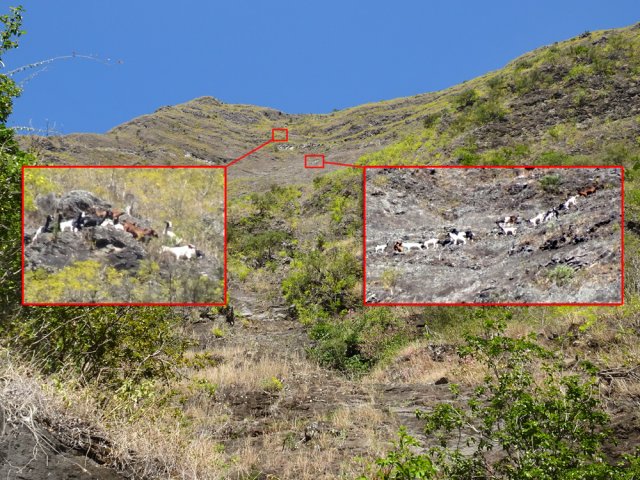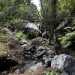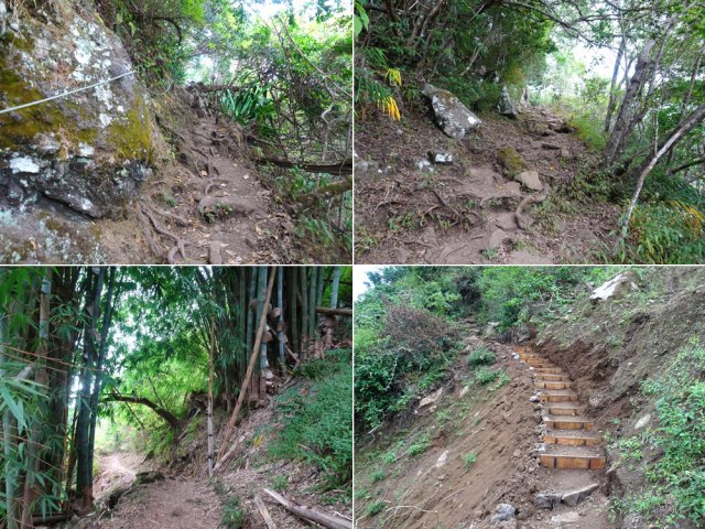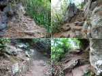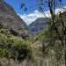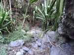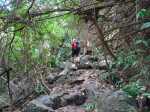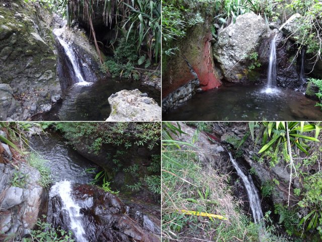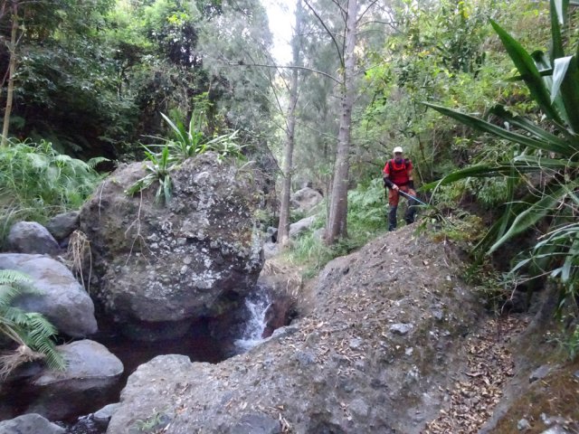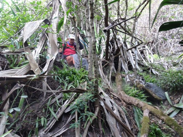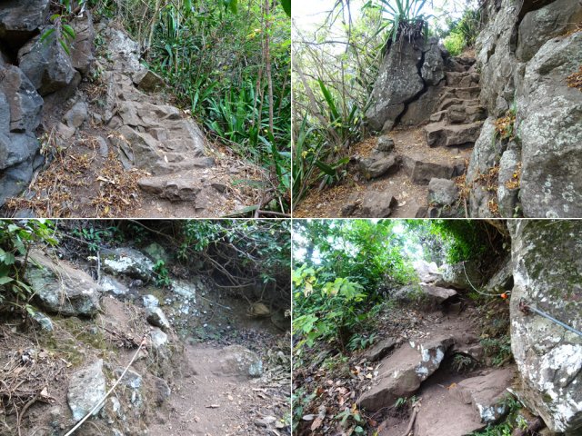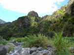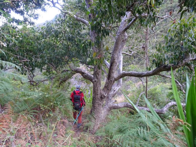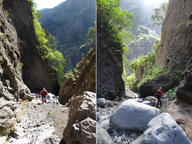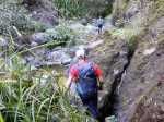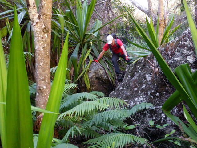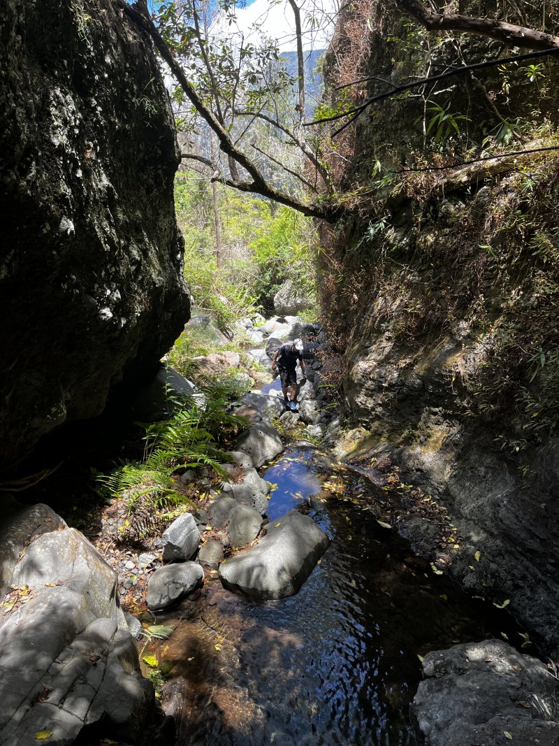 La randonnée débute au cœur de l'îlet d'Aurère situé à 950 m d'altitude où de nombreux gîtes accueillent les randonneurs de passage. Rejoindre l'épicerie par une des voies principales bordée de filaos (Photo 1). Après le petit déjeuner, on croise de nombreux groupes partant dans toutes les directions. Le soleil n'éclaire pas encore les habitations mais fait bien ressortir les plus hauts sommets (Photo 2). Partir plein nord et marcher en direction de la Réserve et du sentier Augustave. Comme souvent sur l'île, de magnifiques poteaux de l'ONF annoncent la destination et le temps nécessaire mais, tout près, d'autres en interdisent l'accès (Photo 3). Prendre donc ses responsabilités pour poursuivre sachant que cet itinéraire ne sera sans doute jamais réhabilité. Le sentier est superbe, bien entretenu et la progression laisse imaginer qu'on est effectivement parti pour 2h55 jusqu'à Deux Bras (Photo 4). Entretenu par les propriétaires de parcelles, il est emprunté quotidiennement. Parvenu au dernier verger, on comprend très vite que c'en est fini de la belle trace. Il faut longer la clôture de ce dernier dans les galaberts qui auront tôt fait d'envahir totalement le passage (Photo 5). La portion mal entretenue est très courte et l'on retrouve rapidement des morceaux du sentier historique. Admirer, avant d'entamer la descente, le sommet du Piton Cabris déjà noyé de soleil alors que l'ombre subsistera encore longtemps dans la profonde vallée (Photo 6). On embrasse du regard toute l'aventure à venir pour atteindre le fond de la vallée et le pied de la Crête de la Marianne pour retrouver le Bras de Ste-Suzanne (Photo 7). Le sentier, qui comporte encore de belles portions de marches, est vertigineux et glissant sur les portions sableuses (Photo 8). Les fougères se sont implantées sur des crêtes plus plates et peuvent vite créer des barrages végétaux, heureusement marqués par des traces de passage (Photo 9). Plus bas, en s'approchant de la falaise de gauche, on remarque le sentier emporté par un éboulis. Un autre sentier sommaire créé par les braconniers plonge en direction du Bras des Merles. C'est le plus souvent sur les fesses que se franchira ce passage entre chocas et arbres bien utiles pour ralentir la descente (Photo 10). On parvient rapidement à une petite cascade et son bassin d'eau claire. Il y en aura bien d'autres durant la descente (Photo 11). Comme le sentier n'est pas toujours facile à trouver ou à suivre, il est préférable d'entreprendre la descente au plus près du petit torrent. Quelques passages un peu techniques demandent plus d'attention mais ne sont jamais dangereux (Photo 12). Le plus souvent, la marche s'effectue sur les galets et roches de fonds de ravines (Photo 13). Quand on préfère le sentier rencontré à maintes reprises, c'est aussitôt la galère dans les chocas, galaberts et fougères (Photo 14). Deux heures après le départ de La Réserve, on rencontre les premiers barreaux en fer à béton fixés dans les roches pour éviter les glissades (Photo 15). Il y a de plus en plus d'eau dans le bras mais tous les bassins ou petites chutes se contournent aisément (Photo 16). On retrouve ci et là de nouvelles portions de sentier dans les rochers (Photo 17). Ne pas manquer, près de l'eau, après 3 heures de descente, le plus vieux benjoin de l'Île qui doit être multi-centenaire. Son énorme tronc est proche d'un autre benjoin. Ils ont tous les deux résisté aux cyclones et crues et méritent le respect (Photo 18). Poursuivre, toujours au plus près de l'eau. On passe ensuite près d'un énorme rocher puis plus loin sur de longues plaques basaltiques où la marche s'accélère. On sent parfois comme de fortes odeurs de biquettes, sans doute venues boire récemment. Puis, au détour d'un virage donnant de belles vues du le Piton Cabris, on aperçoit deux troupeaux à plus de mille mètres d'altitude. Les chèvres se baladent sur les falaises sans peur de glisser (Photo 19). Déjà très présentes dans tout le cirque, elles semblent apprécier ce lieu beaucoup moins fréquenté ou plus difficile d'accès aux braconniers ! Les barreaux fixés aux rochers se multiplient, signe qu'on est sur le bon itinéraire (Photo 20). Continuer la descente, toujours dans le lit du bras ou en tentant de temps en temps des morceaux de sentier semblant encore en bon état. Hélas, on s'y griffe plus que dans le lit et la progression est lente. Les lianes et chocas se chargent lentement de tout cacher à la vue des randonneurs (Photo 21). Plus de 4 heures après le début de la descente, le bras emprunte un canyon étroit où la marche est aisée en suivant un tuyau (Photo 22). Au confluent avec le Bras de Ste-Suzanne, partir à gauche et continuer à chercher le meilleur passage sur les roches. On peut marcher sans se mouiller les pieds en choisissant son parcours (Photo 23). Les hectares de canne fourragère emportés par les crues de Bélal facilitent grandement la progression mais cela ne durera pas très longtemps (Photo 24). A l'approche de Deux Bras, elles sont encore très présentes et touffues (Photo 25). Ne pas manquer la piste en rive gauche menant à celle empruntée par les taxis de Mafate, sinon, poursuivre par la rivière. Au gué, partir à droite, et se préparer à la prochaine difficulté de la journée. Après 6 heures de descente des deux bras, il faut encore de l'énergie pour affronter la rude montée vers Dos d’Âne. Elle débute dans les pierres de l'îlet Albert (Photo 26). Prendre son temps avec un rythme adapté et le conserver pour franchir sereinement les multiples obstacles du sentier, sécurisés ou non par des câbles (Photo 27). La montée est rude jusqu'à l'échelle. Elle est un peu moins technique après. Les parties plates sont plus nombreuses. L'arrivée à la première touffe de bambous, à l'oratoire puis à l'escalier pour franchir un éboulis signent la fin proche de l'ascension (Photo 28). 