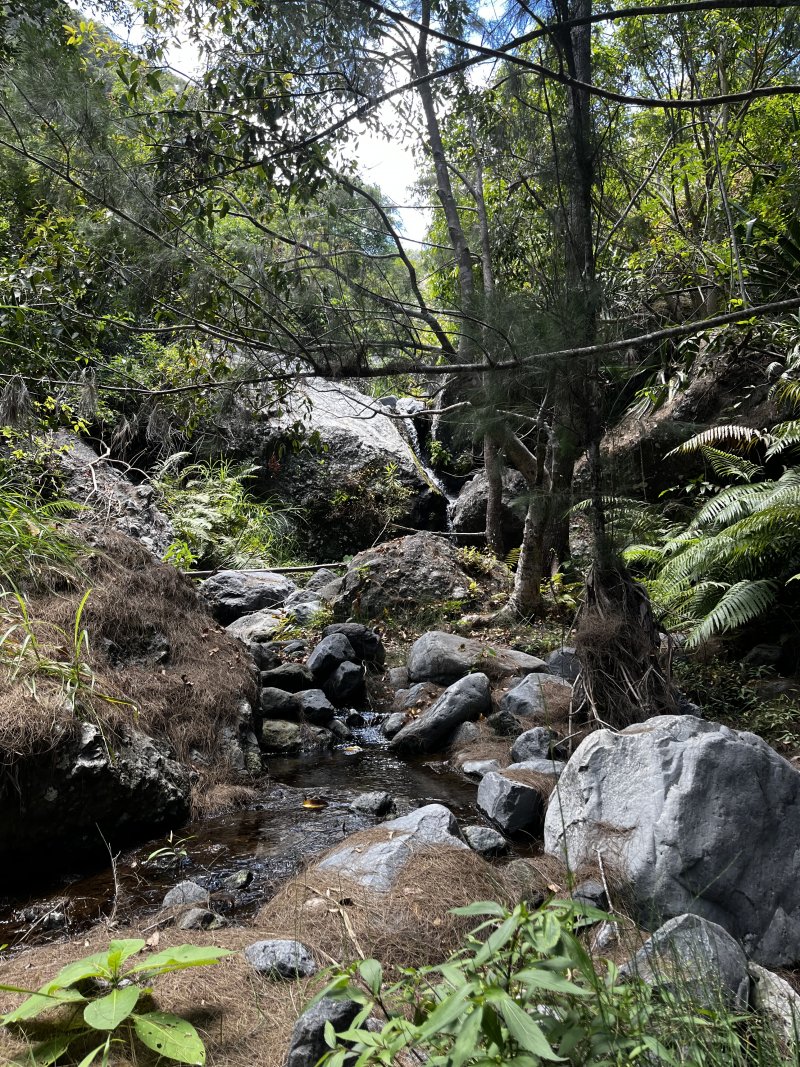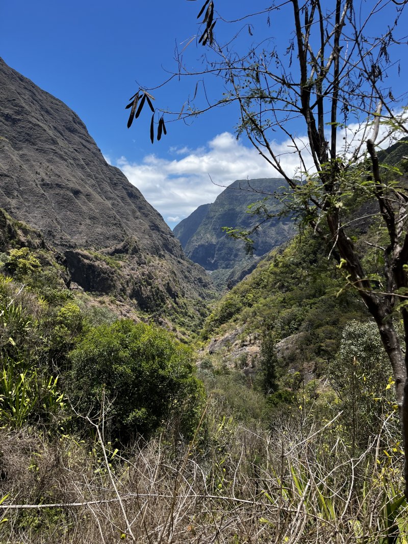 Le Bras des Merles, bien que confiné dans le nord de Mafate, a pourtant abrité l'Îlet Cerneau durant des décennies à l'époque de l'Îlet à Déjeuner ou de l'îlet Natte. De ce lieu de vie, il ne reste que des vestiges de plantations de bananiers et d'ananas. Encore appelé le Jardin par les habitants d'Aurère, il devient presque impossible de s'y rendre en raison de la couverture des lianes papillon et autres invasives. Une bonne partie de la vallée abrite encore des essences rares appartenant aux forêts originelles de moyenne altitude. L'ONF entreprend régulièrement des défrichages et des inventaires afin de préserver cette flore unique de la Réserve Biologique du Bras des Merles. On passe assez près d'un héliport sommaire et de zones délimitées de surveillance des espèces endémiques. Il est vivement conseillé de ne toucher à rien ou d’éviter ces zones afin de respecter ces plantes parfois en voie critique d'extinction. Le sentier qui longeait la ravine a subi des éboulis et des envahissements de végétaux. La progression y est beaucoup plus lente mais on trouve toujours son chemin ainsi que les traces de peinture blanche et les restes d'échelles fixées aux roches pour escalader. La boucle du tour de la Crête d'Aurère est désormais très difficile à réaliser en une journée, aussi cette fiche ne propose-t elle que la descente et la remontée à Dos d’Âne. La partie longeant le Bras de Sainte-Suzanne a également subi de nombreuses modifications suite au passage du cyclone Bélal début 2024. Il est plus facile actuellement de longer au plus près le lit du bras que de chercher le sentier. Pour effectuer la boucle complète, se référer à la randonnée de Dos d’Âne à Aurère.