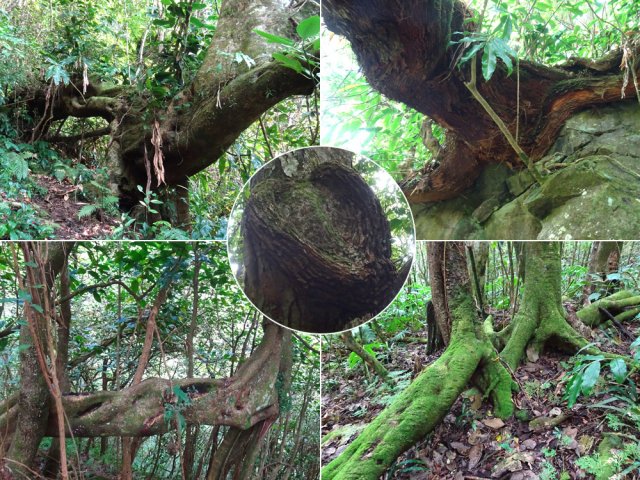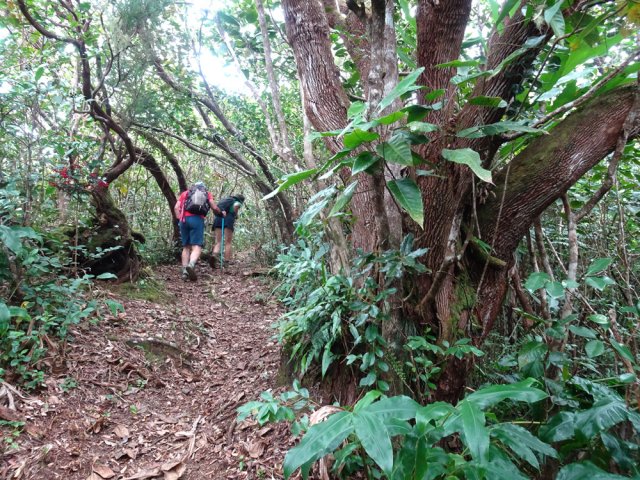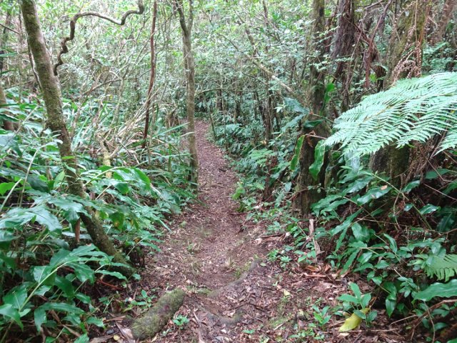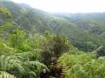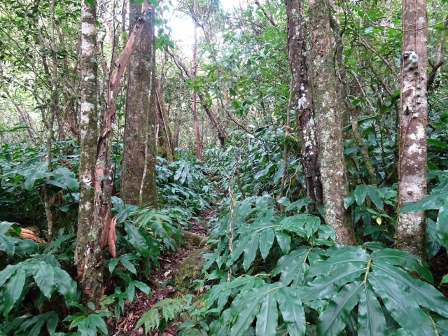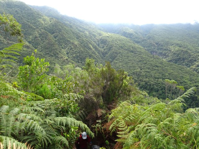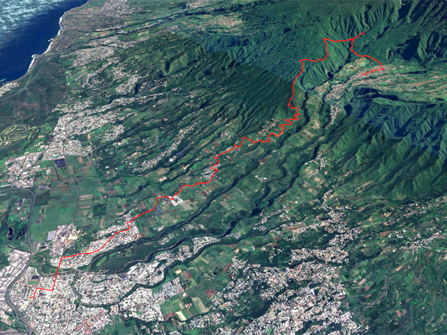 La randonnée débute ici à l'arrêt de bus de la ligne 24 venant de Saint-Louis. Rejoindre l'église et entamer la première montée de la journée en empruntant le Rue Paul Hermann (Photo 1). On peut également prendre les deux autres rues qui lui sont parallèles. En haut de la côté, bifurquer à gauche sur l'allée étroite qui descend entre les jardins, habitations et salon de coiffure (Photo 2). Poursuivre plus loin en direction du Bras du Mouchoir Gris que l'on traverse facilement. On se retrouve très vite face à un croisement de trois sentiers, tous en direction de la magnifique forêt de Bon Accueil. Laisser le premier et emprunter le second pour se rapprocher du grand affouche si on ne l'a jamais vu. Dans le cas contraire, le troisième sentier est plus court et plus direct pour atteindre le départ du Sentier du Malabar Mort. Le sentier botanique est toujours aussi bien entretenu et s'effectue facilement. Après avoir rejoint la piste et repéré le poteau de l'ONF annonçant que le sentier est difficile, poursuivre dans la belle forêt jusqu'au premier croisement (Photo 3). Entamer ensuite la difficulté de la journée, d'abord facilement jusqu'à une première ravine à traverser. Très vite, les premières marches se présentent sur des pentes encore raisonnables où l'ascension est facilitée par des marches et des échelles (Photo 4). Des rambardes de bonne qualité ont été également installées. D'autres échelles permettent, un peu plus loin, de franchir les barres rocheuses. Le sentier traverse la Ravine de Bellevue en partant sur la droite. Il est possible de se rapprocher de la profonde cavité abritant un bassin difficile à distinguer sans risque (Photo 5). La sortie de la ravine s'effectue sur une pente sérieuse encombrée de racines. On rencontre de plus en plus de gros arbres aux formes biscornues (Photo 6). Il y en aura bien d'autres tout au long du parcours jusqu'à la Pièce Jeanne (Photo 7). On retrouve des échelles avant de marcher sur une courte portion assez plate envahie de longoses (Photo 8). On s'approche de la vallée profonde du Bras du Malabar Mort. La pente s'accentue et on apprécie de nouvelles échelles (Photo 9). La fin de la descente est tout aussi raide (Photo 10). Le sentier du Malabar Mort se poursuit en rive droite mais il est tentant de remonter le cours de la ravine afin d'atteindre la cascade 400 m en amont. La marche est assez aisée si les roches sont sèches. Attention cependant aux glissades sur la mousse. Le bras ne coule pas, ce qui facilite grandement la remontée (Photo 11). Il faut près de 30 minutes pour atteindre le cassé sauvage d'où coule un léger filet d'eau (Photo 12). Même sans eau le lieu est unique avec sa falaise verticale et son cul de sac recouvert de mousse. Il vaut mieux venir après quelques pluies qui doivent grossir la cascade remplissant son bassin (Photo 13). Faire demi-tour et rejoindre, à la même vitesse, le sentier et ses échelles pour entamer les 250 derniers mètres de l'ascension qui débute aussitôt à travers la forêt (Photo 14). Elle est toujours aussi belle et le sentier bien marqué. Il faut encore passer quelques petites ravines à sec, obligeant à de nouvelles descentes suivies de fortes remontées où les mains sont très souvent utiles (Photo 15). Les longoses poussent par endroits un peu plus qu'ailleurs, rendant difficile une incursion en forêt (Photo 16). A partir de 1200 m, elles cessent pour être remplacées par les fougères et les branles (Photo 17). On a souvent l'occasion d'observer la forêt qu'on vient de traverser et d'en apprécier le relief (Photo 18). Le dernier coup de rein de 50 m comporte plusieurs tronçons avec des marches creusées dans la terre rouge et glissante (Photo 19). La délivrance arrive enfin à la vue du poteau de l'ONF annonçant la Pièce Jeanne pour une même durée de marche que pour le Malabar Mort (Photo 20). Prendre à gauche et entamer la longue descente vers ce village isolé proche de la Route Hubert Delisle. On retrouve les sous-bois, les beaux arbres, les longoses et un sentier très bien entretenu (Photo 21). La pente est assez douce au début sous les nombreux bois de perroquet peuplant l'arête (Photo 22). Le sentier oblique sur la droite pour franchir quelques discrets affluents de la Ravine de Bellevue. Il faut descendre fortement puis remonter pour les passer (Photo 23). Le sentier oblique ensuite vers la gauche au moment de la rencontre avec celui de Grand Case qui débute dans les touffes de tibouchinas. Après un plateau où poussent de magnifiques bois de remparts, il reprend la descente sur un nouveau rein (Photo 24). De nombreuses petites orchidées poussent au sol et sur les troncs morts. On a de plus en plus de panoramas allant du Tampon jusqu'à Saint-Leu (Photo 25). La descente se termine par une longue portion bien marquée par les pneus de vélos et motos dans une mer de goyaviers (Photo 26). Il est même réduit par endroits à une étroite rigole créée par les engins lancés à toute allure. Il se termine sans transition à une piste bordée de tôles et grillages abritant un élevage. C'en est fini des sentiers. Après un court tronçon de piste on atteint la petite route en lacets qui contourne le hameau de la Pièce Jeanne en offrant constamment de beaux points de vue en direction du littoral (Photo 27). Aucune circulation sur ce bout de route calme bordée de bananiers, capucines et canne à sucre. Une fois la RD3 atteinte, se poser la question de savoir comment s'effectuera le retour à Saint-Louis. En cas de fatigue ou d'allergie aux circuits goudronnés, attendre le bus 23 au premier arrêt rencontré. Sinon, entamer la partie la moins passionnante de la journée en descendant routes et rues menant à Camp du Gol à travers la campagne. Comme toujours, il y a souvent quelque chose à voir pour agrémenter la descente. C'est le cas de ce monstrueux kapokier, du camion-case, du temple, des plantations