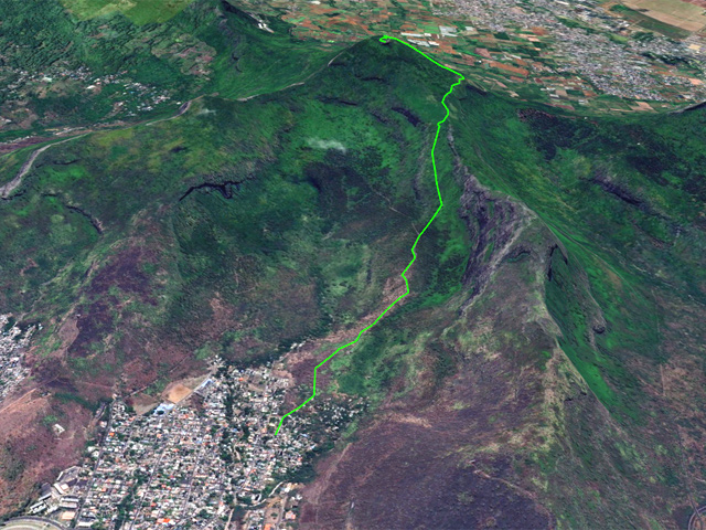 La randonnée débute au quartier Bangladesh. Stationner aux alentours de Pouce Street puis rejoindre à pied le début du parcours en frôlant quelques modestes cases (Photo 1). Une fois cette première centaine de mètres peu incitatifs, on se retrouve sur un chemin grimpant en pente douce en direction du Pouce sous quelques grands arbres (Photo 2). Les roches sont peintes en blanc pour confirmer le bon itinéraire. Le manque d'entretien par endroits a facilité l'implantation de grandes herbes et autres plantes. On longe la chaîne du Snail Rock sur la droite. Jamais la montée n'est difficile (Photo 3). Après une vingtaine de minutes, on parvient à une bifurcation marquée par quelques panneaux qui indiquent distances et temps de marche (Photo 4). Prendre à droite du panneau et délaisser le sentier de gauche. La montée au Pouce débute dans des sous-bois très touffus envahis de lianes papillon assombrissant fortement le parcours (Photo 5). Ces lianes sont si touffues qu'il est impossible d'y repérer un sentier qui les traverserait. La marche s'effectue sur des lits de feuilles mortes en évitant les pierres et roches encombrant le sentier (Photo 6). Il n'y a pas à réfléchir pour trouver son chemin. La montée est régulière entre de hautes haies de lianes et des bosquets de goyaviers (Photo 7). Une demi-heure après la bifurcation, le chemin s'éclaire en arrivant aux premières clairières. On aperçoit enfin l'horizon et les pitons entourant Port Louis (Photo 8). Le sentier oblique sur la droite. Le sol est désormais recouvert de longoses à perte de vue. On ne les quittera guère jusqu'au sommet (Photo 9). La suite de la montée est facile dans une végétation qui a changé. Les palmiers se multiplient et les califons bordent le sentier parfois humide (Photo 10). On a gagné en altitude donc en panoramas sur les montagnes et villes du centre (Photo 11). On s'est élevé de 500 m depuis le départ et la ville de Port Louis a rapetissé (Photo 12). On s'approche très vite du sentier le plus utilisé depuis Moka. Le Pouce est désormais bien visible au-dessus des longoses (Photo 13). Fini l'étroit sentier, humide ou caillouteux. On entame cette dernière montée sur un large parcours usé par les dizaines de marcheurs quotidiens (Photo 14). Quelques promontoires rocheux du côté de Moka permettent d'apercevoir le parking et de mieux comprendre pourquoi les randonneurs sont plus nombreux à venir de là, la distance est plus courte (Photo 15). Par beau temps, profiter des vues dégagées sur une bonne partie de l'île (Photo 16). Tout en repérant le prochain promontoire, repartir à l'assaut du Pouce en longeant la falaise (Photo 17). La montée s'intensifie légèrement. De nouveaux sentiers parallèles ont été créés lorsque l'affluence est forte (Photo 18). La profondeur de la terre creusée témoigne de l'intérêt que portent les randonneurs à ce sommet (Photo 19). On voit de mieux en mieux les grimpeurs sur l'arête (Photo 20). Ne pas manquer la longue chaine montagneuse qui abrite le très caractéristique Pieter Both (Photo 21). Après un dernier petit plateau donnant sur le nord, entamer la montée dans les longoses et goyaviers (Photo 22). Très vite, on parvient à de véritables murs, parfois glissants. Il faut s'aider des mains pour les franchir (Photo 23 et 24). Sur la droite, une grande forêt abrite des singes. Ne pas hésiter à observer la cime des arbres pour tenter de découvrir les macaques crabiers qui se délectent des fruits (Photo 25). La fin de l'ascension est tout aussi éprouvante, surtout pour les randonneurs occasionnels (Photo 26). Une fois au sommet, les difficultés prennent fin, du moins pour un temps. On peut à loisir observer les points caractéristiques de l'Île Maurice,  même si aucune table d'orientation n'y est installée (Photo 27). Le sommet est encombré de roches mais assez plat pour ne courir aucun risque (Photo 28). Entreprendre la descente par le même sentier en prenant garde aux parties verticales et humides. Si un véhicule a été prévu à Moka, il est possible d'y redescendre une fois atteint le croisement. Sinon, reprendre l'itinéraire emprunté à l'aller et regagner le quartier de Bangladesh.