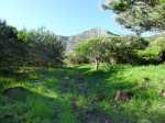 La randonnée débute à un parking d'une dizaine d'emplacements avant la chaîne barrant le passage vers la route. Un panneau schématise les circuits possibles avec quelques explications. Sur le côté quelques modules sont utilisés par les sportifs en début ou fin d'entraînement. Trouver le sentier qui commence près des toilettes en direction de la ville (Photo 1). Il est un peu encombré de plantes mais encore utilisé par les habitants pour éviter de marcher longuement dans les rues. La carte en main, partir à gauche sur Cremation Groung Street puis rejoindre le départ du circuit en direction du Pouce en traversant des quartiers populaires. Les vues sur la montagne permettent de reconnaître le Snail Rock ou, plus à gauche, Le Pouce souvent dans les nuages au petit matin (Photo 2). Quelques cases très modestes ou abandonnées, bordées de détritus, longent le début de la montée confirmée par quelques taches de peinture blanche sur les rochers. La pente est faible sur ce qui fut une piste désormais inutilisée et envahie par quelques herbes (Photo 3). Les arbres ne cachent pas totalement les sommets dont Le Pouce dont on prend la direction (Photo 4). La piste droite est facile à suivre malgré les herbes (Photo 5). La marche se rapproche du pied de la haute falaise du Snail Rock qu'on devine dans les trouées (Photo 6). La piste est petit à petit remplacée par un sentier envahi de lianes papillon qui poussent en très grandes quantités durant la montée au Pouce (Photo 7). 30 minutes après les cases du départ, on parvient à un croisement avec des panneaux indiquant les distances et temps vers diverses destinations. Délaisser le sentier de droite et emprunter celui de gauche (Photo 8). Le sentier est d'abord assez plat dans les lianes, heureusement taillées régulièrement (Photo 9). On retrouve des traces de l'ancienne piste qui servait pour les cultures au siècle précédent (Photo 10). Impossible de s'égarer tant les lianes poussent dru et envahissent les arbres qui meurent en quelques années (Photo 11). On ne quitte plus cette piste pavée souvent de bonne qualité. Il subsiste même des travaux de soutènement ou d'évitement de ravines (Photo 12). Le parcours traverse de plus en plus de belles forêts. Les lianes diminuent par endroits. Les eucalyptus deviennent plus nombreux que les autres arbres (Photo 13). Ils sont remplacés plus loin par les poiriers marrons (Tabebuia heterophylla) qui atteignent par endroit des tailles imposantes. Profiter des dernières portions plates sur cette trace mi-sentier, mi-piste (Photo 14). Une descente débute. De grandes ornières creusées par les crues et fortes pluies ont abîmé la piste qu'on arrive cependant à suivre en prenant garde à la glissade. Certaines ornières approchent les deux mètres de profondeur. La remise en état de la piste est difficilement envisageable sans d'énormes investissements. La descente est bordée cette fois de nombreux palmiers dont les fruits doivent attirer les singes (Photo 15). On retrouve également les manguiers en bordure de sentiers qui confirment que la zone était cultivée (Photo 16). On parvient un peu plus loin à une grande clairière d'où l'on peut apercevoir des quartiers de Port Louis (Photo 17). On retrouve les flancs du Snail Rock que l'on suivait de plus près dans la montée (Photo 18). Partir sur la droite. Escalader quelques branches tombées sur le sol et parvenir à un nouveau verger de manguiers (Photo 19). On arrive ainsi au croisement de la petite boucle de Dauguet. Un panneau sur la gauche indique plusieurs directions (Le Dauguet, Le Pouce et Moka Range Chalenge). Très près, le kiosque attend les rares pique-niqueurs obligés de porter longuement leur nourriture sur le dos (Photo 20). Près du kiosque une esplanade permet de faire demi-tour aux véhicules autorisés (Photo 21). Un grand figuier étrangleur en marque le début (Photo 22). On devine un peu plus loin un temple sous de grands arbres. Les offrandes, sous forme de nourriture et surtout de fruits, attirent une trentaine de macaques crabiers peu farouches (Photo 23). On reste sous des manguiers tortueux mais on ne pourra pas cueillir de fruit depuis longtemps consommés par les primates (Photo 24). La piste s'élargit de nouveau et il faut éviter les pierres qui dépassent (Photo 25). Par moments, des cactées ont envahi la cime des arbres allant jusqu'à faire craquer les branches sous leur poids (Photo 26). La fin de la piste devient une promenade reposante dans la belle forêt, sur un sol plus sableux, totalement plat (Photo 27). Elle reste plate jusqu'à l'eucalyptus planté au croisement des sentiers de la petite boucle de Dauguet (Photo 28). Encore quelques mètres de piste et on arrive sur la route goudronnée bordée de nombreuses barrières en bois menant au parking du départ de cette grande boucle de Dauguet.