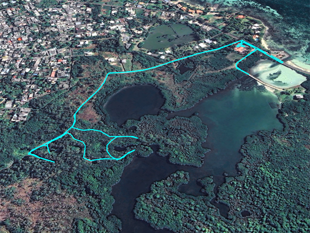 La randonnée débute près de l'église. Avant de stationner, repérer sur la carte la grotte Madame à l'entrée du village. On descend à la grotte remplie d'eau par des escaliers, pour une visite rafraichissante si des courageux osent s'y baigner (Photo 1). Après la visite et le stationnement près de l'église, marcher un peu sur la B15 pour profiter des jolies vues sur la baie (Photo 2). La visite de l'église est possible lorsque le portail est ouvert aux heures fixées. Le petit bâtiment récent est sous quelques filaos (Photo 3). Côté lagune, on remarque une route qui traverse l'étendue d'eau (Photo 4). Elle mène à une propriété bordée de cocotiers (Photo 5). En empruntant la piste entre lagune et église, on peut se rapprocher de cette route traversante à l'ombre de quelques arbres (Photo 7). Aucun panneau d'interdiction n'empêche de se rapprocher des cocotiers mais il est plus respectueux d'en rester éloigné et de faire demi-tour une fois sur le pont (Photo 8). Revenir à l'église et emprunter la piste qui la longe. C'est une des rares parties de la randonnée qui se trouve à l'ombre (Photo 9). Après le mur d'enceinte d'une propriété, on se retrouve dans une savane peuplée de quelques faux poivriers (Photo 10). Aucune difficulté pour suivre le sentier, plus fréquenté par les jeunes du quartier que par les randonneurs (Photo 11). La marche s'effectue totalement à plat, sans effort hormis la chaleur. On parvient à quelques eucalyptus (Photo 12). Prendre à gauche à la première bifurcation et marcher sous le couvert des arbres. On parvient très vite au premier bassin d'eau sombre (Photo 13). La baignade n'y est pas très tentante même si le bassin est fréquenté. Il n'y a pas de plage et l'accès est assez difficile dans la végétation (Photo 14). En poursuivant par le sentier et en se baissant un peu pour éviter les branches, on parvient de l'autre côté de la grande lagune aperçue depuis la route (Photo 15). Faire demi-tour et reprendre la progression. On remarque très vite des murs en ruine derrière les lianes et arbustes épineux (Photo 16). En cherchant un peu, on repère très vite les sentiers créés par les curieux, amateurs de ruines. On repère cette fois la fenêtre d'une grande tour (Photo 17). Il s'agit d'un four à chaux dont on peut également s'approcher en passant par cette fenêtre. L'intérieur dévoile une architecture de pierres de laves taillées, remarquablement conservées (Photo 18). On peut pénétrer dans ce four, en sortir par la porte et remarquer l'incroyable épaisseur destinée à conserver la chaleur élevée dans le four (Photo 19). Une deuxième tour se dresse tout près. On peut cette fois y pénétrer par la porte, tout aussi épaisse que la précédente (Photo 20). Les milliers de degrés accumulés durant les années d'exploitation ont un peu plus abîmé la structure mais l'ensemble est assez solide pour envisager une remise en état (Photo 21). La fenêtre est ici plus difficile d'accès et impose de ressortir par le bas (Photo 22). Continuer l'exploration et repérer les tours en s'en éloignant (Photo 23). Le bruit que font les jeunes ou les engins garés sur le côté évitent de trop chercher son chemin. On tombe sur un nouveau trou d'eau mais également trop encombré de taros pour envisager une trempette (Photo 24). Tout près, le plus connu et le plus fréquenté est rempli d'une eau plus claire qui incite à la baignade (Photo 25). En cherchant un peu dans les parages on a vite fait de découvrir de nouveaux trous d'eau, souvent très envahis de toutes sortes de plantes aquatiques (Photo 26). L'endroit abrite soit-disant une grotte. En demandant aux jeunes, ils indiquent aussitôt un chemin empierré et conseillent de marcher jusqu'au bout (Photo 27). La grotte s'avère n'être qu'un oratoire dédié à la Vierge au fond de sa niche bleue. Cette allusion à Lourdes a certainement donné le nom de grotte au petit édifice (Photo 28). Le chemin se poursuit en direction du village mais les trous d'eaux caractéristiques ont tous été aperçus. On peut donc faire demi-tour par le chemin le plus direct pour revenir au véhicule avant de se rendre, ou non, aux 6 entrées de Princess Margaret Cave, à condition d'être équipé de lumière.
