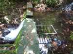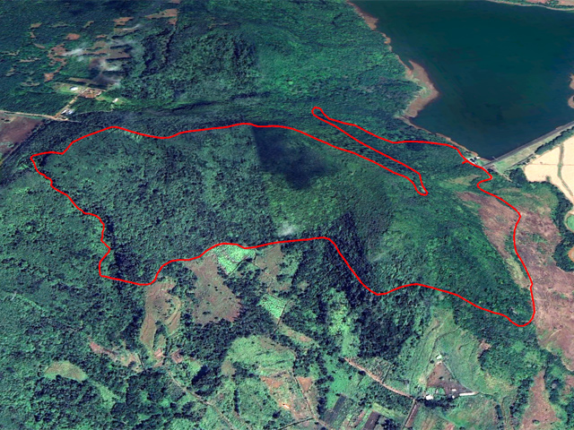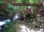 La randonnée débute au réservoir de la Nicolière. Visiter les installations et les abords avant de se lancer dans cette courte aventure. Voir si nécessaire la fiche sur la première partie de cette boucle. La marche s'effectue totalement à plat le long du canal alimentant le réservoir. On le longe parfois lorsqu'il n'est pas couvert de béton (Photo 1). Cette promenade n'est pas assez difficile pour préparer la remontée sportive du torrent et de ses cascades (Photo 2). Après 2 kilomètres de promenade, on parvient à une passerelle canal enjambant une ravine, affluent de la Rivière des Remparts. Le Jamblon Bridge débute sous les jamrosats bordant la ravine (Photo 3). Son franchissement comporte quelques risques si les jambes flageolent. Prendre garde là où il n'y a plus de rambarde et éviter même de s'appuyer sur celle en place (Photo 4). De l'autre côté, poursuivre un peu le long du canal jusqu'à ce que celui-ci oblique à gauche. Trouver dans le sous-bois un petit sentier discret partant sur la droite. Peu fréquenté, il est cependant facile à deviner. On parvient en quelques minutes au ruisseau où l'on rencontre les premiers captages (Photo 5). Rester au plus près de l'eau et rejoindre la première chute de la montée. Elle fait moins de 10 m et ne possède pas de bassin. Pas de sentier pour la contourner. Il faut repérer la corde en rive gauche et se hisser à la force des bras (Photo 6). On tombe immédiatement sur une autre chute se contournant en rive droite (Photo 7). La trace sur la berge est discrète mais on peut toujours la suivre à l'instinct. Elle mène à une troisième petite cascade protégée par un arbre qui empêche de s'en approcher facilement (Photo 8). Le contournement, toujours en rive droite, passe entre d'énormes lianes papillon qui obligent à se contorsionner en prenant garde à ne pas glisser vers la cascade (Photo 9). Plus haut, la prochaine est un haut toboggan tombant sur des roches basaltiques (Photo 10). Là également, la poursuite vers l'amont est une aventure au milieu des lianes grosses comme des cuisses, sur un sentier glissant et très étroit (Photo 11). La cinquième cascade est assez esthétique, mi-chute, mi-toboggan dont une partie file dans un tuyau de prise d'eau (Photo 12). L’échappatoire est aussi sportive que pour la première. Heureusement une corde permet de passer l'obstacle abrupt (Photo 13). Après un très court cheminement, on arrive à la cascade n°6, aussi discrète que les autres (Photo 14). La prochaine n'est pas comptabilisée puisque c'est l'écoulement d'un petit barrage de recueil (Photo 15). D'anciens barbelés et une porte symbolique, départ d'un sentier d'entretien, indiquent que le lieu fut sans doute protégé à une certaine époque (Photo 16). A partir du barrage, le sentier est difficile à suivre ou disparaît. Poursuivre donc par le torrent, marcher le plus souvent dans l'eau en prenant garde aux roches glissantes (Photo 17). On arrive plus haut sur le seul véritable bassin de la journée où l'eau très fraîche ne rebute pas tous les randonneurs (Photo 18). Après le bassin, on poursuit la montée en direction de la septième chute. Il s'agit en réalité de la source du ruisseau surgissant d'un petit tunnel caché dans la végétation (Photo 19). L'eau est encore plus fraîche que dans le bassin (Photo 20). La montée au petit tunnel est assez acrobatique. Poursuivre vers l'amont en partant sur la droite pour affronter une rude montée sur d'anciens éboulis instables où le pied a vite fait de glisser (Photo 21). Au passage, remarquer la grotte qui doit abriter les singes lors des forts épisodes pluvieux (Photo 22). Après l'éboulis, on retrouve un sentier classique sur les racines et l'on arrive dans une partie boisée (Photo 23). Le sentier, plus fréquenté, permet aux habitants de se rendre à la source et peut-être au bassin (Photo 24). La traversée de la forêt, presque plate, se fait facilement après l’effort de la montée (Photo 25). On entend passer les véhicules sur la B49 et on quitte bientôt le couvert des arbres (Photo 26). La circulation est variable en fonction des jours de la semaine. Prendre à droite et entamer la longue descente des deux lacets sur une large route, agréable dans la belle forêt (Photo 27). Il n'y a pas de raccourcis pour rejoindre la route en coupant les lacets. La descente se termine dans un véritable tunnel végétal créé par les jamrosats penchés (Photo 28). On rejoint le parking où des vendeurs proposent rafraîchissements et fruits afin de terminer cette boucle sereinement et oublier les efforts de la montée de ravine.