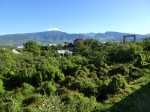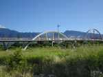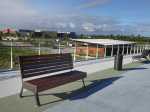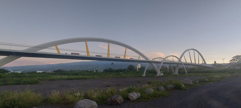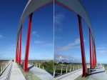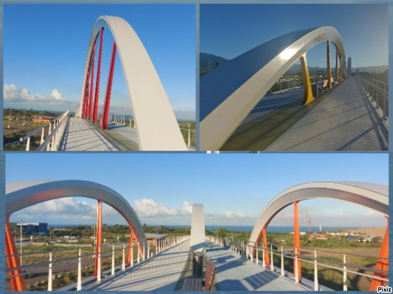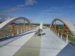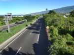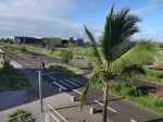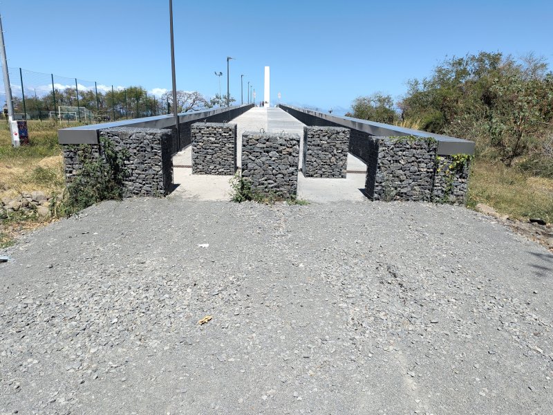 La randonnée pour personnes à mobilité réduite débute à la nouvelle gare routière où un grand parking provisoire attend d'être aménagé dans les projets d'urbanisation futurs. Dès le départ, on a sous les yeux l'ensemble de l'ouvrage dont les arches arrondies rappellent les roues dentées de l'usine (Photo 1). Se rapprocher de la nouvelle gare bordée d'allées paysagères (Photo 2). La contourner ou la traverser si elle est ouverte puis se diriger vers l'autre bâtiment qui comporte l'ascenseur, les rampes ou l'escalier donnant accès au tablier (Photo 3). Une fois atteint, partir vers le fond en direction de la mer pour profiter du balcon aménagé (Photo 4). Quelques bancs permettent aux sportifs de se reposer (Photo 5). Le large balcon domine ce qui sera un jour une zone artisanale (Photo 6). Pour le moment, seul le grand cinéma borde la large voie dédiée principalement aux transports en commun (Photo 7). Partir en direction de Pierrefonds. De nouveaux bancs attendent les curieux (Photo 8). Les amateurs d'architecture moderne apprécieront les arches construites au milieu du tablier (Photo 9). Actuellement aucun bâtiment ou magasin car la plupart des terrains sont pour l'instant en friche (Photo 10). L'ouvrage, très large, accueille deux bandes pour les cyclistes et les coureurs (Photo 11). Comme le pont est élevé, on bénéficie de magnifiques panoramas en direction des plus hauts sommets de l'île. Le Dimitile, le Grand Bénare et le Gros Morne dominent le Cirque de Cilaos (Photo 12). On arrive rapidement à la très bruyante route nationale où des milliers de véhicules circulent chaque heure (Photo 13). On se trouve alors sur la portion dominant la 4 voies, reconnaissable de loin à sa grande arche rouge, posée à l'époque en un seul tenant par d'énormes grues (Photo 14). Le tablier descend en pente douce en direction de l'usine. Sur la droite, le terrain de sport de Pierrefonds (Photo 15). Le pont se termine par des chicanes et surtout une haute marche pour le moment (Photo 16). Faire demi-tour.