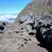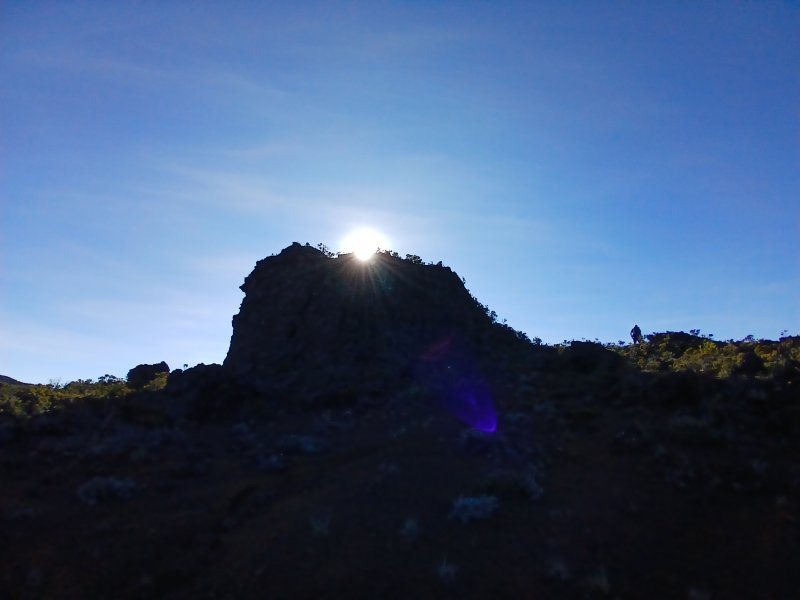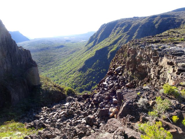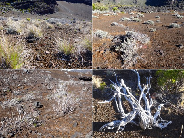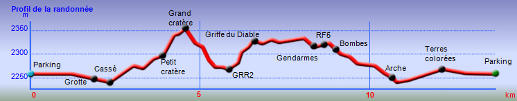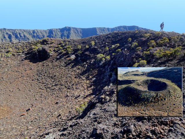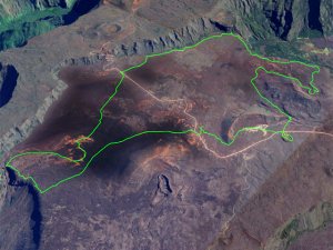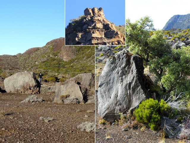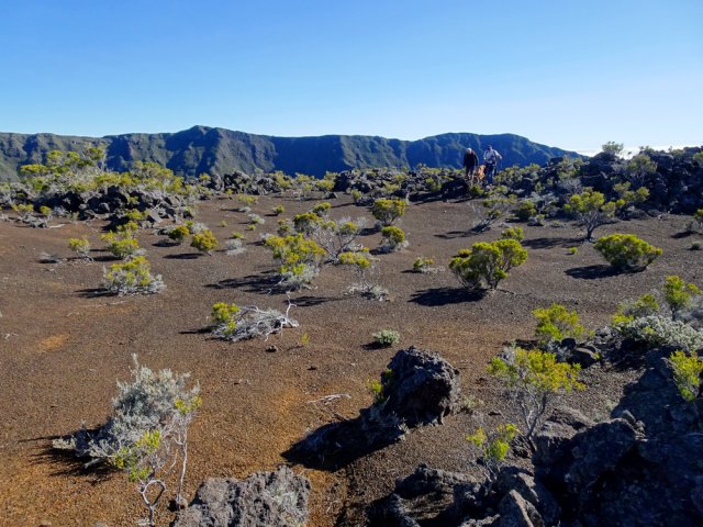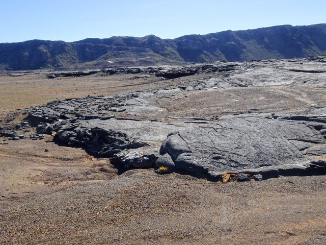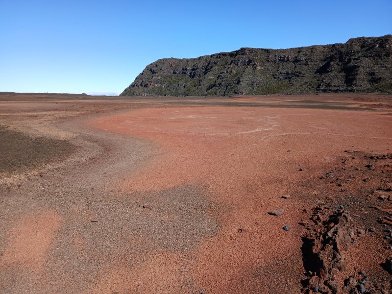 La randonnée débute à la naissance de la Plaine des Sables, à la fin des lacets de la route. Partir plein nord en se rapprochant du Rempart des Sables. Durant l'hiver austral, il est fréquent de commencer à marcher sur le givre qui craque sous le pied avant de fondre très vite aux premiers rayons du soleil (Photo 1). C'est différent avec la glace sur les flaques des ravines ou les cristaux qui soulèvent parfois très haut le sable et les lapilli. Par temps de brouillard, il est également possible d'observer un arc blanc si l'on est situé entre le soleil levant et la brume (Photo 2). La végétation est soit totalement inexistante sur 80% de la plaine, soit se partage entre fétuques, jeunes branles verts ou squelettes d'arbustes morts (Photo 3). En passant au plus près du pied du Rempart des Sables, on traverse à plusieurs reprises des champs de blocs de basalte tombés du haut des falaises encore instables (Photo 4). La plus grande partie de la boucle s'effectue sur un sol très souvent plat sans végétation ou presque (Photo 5). Au passage, repérer le dyke discret dépassant du rempart (Photo 6). Il est loin d'être le plus remarquable de l'île. On rencontre de plus en plus le lit de la Ravine du Piton Rond au fond sableux ou basaltique avant qu'elle se précipite vers le Fond de la Rivière de l'Est. Les laves rencontrées sont très variées. On aura l'occasion, tout au long de la boucle de les voir toutes (Photo 7). Tout près, on distingue quelques orgues basaltiques organisées par couches successives, séparées par des épaisseurs variées de gratons (Photo 8). La ravine devient de plus en plus nette en s'approchant du vide. Sur la rive gauche, un rocher caractéristique esseulé indique l'emplacement de la grotte sous la falaise. Il faut traverser une dizaine de mètres de branles et fleurs jaunes pour rejoindre ce coin de bivouac. Le foyer en pierres est toujours là mais l'endroit semble désormais délaissé (Photo 9). Rejoindre la ravine et atteindre le cassé de la Rivière de l'Est pour de magnifiques vues en direction de la Savane Cimetière et le Fond de la Rivière de l'Est. Attention car la bordure est friable comme le montrent les roches tombées dans le vide (Photo 10). Longer le cassé afin de mieux profiter du Rempart des Basaltes où l'on distingue très bien les couches alternées de basalte et de gratons. Les couches sont apparues après l'effondrement créant la Plaine des Sables il y a 65 000 ans (Photo 11). La partie "aventure" débute au cassé en partant vers l'est. Marcher en direction d'un haut monticule d'une dizaine de mètres très facile à escalader (Photo 12). 15 minutes plus tard, on arrive à de nouveaux blocs qui, comme les gendarmes, ont été poussés par les laves descendant du Piton du Cirque (Photo 13). Du cassé jusqu'au cratère central, la marche se fait à l'instinct sans jamais piétiner une plante, quitte à effectuer des détours de quelques mètres pour les éviter (Photo 14). Après 40 minutes à grimper entre parties sableuses de ravines en formation, affleurements de lave, de gratons, de plantes, on arrive à un ancien cratère qui se remarque à son pourtour de roches empilées. Le centre, désormais ensablé, accueille quelques jeunes branles (Photo 15). En regardant plein sud, on remarque à peine le prochain cratère qui est un des plus originaux de la zone. Ce petit cratère, au centre du plus grand du Piton du Cirque (également nommé Piton Haüy), est plus beau vu du sommet alors que l'on arrive du bas. Après avoir suivi une large bande sableuse, on passe d'abord près d'une longue grotte (Photo 16). Remonter la forte pente glissante pour parvenir sur le bord circulaire du cratère. En faire le tour pour mieux l'apprécier (Photo 17). Repartir à l'ouest et viser une ravine bien nette facile à suivre. Sur le bord, des grottes ont été creusées par l'érosion qui a ôté le sable sous de larges plaques de basalte (Photo 16). On parvient à une concentration de gros blocs à l'emplacement d'une très ancienne éruption. Rejoindre le sentier Josémont Lauret puis poursuivre en direction du col entre le Piton du Cirque et le Demi-Piton. L'endroit se nomme la Griffe du Diable mais aucun monolithe ressemblant à une griffe ne peut y être décelé. Il faut remonter les 20 premiers mètres de la pente du Demi-Piton pour mieux comprendre. Les flancs du Piton du Cirque sont déchirés comme par une monstrueuse patte de dinosaure (Photo 18). Rejoindre ensuite la RF5, la traverser et se diriger vers le piton de scories impossible à manquer à sa couleur rouge. Il a servi de carrière à la fabrication de la route aux 100 000 nids de poules. Remarquer sur la droite un magnifique spot de cendres de Bellecombe dont les strates affichent bien les différentes éruptions explosives (Photo 19). Ce qui reste du piton de scories abandonné par les bulldozers est bien tentant tout près. Son ascension est très facile en repartant sur la gauche et en redescendant par la droite (Photo 20). Quitter le tas de scories puis prendre la direction du Demi-Piton en foulant à nouveau les 4 ha de cendres de Bellecombe pas toujours visibles si recouvertes de lapilli. Contourner le Demi-Piton et obliquer vers les Gendarmes qui sont faciles à repérer car ils dépassent de la plaine vers l'ouest. Les blocs, démantelés du Piton Chisny au XVIe siècle et entraînés vers le bas par les coulées des Cratères Gueules Rouges (Aubert de la Rüe) trônent désormais près de la RF (Photo 21). Traverser la route et contourner cette fois le Piton Chisny par la droite. Entre les flancs du piton et le sentier de Cap Blanc, le sol est jonché de roches de toutes formes et toutes tailles. C'est une majorité de bombes volcaniques entières ou brisées que l'on traverse (Photo 22). Certaines avoisinent la tonne. Le sol, comme depuis 10 km est constitué de lapilli. En y regardant de plus près on distingue de plus en plus de dunites au sol, 