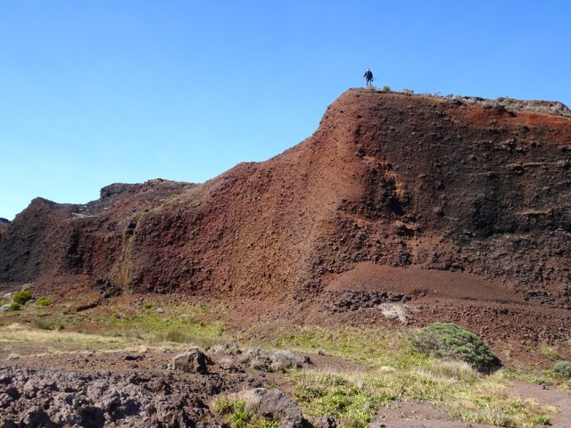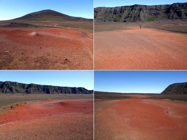 Pour finir, nous quittâmes les sables noirs et les roches grises et déchirées dignes du paysage du Mordor (cf « Le Seigneur des Anneaux ») pour fouler les magnifiques scories rouges de la plaine que j’avais aperçues il y a peu, depuis le Morne Langevin (randonnée 1628).
