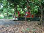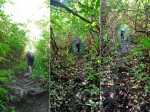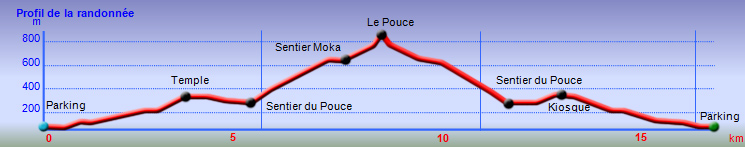 La randonnée débute à un parking d'une dizaine d'emplacements, avant la chaîne barrant le passage vers la route. Un panneau schématise les circuits possibles avec quelques explications. Sur le côté, quelques modules sont utilisés par les sportifs en début ou fin d'entraînement. Franchir la chaîne et entamer la légère montée sur route en frôlant un petit temple (Photo 1). La route permet de s'échauffer sur une légère pente bordée de plus en plus d'arbres et de rambardes en bois (Photo 2). 700 m plus haut, le goudron cesse, remplacé par une large piste caillouteuse (Photo 3). Le chemin se sépare en deux à un eucalyptus pour effectuer la petite boucle de Dauguet. On ne quitte pas la piste toujours aussi caillouteuse (Photo 4). Elle est large, facile en pente faible (Photo 5). Elle traverse une zone où les arbres sont couverts de cactées qui vont jusqu'à briser les branches (Photo 6). Le parcours oblique à gauche avant de reprendre la même direction. Le bord de la piste comporte de plus en plus de manguiers (Photo 7). On rencontre, sur la gauche, un temple sommaire à l'abri de grands arbres (Photo 8). Les singes s'y rendent pour tenter de voler les nombreuses offrandes sous forme de nourriture. En marchant silencieusement on peut les regarder jouer dans les parages. Poursuivre par la piste qui se rétrécit un peu sous de nouveaux manguiers (Photo 9). On frôle un figuier caractéristique et un kiosque qui domine le parcours. La piste se poursuit plein sud en direction du Pouce. Passer ensuite une clairière offrant de beaux points de vue sur Snail Rock (Photo 10) . Poursuivre sur la piste de plus en plus envahie de lianes papillon mais régulièrement entretenue (Photo 11). Plus loin, elle est défoncée par endroits et il faut monter en évitant les ornières glissantes (Photo 12). On rencontre des zones pavées encore bien conservées ou des vestiges de travaux (Photo 13). Le large sentier qui a effectué une boucle vers l'ouest rencontre un panneau indiquant les distances des principales destinations de la zone. Prendre à gauche à ce panneau et entamer la montée au Pouce. Les sous-bois très touffus envahis de lianes papillon assombrissent fortement le parcours (Photo 14). La marche s'effectue sur des lits de feuilles mortes en évitant les pierres et roches qui encombrent le sentier ou quelques parties un peu boueuses (Photo 15). La montée est régulière entre de hautes haies de lianes et des bosquets de goyaviers (Photo 16). Une demi-heure après la bifurcation, le chemin s'éclaire en arrivant aux premières clairières. On aperçoit enfin l'horizon et les pitons entourant Port Louis (Photo 17). Le sentier oblique sur la droite. Le sol est désormais recouvert de longoses à perte de vue (Photo 18). On ne les quittera guère jusqu'au sommet. Le terrain étant plus plat, le sentier est souvent très humide (Photo 19). Profiter des points de vue, même s'ils seront plus vastes une fois au sommet (Photo 20). On voit Pailles et la Pointe aux Sables ainsi que toute les zones urbaines périphériques de Port Louis (Photo 21). La suite de la montée est facile dans une végétation avec des palmiers qui se multiplient et des califons qui bordent le sentier humide. Le sentier, facile à suivre, traverse de grandes étendues herbeuses (Photo 22). On a gagné en altitude donc en panoramas sur les montagnes et villes du centre. On s'approche très vite du sentier le plus utilisé depuis Moka. Le Pouce est désormais bien visible au-dessus des longoses ou, par endroits, des lys orange. (Photo 23). Fini l'étroit sentier, humide et caillouteux. On entame cette dernière montée sur un large parcours usé par les dizaines de marcheurs quotidiens. Par beau temps, profiter des vues dégagées sur une grande partie de l'île. La montée s'intensifie légèrement. De nouveaux sentiers parallèles ont été créés par les passages fréquents. La profondeur de la terre creusée témoigne de l'intérêt que portent les randonneurs à ce sommet qu'on ne quitte plus des yeux (Photo 25). Après un dernier regard sur la plaine de Moka, entamer la partie la plus difficile (Photo 26). Très vite, on parvient à de véritables murs, parfois glissants (Photo 27). Il faut s'aider des mains pour les franchir. La fin de l'ascension est tout aussi éprouvante, surtout pour les randonneurs occasionnels (Photo 28). Du sommet, on peut à loisir observer les points caractéristiques de l'Île Maurice, même si aucune table d'orientation n'y est installée. Le sommet est encombré de roches mais assez plat pour ne courir aucun risque. Entreprendre la descente par le même sentier en prenant garde aux parties verticales et humides. Si un véhicule a été prévu à Moka, il est possible d'y redescendre une fois atteint le croisement. Sinon, reprendre l'itinéraire emprunté à l'aller et regagner le quartier de Tranquebar.