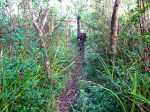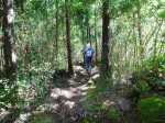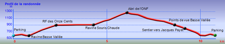 La randonnée débute au parking situé avant l'arrivée au gîte de Basse Vallée. Rejoindre le gîte et poursuivre sur le sentier partant en direction de la Ravine de Basse Vallée. On pénètre dans une magnifique forêt de cryptomerias moussus. Le sentier serpente entre les troncs et quelques roches au sol qui peut s'avérer glissant (Photo 1). On arrive ensuite à une barre rocheuse qui se franchit facilement par une longue échelle (Photo 2). On parvient très vite à la ravine au fond très rocheux qui se traverse longuement en partant tout d'abord vers l'aval avant de remonter un peu pour rechercher le sentier (Photo 3). La montée de près de 150 m débute à l'ombre (Photo 4). Elle est bordée par de beaux arbres penchés au-dessus de la forte pente du rempart (Photo 5). La pente du sentier n'est jamais forte en raison des lacets et la montée peut s'effectuer à un bon rythme (Photo 6). Les lacets se suivent aisément après de longues traversées de la forêt (Photo 7). Le sentier rencontre ensuite celui venant de Foc-Foc en direction de Jacques Payet. Aller à droite à partir du poteau du Parc National. La montée se poursuit mais change totalement de physionomie. Ce sentier est plus large, plus droit et constitué de marches en bois de goyavier (Photo 8). La montée rectiligne se poursuit sur des kilomètres en direction du volcan. Avant de rencontrer la piste forestière, un petit sentier de quelques mètres amène au bord du rempart. La végétation cache le paysage vers le nord mais la Vallée Heureuse et la côte sont bien visibles (Photo 9). Bifurquer à gauche, puis entamer une portion reposante sur la longue Piste Forestière des Onze Cents qui débute par de belles portions herbeuses (Photo 10). Un peu plus loin, après de grandes étendues de pailles sabres, il se rétrécit un moment (Photo 11). Après une clairière assez large, on arrive à la piste qui est un pur plaisir entre goyaviers et bois de couleurs (Photo 12). Ces trois km en pente très légère permettent de reposer les jambes avant d'entamer la deuxième partie de la montée (Photo 13). Après le franchissement de 13 ravines plus ou moins larges avec des vues fréquentes sur la côte, on parvient à une aire aménagée en rive gauche de la Ravine Souris Chaude (Photo 14). S'approcher du radier bétonné qui domine quelques bassins à sec et entamer la montée du sentier bordé de barrières de goyaviers tressés (Photo 15). Quelques mètres plus haut, le bois constitue une agréable aire de repos, voire de bivouac, entourée de la belle forêt (Photo 16). C'est parti pour près de 400 m d'ascension sur un sentier très agréable et assez large pour ne pas être mouillé par la rosée du matin (Photo 17). Les amateurs de nature se régaleront tout au long de la montée avec toutes les plantes variées rencontrées (Photo 18). Du début à la fin, il n'y aura jamais de question à se poser sur la direction. Même quand les fougères et les sabres ont pris possession des abords, le sentier est facile à deviner (Photo 19). Ces petites difficultés ne dépassent pas les 100 m. On retrouve très vite le sentier qui se rapproche souvent des longues rangées de cryptomerias (Photo 20). Hormis une ravine à traverser, la pente ne comporte guère d'écueils (Photo 21). Les seuls inconvénients sont les petites branches de cryptomerias tombées au sol, les sabres ou les fougères et quelques ornières (Photo 22). On frôle également des bois de camphriers qui ont perdu beaucoup de branches lors du Cyclone Garance (Photo 23). Après une heure de montée constante, on débouche sur le large sentier venant du Piton Lardé, à quelques mètres seulement de l'abri de l'ONF (Photo 24). Poursuivre en partant sur la droite. Frôler l'abri et traverser une n-ième forêt de cryptomerias avant de descendre constamment vers Basse Vallée. La forêt de chaque côté empêche tout point de vue (Photo 25). On rencontrera tous les types de sol avec la boue, les passages étroits et glissants, les racines ou les centaines de marches en bois de goyavier (Photo 26). A l'approche de la RF des Onze Cents, un nouveau panorama est possible sur la Vallée Heureuse, vers le nord cette fois (Photo 27). La fin de la descente est une suite ininterrompue de marches et de quelques parties plus plates (Photo 28). Au croisement rencontré le matin en bordure de parc, bifurquer à gauche et reprendre en sens inverse les 15 lacets jusqu'à la Ravine de Basse Vallée. Après le franchissement, on retrouve l'échelle et le sous-bois moussu avant de rejoindre le parking.