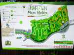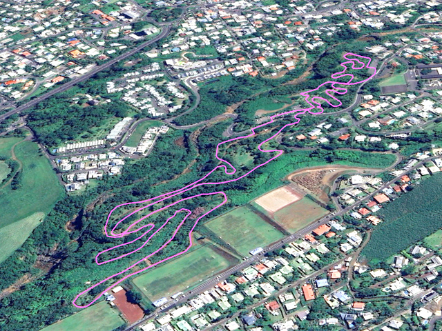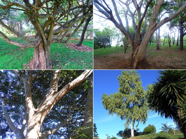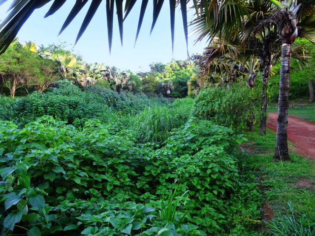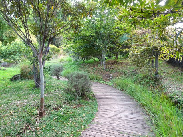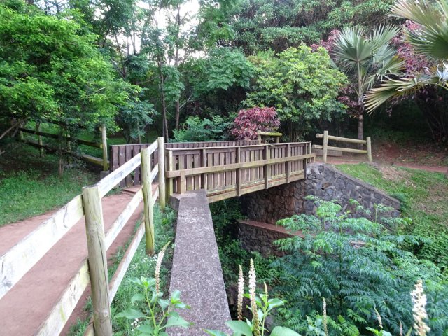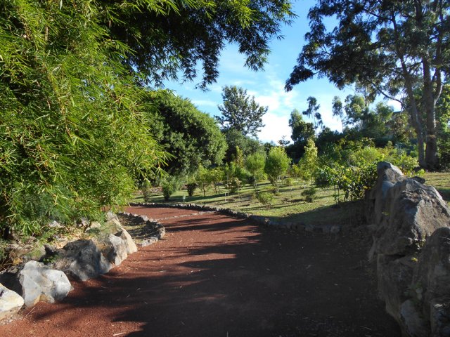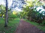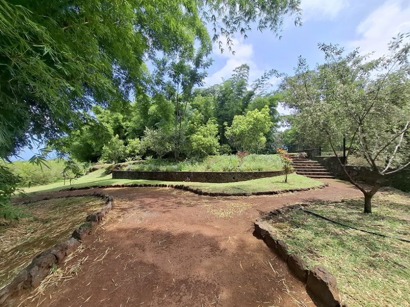 La randonnée débute au parking situé juste entre les deux parcs. Traverser la route et entamer le premier tour en passant devant le panneau d'accueil qui précise que les animaux sont interdits (Photo 1). Bien d'autres panneaux sont installés à l'entrée dont un qui recense quelques variétés d'arbres plantés autour des allées (Photo 2). Débuter par l'allée la plus proche de la Rivière d'Abord. On y rencontre déjà de nombreuses essences de bonne taille (Photo 3). En ouvrant l'œil, on en croisera d'autres qui étaient plantées bien avant l'installation du parcours de santé (Photo 4). On devine souvent la petite vallée de la Rivière d'Abord sur la droite. Parfois on a même des vues sur les bassins envahis de végétation, sans apercevoir un seul mètre du vieux sentier (Photo 5). La piste est toujours aussi agréable à l'ombre des palmiers (Photo 6). Tous les 100 m, un panneau donne la distance parcourue depuis l'entrée (Photo 7). Régulièrement, on se retrouve près d'obstacles du parcours mais rares sont les sportifs qui s'y éreintent (Photo 9 et 10). Après quelques lacets, le chemin traverse la petite ravine, affluent de la Rivière d'Abord (Photo 11). Le circuit repart naturellement vers la droite en longeant le talweg également envahi de hautes plantes (Photo 12). La piste monte un peu et frôle plus loin les 3 stades de la Pointe. Depuis les clôtures, on domine le parc boisé dans son ensemble (Photo 13). Il est possible de raccourcir le trajet en empruntant un des escaliers descendant vers la ravine (Photo 14). Un dernier virage emprunte une deuxième passerelle (Photo 15). Les pistes sont tellement rapprochées qu'on repasse à quelques mètres de celles empruntées à l'aller. Le circuit se termine par une pente bétonnée menant vers l'entrée du parc (Photo 16). C'est la seule difficulté de la boucle qui oblige à se pencher un peu vers l'avant. A la saison, les arbres à orchidées fleuris font oublier l'effort (Photo 17). On arrive sous de grands arbres proches d'une pelouse abritant de nombreux appareils de musculation (Photo 18). Plus loin, on s'approche de la route. Emprunter un petit sentier qui permet de rejoindre le Chemin de l’Établissement et le rond-point. Le Parc Marc Rivière débute aussitôt franchi le rond-point. Passer la chicane empêchant le passage des engins et entamer cette deuxième visite de jardin naturel. Une première courte boucle sur caillebotis commence immédiatement sur la droite pour traverser le Jardin des Sens, mais ramène très vite à la piste principale (Photo 19). Comme plus bas, le chemin de terre battue en pente faible longe de belles plantations qui mériteraient un panneau comportant leur nom (Photo 20). Elles existaient il y a quelques années mais ont certainement été vandalisées. On passe près de grosses touffes de bambous plantées bien avant la création du petit parc (Photo 21). On arrive bientôt à un portail fermé le week-end. On peut poursuivre dans le parc sur les pistes toujours aussi sinueuses (Photo 22). Pour éviter de passer deux fois au même endroit, il est possible, au portail, d'emprunter le sentier qui remonte vers le parking. On se retrouve ainsi devant la porte principale comportant un plan des lieux (Photo 24). Partir sur la droite pour passer devant les plantations d'endémiques puis les aromatiques (Photo 25). Plus loin, un alambic et quelques pieds de géranium symbolisent la culture de cette plante odorante. Revenir vers l'entrée et poursuivre sur la piste en traversant les plantes médicinales et quelques autres plantations (Photo 26). Une fois la première grille franchie, afin d'éviter de repasser au même endroit, remonter l'escalier sur la droite et longer la limite du parc. On retrouve des bambous et un sentier qui passe sur des enrochements (Photo 27). On traverse de nouvelles plantations d'endémiques puis le chemin redescend vers l'entrée Sud par un dernier virage (Photo 28). Le parking est à quelques mètres.
