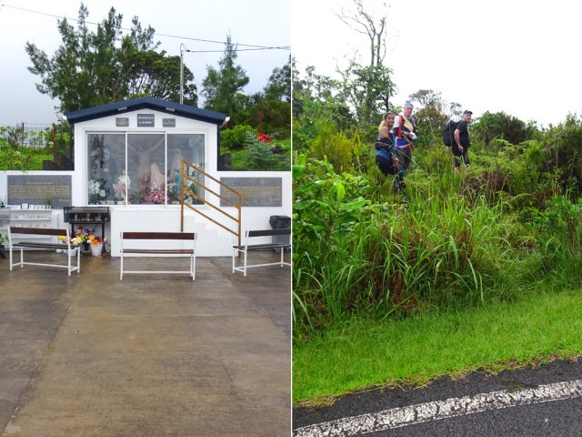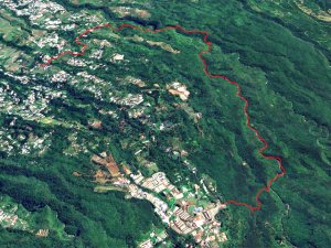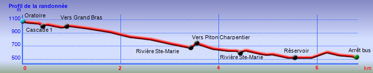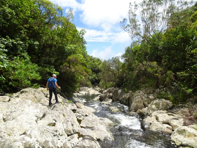 La randonnée débute au plus près de l'arrêt de bus Jacinthes et se terminera à l'arrêt Azalées pour les amateurs de transport en bus (Photo 1). Si l'on étudie les trajets et horaires, c'est sans doute la meilleure solution qui évitera de monter à 1000 m avec 2 véhicules. Près de l'arrêt de bus est érigé un grand oratoire en dur et en verre inauguré en 2023. De l'autre côté de la route, dans le virage, débute un sentier discret dans les herbes et fougères (Photo 2). Uniquement fréquenté par les employés de l'eau et les pêcheurs, il est assez envahi de goyaviers, fougères et longoses mais facile à suivre sans hésitation (Photo 3). Il coupe à mi-parcours une petite ravine. Dans la descente suivante on entend le bruit d'une chute d'eau avant de deviner une trace discrète qui en prend la direction. 20 m plus loin, on arrive à cette jolie chute dans un écrin de verdure et de branches moussues (Photo 4). Cela donne déjà une très bonne impression pour envisager la suite. Reprendre le sentier et terminer la descente jusqu'à la rive de la Ravine du Bernica. Très vite on se retrouve près de câbles et l'on comprend que le sentier sert aux ouvriers de maintenance d'un captage situé plus en aval (Photo 5). Le sol des berges permet toujours de trouver un passage aisé. (Photo 6). Il faut cependant prendre garde à une glissade possible dans les bassins qui bordent le sentier (Photo 7). On frôle les cascades 2, 3 et 4 avant de parvenir à un magnifique endroit digne des plus belles cartes postales. Les chutes d'eau de chaque côté (C5) encadrent de magnifiques arbres recouverts de mousses (Photo 8). On pourrait rester ici longtemps mais il reste d'autres cascades à découvrir. Les câbles amènent au petit barrage aménagé pour alimenter un captage en rive gauche (Photo 9). Si jusqu'ici, le cheminement s'effectuait sans effort, il faut, pour atteindre le pied de la C6, trouver en rive droite le minuscule sentier en pente si forte que les goyaviers sont indispensables pour conserver l'équilibre (Photo 10). Une fois à la ravine, on peut se rendre au pied de la petite chute (Photo 11). Poursuivre quelques minutes le long de cette première ravine jusqu'à la C7. C'en est fini de cette courte descente de la Ravine du Bernica. Partir sur la droite sur une trace très discrète qui attaque le rempart comme si l'on voulait contourner cette chute et son bassin. Mais ce sentier sert simplement à rejoindre le Grand Bras Sec. La pente est sérieuse dans les pailles sabres. On longe un tuyau noir sur quelques mètres puis on parvient au sommet du rein que l'on suit un peu dans des mousses et branles verts. Le sentier, toujours aussi étroit, entame ensuite sa descente vers le Grand Bras Sec où il finit par un palier glissant (Photo 12). Le bras est beaucoup plus large que la Ravine du Bernica. Entamer pour plusieurs heures la descente de ce ruisseau calme qui se transformera petit à petit en torrent. Pas d'indication pour ce cheminement qui s'effectue toujours en choisissant le meilleur passage, sur les berges, sur les roches ou tout simplement dans l'eau (Photo 13). Sur les 7 heures de descente, on aura souvent à passer des rochers plus hauts que la moyenne imposant quelques acrobaties sans danger (Photo 14). Au bout de 5 minutes, on arrive à l'un des plus beaux bois de rempart de l'île imposant de passer sous ses énormes branches (Photo 15). La descente se poursuit, toujours aussi instinctive si on prend le temps de rechercher le bon passage au lieu de se lancer tête baissée dans le lit du torrent (Photo 16). Les bassins se multiplient ainsi que les cascades. Ces dernières rivalisent de beauté comme la C1, la première rencontrée, qui donne envie de poursuivre (Photo 17). Les contournements, très fréquents, seront le facteur de ralentissement de la journée. Si tous sont situés en rive droite au début, il faudra cependant chercher en rive gauche quand cela ne sera pas possible. Le relief et l'intensité de la végétation ont vite fait de renseigner sur la faisabilité de ces contournements. Ils sont très courts et ne s'éloignent jamais trop du cours d'eau. Tous sont sportifs car ils demandent de l'équilibre dans les fortes descentes ralenties par les branches en travers. Les goyaviers, partout considérés comme des pestes à éradiquer, sont ici salutaires. Les petites chutes et nombreux rapides se suivent sans détournement. Il suffit de trouver un passage sur les berges ou de mouiller les pieds pour passer les obstacles (Photo 18). On ne compte plus les arbres tellement recouverts de mousse qu'ils ont du mal à sortir du feuillage (Photo 19). La C3 vaut également le coup d'œil (Photo 20). Son grand bassin donne des envies de baignade mais il faut toujours garder à l'esprit la rapidité des aiguilles du chrono. Juste après la C5, on arrive au confluent de la Ravine Fond de Bouc qui offre de beaux rapides si on a le temps de la remonter un peu. A mi-parcours, le sol, occupé par les gros galets depuis le départ, à tendance à laisser la place aux larges plaques basaltiques qui facilitent la progression (Photo 21). On ne quitte pourtant pas les rochers comme ceux bordant la C6 (Photo 22). On retrouve un magnifique jamrosat couvert de mousses et de fougères juste après la C8 (Photo 23). Trois cascades plus loin, après de nouveaux contournements dans les fourrés, on passe au plus près de la C12 que l'on aperçoit tout d'abord dans une fenêtre  de gros rochers (Photo 24). On peut s'en approcher facilement en prenant garde au dérapage sur le fond glissant (Photo 25). Après une quinzaine de beaux rapides et 18 cascades (Photo 26), on approche de la Rivière Sainte-Marie qui surgit de la droite. Elle a beaucoup moins de débit que le Grand Bras Sec. Longer la berge sur quelques mètres en rive droite et trouver un nouveau sentier, tout aussi discret que les précédents. Il est court mais en forte pente dans les bois de couleurs, goyaviers 