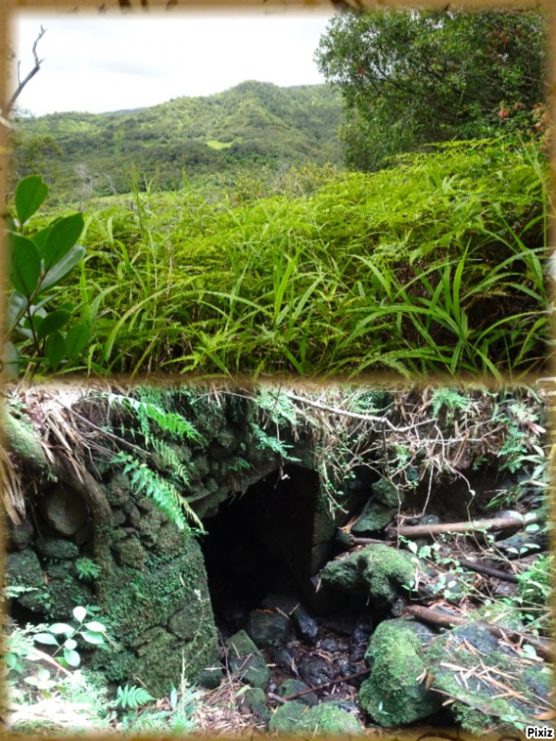 Randonnée pour aventuriers aguerris. Revenir au bassin et son barrage de bois enchevêtrés qui est le point de départ de la montée vers la crête dominant la Ravine St-Denis. Trouver en rive gauche les traces anciennes de passage, souvent effacées par la végétation. Il faut monter immédiatement après la rive. La trace est, soit visible, soit instinctive entre les arbres ou goyaviers (Photo 18). On peut apercevoir dans les futaies la haute cascade dont a rejoint le bassin au cours de la montée. Les repères sont très rares ou inexistants. Ce sont surtout des branches cassées ou coupées, parfois un coup de sabre sur une écorce, des traces au sol ou les inévitables bouteilles qui permettent d'imaginer être sur la bonne voie. Ne jamais quitter le GPS qu'on consulte toutes les 5 minutes. La pente s'accentue dans les sabres et fougères, heureusement les goyaviers aident à ne pas glisser (Photo 19). Quand on parvient sur la crête, il est plus difficile de s'égarer puisqu'il faudrait descendre à gauche ou à droite pour se perdre (Photo 20). Plus haut, on se retrouve sur un plateau et la trace épouse presque la courbe de niveau pour une marche à plat entre les goyaviers (Photo 21). L'effort a été intense jusqu'à maintenant mais il y a toujours quelque chose à découvrir en pleine nature (Photo 22). Outre les orchidées, belles racines ou champignons colorés, on découvre régulièrement de longues lianes de vanille, certainement cultivée au siècle dernier. Après une heure de marche souvent difficile, on parvient à l'ancien sentier venant du captage des Congres et menant à Camp Michel (Photo 23). Le sentier n'est plus employé mais il est beaucoup plus facile à suivre car on retrouve les fossés délimitant à l'époque ce qui était une piste (Photo 24). Ce large chemin reliant les cultures passait sur des ouvrages d'importance pour faire passer l'eau des ravines (Photo 25). Après de rares hésitations dues à l'invasion des ronces et goyaviers, on termine le sentier par quelques descentes en direction de la Ravine des Congres (Photo 26). Le sentier se termine à un gros arbre puis au sentier du captage. Franchir la passerelle qui domine le Grand Bras puis entamer le retour très facile par le Chemin de l'Harmonie (Photo 27). Certaines portions du chemin sont très boueuses. Le parcours est plat ; il coupe des ravines sur de nouveaux ouvrages , frôle un grand oratoire et se termine à une station de pompage (Photo 28). On se retrouve plus loin sur des tronçons de chemins empruntés par les agriculteurs avant de rejoindre la RD53. La fin de cette boucle emprunte une petite rue descendant vers le poste électrique.