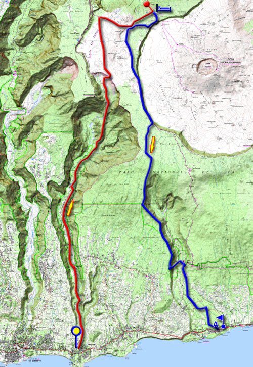 Attention, cette sortie de deux jours est longue (48 km) et la première étape s'effectue presque toujours en montée constante. En partant de la mer, ce sont 2300 mètres d'ascension qui demandent un excellent entraînement. C'est pourquoi beaucoup préfèrent partir de Grand Galet pour économiser 10 km, principalement de bitume. Le circuit de 48.5 km en quelques chiffres Première étape : 24.5 Km - D+ 2350 m - de 8 à 9 heures de marche Deuxième étape : 24 Km - D+ 50 m - de 6 à 7 heures Le premier jour : Stationner à la balance de la canne à Langevin et entamer une longue montée le long de la petite route en direction de Grand Galet. Cette fastidieuse remontée présente l'avantage de traverser des petits hameaux, de voir des vergers ou plantations d'ananas et des cascades en suivant la rivière parfois de très près. Deux portions sont particulièrement pentues, surtout pour les véhicules lorsque la route est mouillée. Un raccourci est possible en passant auprès de la Cascade du Trou Noir. Ne pas manquer la cascade Langevin, une des plus visitées de l'île, sur la droite avant de parvenir à Grand Galet. Traverser le village vers le nord en direction de Cap Blanc. Une fois le village de Grand Galet traversé, la première partie jusqu'au gué sur la Grande Ravine puis à Cap Blanc est assez facile. On traverse d'anciens îlets où seuls subsistent quelques petits champs et une case avec chiens et poules. La marche est facile le long d'une tuyauterie sous les filaos. Ne pas manquer le point de vue sur la Cascade la Fouillée à gauche du sentier. Après le gué, monter sur le sol parfois rocailleux et passer auprès de l'abri vieillissant. Les cailloux se multiplient et la montée s'intensifie en direction de Grand Pays. Le parcours grimpe un moment le long d'une arête avant de parvenir à Grand Pays. Une portion plate d'un kilomètre, dominant la Ravine de Grand Pays, repose un peu avant d'attaquer la rude pente jusqu'à la Plaine des Sables. On ne compte plus les dizaines de lacets courts et serrés qui frôlent parfois de très près le ravin sur la gauche où coule la Ravine de Grand Sable. La fin de la montée utilise longuement le fond basaltique de cette ravine avant d'entamer la dernière montée glissante vers la haute lèvre de basalte fondu bordant la Plaine des Sables. On parvient dans des zones de gratons et de laves acérées où le sentier est bien tracé. La fin du trajet est encore lointaine mais l'effort est nul car le sol est plat en longeant le Piton Chisny ou en traversant les belles plaques colorées. La carte prévoit de poursuivre jusqu'au sentier Josémont mais il est possible de raccourcir en empruntant la RF du volcan au moment de la traverser. Suivre le sentier sur le sable ou les roches jusqu'au pied du rempart du Plateau des Basaltes. Partir à droite sur la GRR2 et remonter vers le petit col entre le Piton Haüy et le Demi-Piton. La première journée se termine au gîte après un passage à la Griffe du Diable puis en rejoignant la piste forestière. Le lendemain, monter au Pas de Bellecombe par le sentier qui débute au sentier de Découverte. Longer la caldeira jusqu'au parking et emprunter la piste passant au pied du Piton Chisny. Bifurquer à gauche sur le sentier du Tremblet. Suivre le parcours jusqu'au Piton Rouge puis en direction du Piton de Bert sur piste ou sentier. Au premier croisement, partir sur la droite et traverser les landes de Foc Foc. A partir de 2100 m, la pente deviendra un peu plus forte. Seule la végétation changera. La forêt est plus touffue que de l'autre côté de la Vallée Heureuse. On se rapproche de la vallée un peu avant le Piton Lardé mais les points de vue sont rares en raison de la végétation touffue. La forêt est superbe car les goyaviers ne viendront que plus bas. Contourner le Piton Lardé par l'ouest et poursuivre sur un sentier boueux le plus souvent malgré la descente qui évacue l'eau. La forêt Jacques Payet devient de plus en plus envahie de goyaviers. Le sentier est large et souvent rectiligne. Cela facilite les glissades en période humide. Le sentier suit longuement la Vallée Heureuse et les points de vue y sont plus fréquents. On parvient à un croisement. Prendre à gauche et entamer une courte descente en lacets pour atteindre la Ravine de Basse Vallée qu'on traverse par un gué rocheux. De l'autre côté, la forêt de cryptomerias moussus est très belle. On franchit une échelle et on arrive très vite à la route à quelques pas du gîte de Basse Vallée. Partir sur le sentier longeant au début le Bras Plat après avoir traversé al route. Il traverse quelques bois avant de longer des cultures sur la gauche. Il descend constamment sur un sol fait de vieilles laves moussues puis traverse plusieurs fois la route forestière. Il part vers l'est en face de Matouta et se termine par une longue descente rectiligne à 400 mètres de l'église de Basse Vallée.