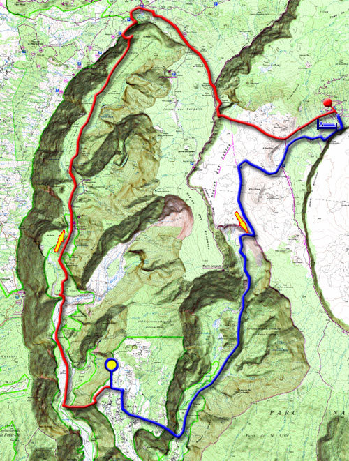 Cette superbe boucle permet, comme souvent sur deux jours, de traverser des paysages très variés (vallée de la Rivière des Remparts, landes, Plaine des Sables, forêts et zones de pâturages). Elle demande un bon entraînement le premier jour pour effectuer la difficile descente du sentier de l'Îlet Dimitile (480 m) et la longue remontée jusqu'au gîte du Volcan par l'oratoire Ste-Thérèse (2412 m). Le deuxième jour s'effectuera principalement en descente, excepté le sentier Tarzan pour relier Grand Galet à Grand Coude. Le circuit de 45.5 km en quelques chiffres Première étape : 25.5 Km - D+ 2000 m - de 8 à 9 heures de marche Deuxième étape : 20 Km - D+ 600 m - de 6 à 7 heures Premier jour : Débuter au parking situé au nord de l'église de Grand Coude, ou mieux, par le Chemin de l'Aventure un peu avant l'église en marchant sur le Chemin Théophile Gauthier. Le sentier de bord étant un peu laissé à l'abandon, la deuxième solution est la meilleure en stationnant au début du village. On parvient très vite au rempart pour trouver un sentier étroit et très raide qui rejoint la Rivière des Remparts en longeant le rein qui domine l'Îlet Dimitile. Il faut s'aider des mains qui ralentissent la descente. Après près d'une heure d'efforts on arrive au fond très caillouteux de la rivière. Trouver au plus vite la piste qui remonte la vallée en direction de Roche Plate. La marche est facile jusqu'au Barrage de Mahavel ainsi qu'à l'îlet de Roche Plate pour une première halte. Le sentier, bordé de pierres, grimpe de plus en plus jusqu'à la Pente de la Cascade. Le sentier, large et en bon état, est le plus souvent recouvert de laves qui peuvent être glissantes après la pluie. La pente est régulière jusqu'au pied du rempart où l'on a déjà remonté 1200 mètres. La dernière difficulté de la journée consiste à remonter le sentier en lacets pour atteindre la route forestière du Volcan. Prendre à droite avant la route et suivre le sentier agréable dans les brandes en direction du Piton de Sable. Contourner ce piton presque totalement même si on peut couper à travers en employant la ligne coupe-feu. La dernière montée s'effectue sur le GRR2 qui coupe plusieurs fois la route du volcan. On laisse la Stèle Josémont Lauret, la Caverne des Lataniers, l'Oratoire Ste-Thérèse pour descendre à la Plaine des Sables par le Plateau des Basaltes, dernière difficulté très surmontable. La fin est une balade reposante sur le sable du sentier Josémont jusqu'au gîte pour une nuit de repos au frais.
