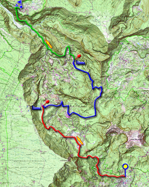 Avec des étapes frôlant les 20 kilomètres et de belles pentes, elles-mêmes classiques, ne pas entreprendre cette sortie sans avoir l'entraînement minimum. Le circuit de 54.5 km en quelques chiffres Première étape : 19.5 Km - D+ 1200 m - de 7 à 8 heures de marche Deuxième étape : 21 Km - D+ 1300 m - de 7 à 8 heures Troisième étape : 14 Km - D+ 800 m - de 5 à 6 heures Premier jour : Quitter Cilaos par le sentier des Porteurs, facile à repérer en ville. Rejoindre les Thermes, poursuivre sur un court tronçon de route avant d'emprunter le sentier de la Cascade du Bras Rouge. La balade est agréable jusqu'à la cascade et devient plus difficile après le passage du gué. Une montée assez raide amène à la route de l'Îlet à Cordes. Entamer ensuite la longue montée vers le Col du Taïbit par de nombreuses marches. Le sentier est large et toujours en bon état. Deux portions plates permettent de souffler un peu à l'Îlet des Salazes et à la Plaine aux Fraises. L'arrivée au col du Taïbit ne signe pas encore la fin des montées. Profiter des points de vue sur les deux cirques avant d'entreprendre la descente vers Marla. Le sentier est plus étroit et comporte une portion rocheuse un peu vertigineuse. Le vaste îlet de Marla se traverse sans difficulté. Prendre le premier sentier à gauche vers Trois Roches et entamer une nouvelle descente vers la rivière. La pente est tout d’abord aisée puis se complique à l'arrivée de pierriers instables. Le sol devient de plus en plus aride après les plantations de filaos. Quelques points de vue sur la vallée méritent de courtes haltes. La fin de la descente est marquée par un nouveau gué rocheux. Le sentier longe ensuite le cours d'eau en rive droite et s'élève pour franchir un rein. Terminer le contournement pas un escalier en bois et poursuivre le long de bassins et de larges plaques de basalte. Le sentier, rocheux et presque plat est reposant jusqu'à la cascade de Trois Roches. Un repos est possible sur les larges plaques rocheuses qui entourent l'étroit canyon. Franchir une troisième fois la Rivière des Galets et entamer une longue jonction tout en dents de scie et contournements divers pour longer le bas du rempart de Mafate. Au Plateau Cerf, filer tout droit vers l'école par une courte descente en lacets à moins de partir à droite si le gîte se trouve dans la partie est de l'îlet. Le lendemain, marcher vers le Bronchard qui sert de repère. Laisser le sentier Dacerle à gauche et poursuivre vers le Bronchard. Partir sur la droite et entamer la longue descente parfois vertigineuse en direction de la Rivière des Galets. Le sentier est large mais caillouteux, comporte des hautes marches et quelques sécurités rassurantes. A cause de la falaise, il faut marcher vers l'aval pour trouver le gué et remonter la rivière, guidé par les nombreuses balises rouges et blanches. Franchir de hautes échelles et entamer une montée vertigineuse qui ne convient pas à tous en raison de la pente, des à-pics et des glissades possibles. Les lacets sont plus nombreux qu'à la descente du Bronchard. L'effort étant intense, ménager ses forces afin d'effectuer la totalité du parcours en restant en forme. On arrive enfin au plateau de la Nouvelle qu'on rejoint en véritable balade tout en profitant de la vue de l'ensemble de l'îlet. Traverser la Nouvelle et se diriger vers le sentier remontant à la Plaine des Tamarins. Si les cuisses commencent à avoir des crampes, tenter le Chemin Charrette, plus long mais plus facile. Sinon, remonter les nouvelles marches jusqu'à la Découverte. Le sentier, le plus fréquenté du cirque, est toujours en bon état. La Plaine des Tamarins est aussi agréable pour les membres que pour les yeux. Les tamarins couchés au sol, à l'état de squelettes ou bien vivants sont toujours énormes, tortueux et majestueux. Des planches sommaires en buches et rondins isolent de la boue. Laisser le sentier de Marla et monter encore un peu sous les tamarins. Ils diminuent et disparaissent un peu plus haut quand on rencontre le sentier du Morne de Fourche. Continuer en direction du Col des Bœufs qu'on aperçoit facilement. La pente est assez raide par endroits. Les marches sont souvent hautes mais on arrive à la RF du Haut Mafate assez facilement par rapport à la montée de la Nouvelle. Emprunter longuement la piste, passer le parking puis rejoindre le départ du sentier Scout. Ce magnifique sentier est un grand classique qui débute par de longs détours pour éviter des ravines et se poursuit par une forte montée en escaliers pour atteindre Deux Fesses. Les sujets au vertige n'aiment en général pas trop ce passage pourtant facile et sans danger. Des câbles fixés à la paroi sécurisent les plus inquiets. La montée est très courte jusqu'au plateau de Sales avant d'entamer la véritable descente vers l'Îlet à Malheur. La marche est facile jusqu'aux filaos du Plateau Bémale. Puis la descente devient de plus en plus raide avec de très hautes marches parfois et de très nombreux lacets. Les points de vue sont fréquents sur le Piton Cabris qui domine au centre du panorama. Les difficultés cessent à l'ancien captage Grimaud reconnaissable à la cuve en ciment qui borde le parcours. Les filaos sont de plus en plus nombreux le long de la descente sur un sol le plus souvent recouvert d'aiguilles sèches, donc glissant. On frôle les premières cases et jardin, on franchit une ravine puis on marche jusqu'à l'Îlet à Malheur les Hauts. Poursuivre jusqu'à un gîte pour la nuit. Le troisième jour, traverser le Bras Bémale sur une passerelle et entamer la rude montée sous les filaos ou dans les chouchous jusqu'à Aurère. Passer devant le dispensaire et rejoindre Bord Bazar pour de magnifiques points de vue sauvages sur le sud. Descendre fortement le long du rempart du Piton Cabris et dominer le vide sur un sentier vertigineux avant d'entamer une descente par de longs lacets pour s'approcher de