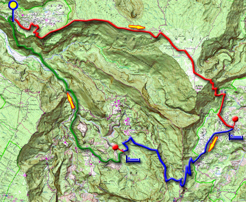 Très agréable périple qui permet d'admirer les Cirques de Mafate et Salazie depuis les hauteurs de la Roche Ecrite puis de traverser le nord du Cirque de Mafate avant de retourner à Dos d'Ane. La première journée est longue et difficile. Les autres sont plus courtes et abordables par la majorité malgré quelques belles montées. Le circuit de 48.5 km en quelques chiffres Première étape : 18.5 Km - D+ 1200 m - de 6 à 7 heures de marche Deuxième étape : 14.5 Km - D+ 750 m - de 5 à 6 heures Troisième étape : 15.5 Km - D+ 800 m - de 5 à 6 heures Premier jour : Partir de l'église de Dos d'Ane qu'on retrouvera dans deux jours. Suivre les panneaux "Cap Noir" pour gagner ce lieu tellement visité des touristes et randonneurs. C'est de la route mais la distance est courte. Au parking du Cap Noir, prendre le sentier et décider de prendre l'un ou l'autre des circuits menant à la Roche Verre Bouteille. Le circuit de gauche monte régulièrement et parfois assez fortement à 1306 m d'altitude pour de beaux points de vue sur Mafate puis se poursuit à plat avant de descendre jusqu'à l'aiguille rocheuse. Celui de droite est plat jusqu'au kiosque et au point de vue classique et remontera avec des échelles jusqu'à la Roche Verre Bouteille. La roche, originale pointe de pierres mélangées, ne mérite pas une longue halte à moins de l'escalader comme font beaucoup. Poursuivre en direction du Piton Fougères avec de superbes vues sur Dos d'Ane ou Mafate. Le sentier est étroit le long de ce rein abrupt recouvert de terre et de cailloux. Attention à certaines portions très caillouteuses qui sont vertigineuses mais sans grand danger si on prend garde. Le Piton Fougères ne se remarque pas dans la végétation car il dépasse à peine dans la forêt. Du Piton jusqu'au croisement vers l'Îlet à Guillaume le sentier n'en finit plus de monter et redescendre pour passer des failles du rempart ou des ravines. La forêt humide composée de beaux bois de couleurs est magnifique mais très humide. Les épiphytes et orchidées sont partout tout comme les calumets, ces bambous endémiques. Le sentier étant souvent au plus près du bord, on se régale du spectacle du cirque, des vallées, des crêtes ou des pitons à l'horizon. Après le croisement du sentier de l'Îlet à Guillaume, il quitte le bord du rempart. Les tamarins sont de plus en plus nombreux. Les tamarins couchés qui ont poursuivi leur croissance après avoir été mis à bat par un cyclone forment des ponts naturels sous lesquels on passe plus ou moins facilement. Le sol est le plus souvent herbeux et agréable à l'œil. Quelques beaux spécimens d'eucalyptus annoncent l'arrivée proche du gîte. Après la halte au gîte, prendre le sentier plein ouest et rejoindre la Caverne Dufour. Plusieurs sentiers partent dans des directions diverses pour aller au plus près de la Mare aux Cerfs ou la Caverne Soldat. Le sol devient de plus en plus basaltique avec des traces de peinture blanche partout. Après ces embranchements de sentiers, on arrive au sommet pour profiter des points de vue exceptionnels sur les cirques. La dernière montée peut s'éviter si on connait ou que la fatigue arrive. Dans ce cas, partir vers le rempart à l'est et entreprendre la difficile descente vers Grand Îlet. La pente est parfois très forte et il faut dès le départ éviter de compter les lacets. Cette pente qui sert de compétition au Kilomètres Vertical laisse en général de très bons souvenirs aux muscles qui se reposaient dans la longue montée. Une fois sur la route de la Mare à Martin, prendre à droite et rejoindre Grand Îlet pour un repos bien mérité. Le lendemain, quitter Grand Îlet par la route et marcher jusqu'au Bélier puis continuer longuement sur la route en passant les longs lacets vers le départ du sentier Scout. Laisser à droite le sentier Augustave. Plus haut, après une épingle de la route, emprunter le circuit du sentier Scout. C'est un classique de Mafate qui débute par de longs détours pour éviter des ravines et se poursuit par une forte montée en escaliers pour atteindre Deux Fesses. Les sujets sensibles au vertige, n'aiment en général pas trop ce passage pourtant facile et sans danger. Des câbles fixés à la paroi sécurisent les plus inquiets. La montée est très courte jusqu'au plateau de Sales avant d'entamer la véritable descente vers l'Îlet à Malheur. La marche est facile jusqu'aux filaos du Plateau Bémale. Puis la descente devient de plus en plus raide avec de très hautes marches parfois et de nombreux lacets. Les points de vue sont fréquents sur le Piton Cabris qui domine au centre du panorama. Les difficultés cessent à l'ancien captage Grimaud reconnaissable à la cuve en ciment qui borde le parcours. Les filaos sont de plus en plus nombreux le long de la descente sur un sol le plus souvent recouvert d'aiguilles sèches, donc glissant. On frôle les premières cases et jardin, on franchit une ravine puis on marche jusqu'au premier croisement du sentier vers Grand Place. Partir à gauche puis, très vite, plonger par des lacets vers la Grande Ravine qui se franchit sur une passerelle. La montée est tout aussi raide sur des portions protégées du vide par des rambardes grillagées. On arrive à un bois de filaos et le sentier part le long du rein de manière presque rectiligne pour arriver très vite à l'îlet à Bourse. Le troisième jour, quitter l'Îlet à Bourse et descendre franchir le Bras d'Oussy puis remonter fortement jusqu'à un col proche d'un réservoir. On aperçoit le vaste îlet de Grand Place. Entreprendre la descente, tourner à droite au premier croisement et marcher en direction du Piton Papangue qui domine l'école. Partir sur la gauche en arrivant à l'école et marcher en direction de Cayenne sur un sentier en escalier très caillouteux. A partir de Cayenne, trois itinéraires sont possibles par les flancs du Piton Tortue ou par la rivière. Poursuivre tout droit sur 