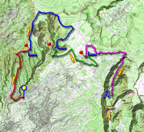 Cette sortie inhabituelle permet de passer quatre jours autour de Bourg Murat sans s'en éloigner. Le circuit de 74 km en quelques chiffres Première étape : 17.5 Km - D+ 1650 m - de 7 à 8 heures de marche Deuxième étape : 21 Km - D+ 900 m - de 6 à 7 heures Troisième étape : 13.5 Km - D+ 900 m - de 5 à 6 heures Quatrième étape : 22 Km - D+ 500 m - de 7 à 8 heures Premier jour : Se rendre au Tampon et rouler vers Trois Mares puis au Bras de Pontho pour se faire déposer au départ du sentier du Dassy. La descente caillouteuse ne comporte pas de réelle difficulté comme les hautes marches ou les à-pics. Près du Bras de la Plaine, des îlets se reconnaissent aux plantations et murs de pierre sèche. Franchir le Pont de la Liane et remonter vers l'Entre Deux sur un sentier un peu plus raide, rocheux et parfois protégé de rambardes. Une fois parvenu à l'Entre Deux, la jonction avec le sentier du Zèbre impose d'emprunter quelques rues qui nécessiteront peut-être d'avoir la carte. Le sentier du Zèbre monte régulièrement vers le Dimitile en empruntant une des nombreuses crêtes de la région. Quand le sentier part à droite par quelques lacets, c'est pour rejoindre le sentier de la Grande Jument. Terminer la montée jusqu'au panorama sur le Cirque de Cilaos et repartir en direction d'un des gîtes d'altitude en suivant sentiers ou pistes terreuses pour une visite à la chapelle et sa tombe esseulée. Le lendemain, partir plein nord en direction du sentier Jacky Inard qu'on peut rejoindre à la fin du parcours ou en coupant le long de la ligne coupe-feu. Très vite, on peut profiter de magnifiques points de vue sur Cilaos par quelques trouées dans les branles, très nombreux à cette altitude. Le sentier arrive plus loin sur une arête étroite séparant le cirque de la profonde vallée des Roches noires. On est accueilli par une très impressionnante échelle donnant l'impression de plonger vers Bras Sec. Il y aura bien d'autres échelles par la suite pour franchir de nombreuses barres rocheuses. Remonter vers le Sommet de l'Entre Deux sur le même type de sentier et repérer de là-haut les vues sur les zones marécageuses du Kerveguen. Un sentier étroit et pierreux amène à ces zones marécageuses qu'on traverse un peu plus loin. A l'approche de quelques mares d'eau claire, partir à droite sur le sentier du Piton des Neiges et descendre en direction des cavernes du Bras Chansons qui méritent une halte. Plus bas, après avoir longé le bras, entamer la montée du GRR2 pour atteindre la forêt de la Plaine des Cafres. L'arête est étroite et certains passages s'effectuent par des échelles. Contourner le Piton Tortue par le sud et poursuivre en direction de Bourg Murat. Au premier croisement, ne pas manquer le sentier Mollaret qui débute dans une magnifique forêt primaire. Le sentier y est boueux mais les paysages font oublier cet inconvénient. On frôle le Piton Lepervanche et le Piton Bleu avant de plonger littéralement vers Grand Bassin. Le sentier est technique et plus difficile qu'en montée. Prendre garde à la glissade en utilisant les échelles. Les pierres sont également humides et moussues par endroits. La fin de la descente est assez bien sécurisée par de multiples rambardes câblées. On parvient à une piste. Prendre à gauche, franchir une passerelle et arriver sans efforts à la chapelle de Grand Bassin puis au village lui-même qui offre une quantité de gîtes pour la nuit. Le troisième jour, quitter Grand Bassin pour Bois Court pour une difficile montée sans échauffement. Après avoir franchi la passerelle sur le Bras Sec, le sentier monte doucement sur 300 m pour justement échauffer un peu. Quelques lacets débutent jusqu'au Petit Coteau pour reposer à nouveau 300 m. Puis c'est la série ininterrompue de lacets serrés et rocheux jusqu'aux escaliers métalliques qui entourent la station de pompage. Nouveaux lacets jusqu'au Grand Coteau où l'on retrouve le sentier moins incliné longeant une courbe de niveau. Cette plus longue partie plate est suivie d'une dernière montée tout aussi rocheuse qui se termine au bord du rempart. Prendre l'un ou l'autre des deux sentiers et rejoindre rapidement la Route du Piton Bleu. La marche sur route est obligatoire dans cette région plus urbanisée. Au premier croisement, partir à droite par le Chemin Doret. Une balade est possible sur le Piton Darid qu'on frôle de quelques mètres. Reprendre le chemin bétonné jusqu'à Bourg Murat et, comme cette étape est courte, la rallonger un peu en partant sur la Rue Alfred Picard en direction du volcan. Continuer vers le Piton Dugain et le traverser en suivant sentier et tuyaux jusqu'à un château d'eau. Poursuivre par la piste jusqu'à la RF du Volcan, tourner à droite sur 150 m et partir dans les prairies par le Chemin Grande Savane. Traverser l'aire d'entrainement des 4x4 et emprunter le sentier qui longe le Grand Bras de Pontho jusqu'à la Route des Herbes Blanches. Il est possible de poursuivre sous le pont pour une dernière balade sur le Piton Desforges. Sinon, retrouver la ville pour y trouver un logement pour la nuit. Le quatrième jour, emprunter la route pour marcher jusqu'à l'ancien tracé du GRR2 ou reprendre le chemin inverse de la veille jusqu'au rond-point à la fin du Chemin Grande Savane. De là, suivre le nouveau GRR2 qui contourne le Piton Guichard par le nord, traverse plusieurs fois la petite route et attaque par le sud le contournement des Trous Blancs. Ne pas hésiter à descendre au fond du premier pour des vues originales des remparts. Une fois arrivé à la RF du Volcan, traverser et franchir le rein du Nez de Bœuf. S'il fait beau, la montée au sommet ne prend que quelques minutes. Rejoindre le rempart, le longer en profitant des panoramas sur la vallée qu'on va bientôt descendre. Des belvédères artificiels ou naturels permettent ces observations. Ne pas manquer le sentier de la Rivière des Remparts qui plonge vers le 