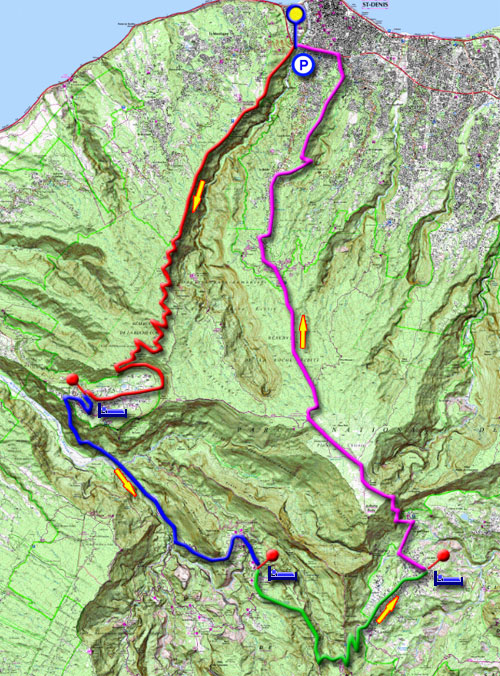 80 kilomètres représentent une bonne moyenne journalière avec un peu d'entraînement mais la boucle comporte des difficultés comme la remontée vers Bord Bazar, le Sentier Scout ou de Grand Îlet à la Roche Ecrite. Le circuit de 82 km en quelques chiffres Première étape : 26.5 Km - D+ 1500 m - de 8 à 9 heures de marche Deuxième étape : 14.5 Km - D+ 800 m - de 5 à 6 heures Troisième étape : 14.5 Km - D+ 1000 m - de 5 à 6 heures Quatrième étape : 26.5 Km - D+ 1200 m - de 7 à 8 heures Premier jour : Il est facile de stationner au stade de la Redoute sur le grand parking. Suivre la route de la Montagne jusqu'au pont Vinh San qu'on aperçoit devant. Passer sous le pont et entamer la montée très classique du Colorado. Le sentier aborde la pente en oblique ce qui permet de ne jamais avoir de pentes très fortes. Le sol est assez caillouteux ou sableux sous les filaos. La végétation diminue, la pente s'adoucit et le sentier s'élargit avant d'arriver à la zone de loisirs du Colorado. Il est préférable de prendre à gauche pour longer au plus près le rempart de la Rivière Saint-Denis afin de bénéficier de beaux points de vue. Traverser la grande surface gazonnée qui mène à la boule blanche de la station météo. Attaquer la descente sous les goyaviers et bois de couleurs sur un sentier tout en marches et souvent humide. On laisse plus bas le sentier de l'Îlet à Guillaume et celui de Saint-Bernard pour filer tout droit par le sentier des Goyaviers en direction de la Mare d'Affouches. Encore des marches mais en montée cette fois pour arriver à la large piste chaotique. Débute une longue jonction avec le kiosque d'Affouches par de très longs lacets qui n'en finissent jamais. Les raccourcis sont inexistants ou envahis de végétation. Au kiosque, prendre à droite le sentier des Lataniers. Souvent mal entretenu, il s'avère difficile après ces heures de montée. C'est un des plus impressionnants sentiers de la Réunion quand on l'étudie sur la carte. Pour rejoindre le Piton Bazar qui domine Dos d'Ane, il faudra passer une cinquantaine de lacets dans la magnifique forêt touffue, tout simplement pour se rapprocher des petites ravines et les franchir sans avoir à descendre puis à remonter. La forêt a beau être belle, on trouve le parcours interminable surtout que des portions très étroites donnent juste la largeur de la chaussure. Quand on arrive au Piton Bazar, on profite d'un beau point de vue sur Dos d'Ane avant d'entreprendre la jonction par un sentier qui descend en lacets couverts de jouvences très souvent humides. Attention au faux pas dans ces plantes qui cachent le vide. La fin de la descente, sous les filaos est couverte de roches qu'il faut enjamber. On parvient à Grand Coin près d'un élevage de bovins. Prendre la route et descendre à gauche vers Dos d'Ane et le gîte choisi. Le lendemain, partir de l'église de Dos d'Ane et descendre la Rue Ferdinand Louise jusqu'au départ du sentier. On rejoint en deux minutes le rempart en passant entre cases et jardins. La descente est tout d'abord ordinaire et classique. Puis on rencontre de plus en plus de hautes marches, de lacets puis, plus loin, des câbles de sécurité et même des échelles. La descente de près de 800 m est interminable et donne une idée de ce qu'est l'effort à fournir pour remonter. Il y a pourtant quelques portions plus plates pour reposer les jambes. Les paysages sur la vallée de la Rivière des Galets ou les crêtes parallèles de la Marianne et d'Aurère. Les asperseurs de l'Îlet Albert ou la source captée peuvent rafraîchir au passage. On parvient, après une dernière descente, au Bras de Sainte-Suzanne qui se traverse par un gué très rocheux. On peut avoir à mouiller les pieds si le niveau est fort. Une fois sur l'autre rive, rejoindre la piste qui se termine un peu plus loin à l'aire de pauser des hélicoptères. On y rencontre presque à chaque fois des mafatais en train de préparer leurs provisions dans de grands filets qui seront rapidement transportés jusqu'à l'îlet perdu de Mafate. Longer la rivière ou la traverser fréquemment sur des gués très bien aménagés. Au lieu dit la Porte, reconnaissable aux travaux bétonnés au-dessus de nos têtes, partir à gauche sur le sentier abrupt sur hautes marches en pierre suivi d'une longue portion dominant la falaise bétonnée. Le sentier devient assez caillouteux, monte ou descend au gré du relief avant d'entamer une descente par de longs lacets pour franchir la passerelle sur le Bras d'Oussy. Prendre à gauche au premier embranchement. La grimpette vers l'Îlet Fougères est moyenne sur sentier caillouteux. On se retrouve au pied du Piton Cabris que le sentier va contourner par le sud. Une bonne partie du sentier est creusé dans la falaise et comporte de nombreuses rambardes pour protéger du vide. Les paysages sur la droite sont superbes et sauvages. De nombreux lacets assez raides permettent d'arriver à Bord Bazar pour de nouveaux panoramas sur le sud du cirque de Mafate. Prendre un des trois sentiers permettant de rejoindre Aurère en privilégiant le principal qui finit au dispensaire. Si on ne désire pas traverser Aurère, emprunter le sentier le plus à droite à Bord Bazar. Descendre vers le Bras Bémale et emprunter la passerelle dominant le bras de 50 m. Terminer cette deuxième journée par la recherche du gîte choisi. Le troisième jour, marcher vers la Plaquee pour débuter la rude montée vers le Col des Bœufs par le sentier Scout. La pente est tout d’abord faible sous les filaos qui bordent les dernières habitations de l'Îlet à Malheur les Hauts. Pas de grandes difficultés jusqu'au bassin cimenté du captage Grimaud. Les choses sérieuses débutent ici par les premiers lacets, nombreux et serrés avec de très hautes marches par moments. Après 500 m de montée du sentier Scout, on suit l'arête plantée de filaos puis on pénètre dans une belle forêt sur le Plateau de la Sale