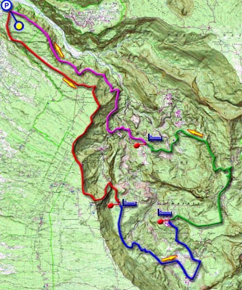 Ce magnifique périple de quatre jours permet d'admirer Mafate depuis le haut du Rempart, de repérer les sentiers avant de les revoir du bas 3 jours plus tard. La première étape est longue et en montée sur une bonne partie. Le retour par la Canalisation des Orangers est longue mais facile et en fin de parcours. Deux jours complets dans Mafate permettent de mieux connaître ce cirque si particulier. Le circuit de 72 km en quelques chiffres Première étape : 20 Km - D+ 1700 m - de 7 à 8 heures de marche Deuxième étape : 14.5 Km - D+ 900 m - de 5 à 6 heures Troisième étape : 19.5 Km - D+ 900 m - de 7 à 8 heures Quatrième étape : 20 Km - D+ 500 m - de 6 à 7 heures Premier jour : La première journée est rude avec une montée constante jusqu'au Maïdo et une descente difficile pour atteindre un gîte de Roche Plate. Bien étudier la fiche n°1160 pour connaître les sentiers et raccourcis du point de départ à Sans Souci. Une fois ces raccourcis terminés, on marche d'abord dans les herbes puis dans les fougères avant de passer sous les filaos aux racines apparentes avant de parvenir au panneau du Conseil Général. Passer deux oratoires et attaquer quelques séries de marches terreuses soutenues de marches en bois. On rencontre plus haut de belles surfaces de goyaviers avant de parvenir à des champs encore cultivés, principalement de géranium. Puis il se rapproche du rempart de Mafate pour les premiers points de vue sur la Rivière des Galets. Il pénètre dans le sous-bois entouré de longoses et arrive à l'Îlet Alcipe qui peut se visiter par un écart passant sur les racines d'un grand affouche. Sinon, poursuivre en direction de lest et attaquer la montée au plus près du rempart dans les tamarins en dominant les îlets des Orangers. Passer au plus près du Piton des Orangers avant de débuter la plongée vers la Brèche. Les paysages depuis le bord du rempart sont grandioses et donnent envie de descendre. Une fois sur le sentier, on se rend compte que ce ne sera pas une mince affaire et pire encore si l'on songe à la remontée du lendemain. La descente est assez facile sur les 500 premiers mètres et les lacets pierreux se multiplient. Les hautes marches sont légion et la fatigue se fait vite sentir au niveau des articulations. Un point de vue en dehors du sentier permet de voir le sud du cirque. Plus bas, la marche s'effectue sur une ligne de crête entre la Ravine Grand-mère, lointaine et celle de la Brèche beaucoup plus proche. On atteint le croisement avec le sentier des Orangers à la Brèche, reconnaissable à sa haute dent basaltique. Prendre à droite, passer l'escalier bétonné et entamer la descente vers Roche Plate sans effort et à l'ombre des filaos. Rejoindre le gîte pour la première nuit. Le lendemain, attaquer directement par une montée en lacets vers le Plateau Cerf puis longer sur une grande distance le bas du rempart de Mafate qui domine par ses 1000 m de hauteur. Il faudra passer plusieurs dents de scie et de nombreux changements de direction sur un sol assez pauvre avant de parvenir à la très connue Cascade de Trois Roches pour une pause agréable. Le précipice est assez dangereux et il faut se méfier en tentant de regarder le fond. Repérer les roches en équilibre sur les plaques de basalte qui ont donné leur nom au lieu. Suivre ensuite le sentier presque plat en rive droite de la Rivière des Galets. Laisser la difficile montée à la Plaine aux sables et continuer de longer le cours d'eau. Dans un coude, emprunter un escalier sur la gauche et contourner le rein pour retrouver un peu plus loin la rivière qu'on franchit à gué sur de gros galets parfois instables. Une difficile montée débute sur un sol très rocailleux et instable. Heureusement, de belles marches ont été aménagées dans quelques cailloutis qui nécessitent un peu d'attention pour ne pas déraper ou trébucher sur des pierres branlantes. Les filaos, plus nombreux, retiennent mieux le terrain et la pente s'assagit à l'approche de Marla. Ce vaste îlet se traverse sans difficulté jusqu'à la jonction du GRR. Partir à gauche et marcher vers Maison Laclos puis bifurquer à gauche avant la Ravine Kelval en direction de la Nouvelle. Il est possible de poursuivre vers la passerelle pour éviter le gué. On se retrouve de toute façon sur le sentier commun un peu plus haut. Deux sentiers aux alentours de la Ravine Alidor permettent de se rapprocher de la Nouvelle. Quelques raidillons courts amènent avec un dernier effort au plus grand îlet de Mafate pour la nuit. Le troisième jour, quitter la Nouvelle et se diriger vers le sentier remontant à la Plaine des Tamarins. Si les cuisses commencent à avoir des crampes, tenter le Chemin Charrette, plus long mais plus facile. Sinon, remonter les nouvelles marches jusqu'à la Découverte. Le sentier, le plus fréquenté du cirque, est toujours en bon état. La Plaine des Tamarins est aussi agréable pour les membres que pour les yeux. Les tamarins couchés au sol, à l'état de squelettes ou bien vivants sont toujours énormes, tortueux et majestueux. Des planches sommaires en buches et rondins isolent de la boue. Laisser le sentier de Marla et monter encore un peu sous les tamarins. Ils diminuent et disparaissent un peu plus haut quand on rencontre le sentier du Morne de Fourche. Continuer en direction du Col des Bœufs qu'on aperçoit facilement. La pente est assez raide par endroits. Les marches sont souvent hautes mais on arrive à la RF du Haut Mafate assez facilement par rapport à la montée de la Nouvelle. Emprunter longuement la piste, passer le parking puis rejoindre le départ du sentier Scout. Ce magnifique sentier est un grand classique qui débute par de longs détours pour éviter des ravines et se poursuit par une forte montée en escaliers pour atteindre Deux Fesses. Les sujets au vertige, n'aiment en général pas trop ce passage pourtant facile et sans danger. Des câbles fixés à la paroi sécuri