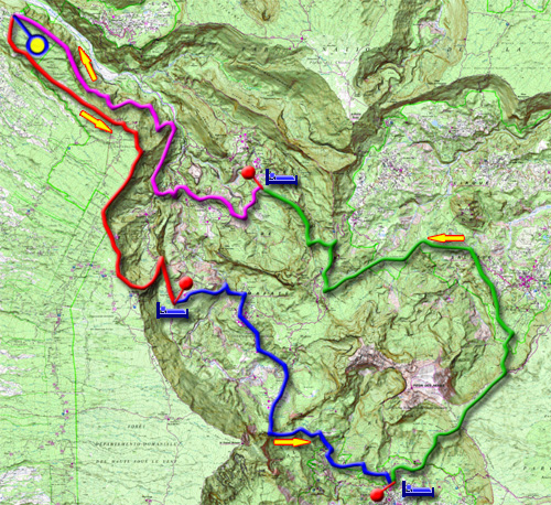 Avec une moyenne de 25 km par jour, dont plus de 35 km pour le troisième jour, celle longue randonnée est à réserver aux marcheurs entraînés. En cas de doute sur ses capacités, prévoir une halte à Hell Bourg pour la troisième nuit et effectuer cette boucle en 5 jours. Le circuit de 103 km en quelques chiffres Première étape : 19 Km - D+ 1700 m - de 7 à 8 heures de marche Deuxième étape : 24 Km - D+ 1250 m - de 7 à 8 heures Troisième étape : 38 Km - D+ 2500 m - de 9 à 10 heures Quatrième étape : 22 Km - D+ 500 m - de 6 à 7 heures Premier jour : La première journée est rude avec une montée constante jusqu'au Maïdo et une descente difficile pour atteindre un gîte de Roche Plate. Bien étudier la fiche n°1160 pour connaître les sentiers et raccourcis du point de départ à Sans Souci. Une fois ces raccourcis terminés, on marche d'abord dans les herbes puis dans les fougères avant de passer sous les filaos aux racines apparentes avant de parvenir au panneau du Conseil Général. Passer deux oratoires et attaquer quelques séries de marches terreuses soutenues de marches en bois. On rencontre plus haut de belles surfaces de goyaviers avant de parvenir à des champs encore cultivés, principalement de géranium. Puis il se rapproche du rempart de Mafate pour les premiers points de vue sur la Rivière des Galets. Il pénètre dans le sous-bois entouré de longoses et arrive à l'Îlet Alcipe qui peut se visiter par un écart passant sur les racines d'un grand affouche. Sinon, poursuivre en direction de l'est et attaquer la montée au plus près du rempart dans les tamarins en dominant les îlets des Orangers. Passer au plus près du Piton des Orangers avant de débuter la plongée vers la Brèche. Les paysages depuis le bord du rempart sont grandioses et donnent envie de descendre. Une fois sur le sentier, on se rend compte que ce ne sera pas une mince affaire et pire encore si l'on songe à ceux qui remontent. La descente est assez facile sur les 500 premiers mètres et les lacets pierreux se multiplient. Les hautes marches sont légion et la fatigue se fait vite sentir au niveau des articulations. Un point de vue en dehors du sentier permet de voir le sud du cirque. Plus bas, la marche s'effectue sur une ligne de crête entre la Ravine Grand-mère, lointaine et celle de la Brèche beaucoup plus proche. On atteint le croisement avec le sentier des Orangers à la Brèche, reconnaissable à sa haute dent basaltique. Prendre à droite, passer l'escalier bétonné et entamer la descente vers Roche Plate sans effort et à l'ombre des filaos. Rejoindre le gîte pour la première nuit. Le lendemain, marcher vers le Bronchard qui sert de repère. Laisser le sentier Dacerle à gauche et poursuivre vers le Bronchard. Partir sur la droite et entamer la longue descente parfois vertigineuse en direction de la Rivière des Galets. Le sentier est large mais caillouteux, comporte des hautes marches et quelques sécurités rassurantes. A cause de la falaise, il faut marcher vers l'aval pour trouver le gué et remonter la rivière guidé par les nombreuses balises rouges et blanches. Franchir de hautes échelles et entamer une montée vertigineuse qui ne convient pas à tous en raison de la pente, des à-pics et des glissades possibles. Les lacets sont très nombreux. L'effort étant intense, ménager ses forces afin d'effectuer la totalité du parcours en restant en forme. On arrive enfin au plateau de la Nouvelle qu'on rejoint en véritable balade tout en profitant de la vue de l'ensemble de l'îlet. Traverser la Nouvelle et se diriger vers le Bord de Mars par des montées et descentes successives. Partir à droite au premier embranchement et se diriger vers la Plaine aux Sables qui se traverse très facilement en profitant des panoramas sur les pitons alentour. A l'oratoire situé en bordure, entamer une descente caillouteuse avec de très hautes marches qui finit sur le GRR3 à 400 m de la Cascade de Trois Roches. Partir à gauche en longeant la Rivière des Galets. Dans un coude, emprunter un escalier sur la gauche et contourner le rein pour retrouver un peu plus loin la rivière qu'on franchit à gué sur de gros galets parfois instables. Une difficile montée débute sur un sol très rocailleux et instable. Heureusement, de belles marches ont été aménagées dans quelques cailloutis qui nécessitent un peu d'attention pour ne pas déraper ou trébucher sur des pierres branlantes. Les filaos, plus nombreux, retiennent mieux le terrain et la pente s'assagit à l'approche de Marla. Ce vaste îlet se traverse sans difficulté jusqu'à la jonction du GRR. Partir à droite et entamer la montée de la dernière difficulté par l'ascension du Taïbit. D'abord facile jusqu'à un réservoir sur la gauche, la pente s'intensifie rapidement et la montée se fait sur de nombreux lacets. On parvient à une zone rocheuse où le sentier est taillé à même la roche. Quelques à-pics peuvent inquiéter mais ils ne présentent pas de danger. L'itinéraire, sur la fin devient plus herbeux et l'on parvient au col pour de belles vues sur Marla. La descente, beaucoup plus longue que la montée comporte deux paliers de repos à la Plaine des Fraises et à l'Îlet des Salazes. Le reste du parcours est constamment constitué de lacets, escaliers en pierre ou rondins, hautes marches. On profite des paysages sur la Tête de Lion, le Gros Morne ou la cascade Pitsa avant d'arriver aux escaliers menant à la route de l'Îlet à Cordes. Les descentes sont loin d'être terminées et les dents de scie seront nombreuses sur des sols variables jusqu'au franchissement du Bras Rouge à deux pas de la cascade. Remonter sur l'autre rive jusqu'à la Ravine Ferrière qu'on traverse près d'une petite chute. La fin du parcours, en montée légère amène sans trop d'efforts à la D242. Partir sur la droite et emprunter, au pont, le sentier des porteurs pour les derniers lacets avant de parvenir à Cilaos, fin de c