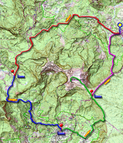 ParkingHell Bourg, proche du terrain de sport Nuits à Maison Laclos,Cilaos, Caverne Dufour IntérêtsGrand Sable, Col de Fourche, Plaine des Tamarins, Col du Taïbit, Cascade de Bras Rouge, montée du Kerveguen, le Piton des Neiges, points de vue depuis le Cap Anglais, panoramas durant les quatre jours Randonnées connexes (10)