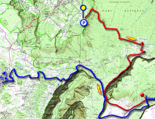Paysages très variés pour cette longue traversée des forêts entourant le Piton des Cabris, des prairies vers le Piton de l'Eau, des sables de la région du Volcan ou les zones d'élevage avant d'arriver à Bourg Murat. Dans ce sens, la boucle présente l'inconvénient d'arriver au gîte totalement crotté, ce qui peut être désagréable pour les touristes de passage venus pour marcher au propre sur de la lave. Penser au linge de rechange car la douche risque de ne pas suffire. Le circuit de 41.5 km en quelques chiffres Première étape : 21.5 Km - D+ 1400 m - de 7 à 9 heures de marche Deuxième étape : 20 Km - D+ 200 m - de 6 à 7 heures Premier jour : Se rendre à la Plaine des Palmistes et rouler jusqu'à la fin de la Rue Saint-Ange Vélia qui se finit en piste dans les cryptomerias. Un petit parking se situe au bout de la route forestière. Le sentier débute à ce parking et s'enfonce aussitôt sous les conifères. Il débute par de longs lacets glissants avant d'arriver aux limites du parc et se mettre tout à coup à grimper plus fortement sans trop de lacets pour diminuer la pente. Des planchers en plus ou moins bon état ou des passerelles permettent d'éviter la boue omniprésente durant toute la montée. Des marches en bois rendent plus propres certaines portions. Mais c'est surtout la boue qui domine. La forêt, en revanche, est très belle, moussue et verdoyante. Après 90 minutes de montée, on passe exactement au sommet du Piton, impossible à remarquer. Les alentours du sommet sont couverts de pandanus des hauts et de touffes de calumets. La descente débute, presque aussi forte que la montée précédente. On traverse de plus en plus de ravines dont celle de Saint-François au fond couvert de mousses. L'herbe envahit parfois le sentier et ses abords et on rencontre quelques tamarins des hauts. La boue ne disparaît jamais. Le sentier file plein sud en longeant un affluent de la ravine St-François qui coule au fond d'un petit canyon étroit pour de belles photos sauvages. Les arbres moussus sont légion et les joncs s'intensifient avant d'arriver aux premières clôtures fermant les prairies d'élevage. Des échelles permettent de sauter les clôtures sans se griffer. Ne pas manquer le sentier lorsqu'il faut traverser une prairie, en recherchant l'autre extrémité sur la gauche. Après de grandes surfaces couvertes de branles, on parvient à la piste du Piton des Cochons. Partir à gauche vers le Piton de l'Eau si l'on ne connaît pas sinon prendre à droite et remonter la piste et certains de ses raccourcis pour atteindre le sentier qui remonte en direction du rempart de la Rivière de l'Est. Une fois au bord, la marche s'effectue en montée mais propose de magnifiques paysages sur la vallée à gauche. On parvient à l'Oratoire Ste-Thérèse pour emprunter le sentier qui descend en direction du Plateau des Basaltes. Une série de lacets se présente après la traversée du plateau et le sentier file ensuite, totalement à plat, en direction du col entre le Piton Haüy et le Demi-Piton. Passé le petit col, on aperçoit déjà le gîte qu'on rejoint en quelques minutes. Le lendemain, reprendre la route forestière ou le sentier et rejoindre le pied du Piton Chisny et poursuivre en direction du Pas des Sables. Remonter les lacets de la route rouge et bifurquer à droite pour revenir à l'oratoire frôlé la veille sur un sentier sableux et rocailleux offrant de magnifiques panoramas sur la Plaine des Sables. Entamer la descente par le sentier ou la vieille piste qui descend vers le Textor. Le sol est basaltique ou rocailleux mais la marche est aisée. On passe près de la Caverne des Lataniers, de la stèle à la gloire de Josémont Lauret puis le sentier coupe plusieurs fois la route avant de parvenir au pied du Piton Textor. Franchir la RF du Piton de l'Eau et marcher jusqu'à celle du Textor. Emprunter un des sentiers qui fait le tour presque complet du Piton de Sable et rejoindre le rempart pour de magnifiques paysages sur la vallée des Remparts. Marcher jusqu'au sentier de Roche Plate et poursuivre jusqu'au pied du Nez de Bœuf. Profiter d'une halte au belvédère pour apprécier à nouveau la vallée et les dents du Cratère Commerson de l'autre côté. Débuter la montée au Nez de Bœuf et redescendre aussitôt pour aller couper la route un peu plus bas. Les plus sportifs n'hésiteront pas de perdre une demi-heure pour monter au Nez de Bœuf pour des paysages quatre étoiles si les nuages ne sont pas déjà installés. Emprunter l'un des deux sentiers menant aux Trous Blancs ou aux prairies vers le vénérable Tamarin Dodo. On rencontre plus bas une nouvelle route serpentant entre les cryptomeris du Piton Guichard. Il est possible d'employer trois itinéraires en fonction de la forme ou de l'heure. Le mieux consiste à partir un peu sur la route en partant à gauche et d'emprunter le sentier qu'on repère après les kiosques. Le sentier, large et facile se termine à la route. Rejoindre le grand parking sous les grands conifères et retrouver le sentier du Piton Guichard qui débute dans un virage avant les premières fermes. Marcher en dominant les prairies et bifurquer à gauche après une longue haie de hauts cryptomerias. Le sentier, bordé de chaque côté de barbelés est facile à suivre. Il débouche sur le Chemin Grande Savane. Prendre à droite et marcher jusqu'au rond-point. Partir derrière les pistes d’entraînement et suivre le sentier longeant un affluent puis le Grand Bras de Pontho. On débouche à nouveau sur la petite route des Herbes Blanches. Partir à gauche et rejoindre très facilement le village de Bourg Murat, fin de cette longue montée.