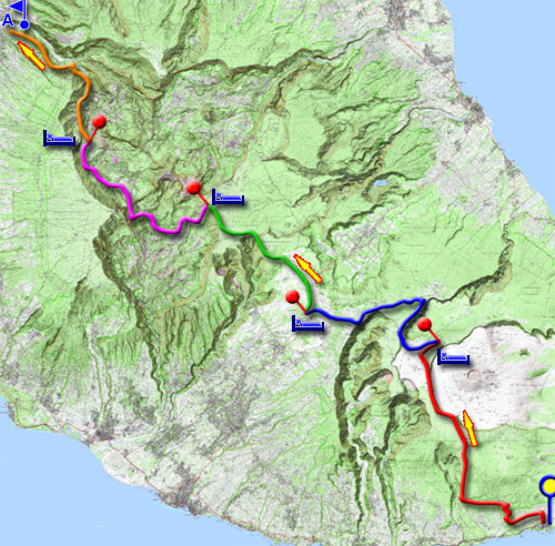 Plus de 100 km en cinq jours demandent un entraînement sérieux et on ne se lance dans cette traversée de l'île qu'après avoir testé ses capacités par un bon parcours quelques jours avant. C'est bien moins long que le Grand Raid mais certaines journées comme la première sont vite épuisantes avec plus de 2000 m de montée. Bien réfléchir avant de se lancer ou multiplier les entraînements. Le circuit de 114 km en quelques chiffres Première étape : 32 Km - D+ 2400 m - de 9 à 10 heures de marche Deuxième étape : 18.5 Km - D+ 250 m - de 6 à 7 heures Troisième étape : 16 Km - D+ 1000 m - de 5 à 6 heures Quatrième étape : 27 Km - D+ 1450 m - de 8 à 9 heures Cinquième étape : 20.5 Km - D+ 250 m - de 6 à 7 heures Premier jour : Se rendre à Saint-Philippe et débuter la traversée à quelques mètres de l'église par une première montée par le Chemin de Ceinture qui n'est pas difficile mais comporte des dizaines de lacets qui ont vite fait de rajouter des kilomètres. 250 m plus haut, il part à l'ouest et redescend pour rejoindre le départ du sentier botanique de Mare Longue. Emprunter ce sentier où il vaut mieux prendre au plus court et laisser les cours de botanique pour une autre visite. A la fin du circuit, remonter à 500 mètres par la RF de Mare Longue puis prendre à gauche la route des Camphriers pour une longue traversée reposante de la belle forêt de bois de couleurs. Au kiosque sur la droite, visiter la grotte cachée par les goyaviers puis entamer la montée vers les Puys Ramond. C'est parti pour 1400 mètres de montée avant de rencontrer le premier puy recouvert de cendres. Malgré une pente qui paraît régulière sur la carte, le sentier effectue pourtant d'innombrables petites descentes suivies de légères remontées pour franchir obstacles ou petites ravines qui rajoutent du D+. On domine sans trop la voir la Vallée Heureuse. A 1870 m, on rencontre le Piton Rick qui n'est pas de la même époque que les cratères suivants. De nouveaux cratères se remarquent aux alentours de 2000 m mais on aperçoit déjà les cratères qui dépassent des brandes. La végétation disparaît presque par moments. On passe entre ces hautes cheminées. Il reste encore beaucoup de chemin avant d'arriver au gîte mais il est possible de grimper tous ces petits pitons. Tenter d'en escalader au moins un pour profiter des beaux paysages depuis le sommet. On aperçoit déjà la Fournaise qui dépasse à l'horizon. La végétation est assez rase et le terrain a beaucoup perdu en angle de marche. La fin de la montée est donc beaucoup plus facile jusqu'au Piton de Bert. Se rapprocher du vide pour apprécier le spectacle du Piton de la Fournaise ou de l'Enclos Fouqué strié de noir des dernières éruptions. Entamer une longue remontée le long de la caldeira sur un itinéraire de plus en plus aisé d'autant qu'une piste y a été construite et qu'on pourra bientôt y venir en planche à roulettes. La fin de la montée s'effectue en longeant le Piton Rouge, en frôlant une chapelle faite de plaques de lave et une caverne que peu de monde visite. On est au pied du Piton Chisny et on rencontre très vite la RF du Volcan. Partir à droite et marcher jusqu'au gîte à moins de vouloir passer par le belvédère du Pas de Bellecombe Le lendemain, après une bonne nuit de repos et la forte montée de la veille, se préparer à passer une étape de repos. Emprunter tout d'abord la route forestière puis le sentier partant sur la droite pour rejoindre la Griffe du Diable. Partir sur le sentier Josémont en direction du Plateau des Basaltes, remonter quelques lacets caillouteux, traverser le plateau et poursuivre, toujours dans les pierres en direction de l'oratoire Ste-Thérèse. Entamer la descente par le sentier ou la vieille piste qui descend vers le Textor. Le sol est basaltique ou rocailleux mais la marche est aisée. On passe près de la Caverne des Lataniers, de la stèle à la gloire de Josémont Lauret puis le sentier coupe plusieurs fois la route avant de parvenir au pied du Piton Textor. Franchir la RF du Piton de l'Eau et marcher jusqu'à celle du Textor. Contourner le Piton de Sables par le nord et emprunter un des nombreux sentiers menant aux Trous Blancs. Visiter ou non ces curiosités géologiques, passer devant le respectable Tamarin Dodo et poursuivre vers le Piton Guichard qu'on contourne par le sud. Marcher en dominant les prairies et bifurquer à gauche après une longue haie de hauts cryptomerias. Le sentier, bordé de chaque côté de barbelés est facile à suivre. Il débouche sur le Chemin Grande Savane. Prendre à droite et marcher jusqu'au rond-point. Partir derrière les pistes d’entraînement et suivre le sentier longeant un affluent puis le Grand Bras de Pontho. On débouche à nouveau sur la petite route des Herbes Blanches. Partir à gauche et rejoindre très facilement le village de Bourg Murat ou le gîte près du Grand Bras de Pontho. Le troisième jour, remonter par la route en direction de la Plaine des Palmistes pour rejoindre le départ du sentier du Piton des Neiges. Rejoindre le point IGN 1603 au croisement de la RN3 et de la petite route de la Mare à Boue. Marcher sur route jusqu'au Chemin Doret et la Mare à Boue où se reflète le Piton des Neiges. Poursuivre tout droit sur une nouvelle route bétonnée. Partir à gauche sur le GRR2 et marcher entre les barbelés clôturant les prairies. Effectuer un angle droit vers l'ouest pour contourner le Piton Tortue. Le sentier, agréable jusque là devient de plus en plus boueux. Il se rapproche de la vallée profonde du Bras de Ste Suzanne et plus loin de celui de Duvernay. Il faut marcher entre les deux remparts avec quelques passages par échelles. Descendre dans une forêt touffue jusqu'aux cavernes du Bras Chansons. La végétation s'amenuise avant d'arriver au Plateau Kerveguen où l'on arrive bientôt à quelques mares de cette zone marécageuse. Continuer sur le sentier du Piton des 