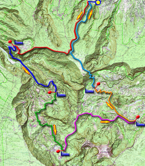 La boucle part et revient au Bois de Nèfles mais peut également se décliner à partir de la Bretagne par les circuits de Montauban et de Grand Figuier (ou une combinaison des deux). Les étapes sont volontairement courtes afin de laisser à chacun sa chance d'effectuer un long périple sans trop souffrir jour après jour. Bois de Nèfles est le point de départ de la boucle du Pic Adam, ce qui permet de ne pas passer deux fois au même endroit le jour du retour. Le circuit de 107.5 km en quelques chiffres Première étape : 19 Km - D+ 1150 m - de 7 à 8 heures de marche Deuxième étape : 15 Km - D+ 950 m - de 5 à 6 heures Troisième étape : 21 Km - D+ 1300 m - de 7 à 8 heures Quatrième étape : 18 Km - D+ 750 m - de 6 à 7 heures Cinquième étape : 12.5 Km - D+ 1600 m - de 6 à 7 heures Sixième étape : 22 Km - D+ 100 m - de 6 à 7 heures Premier jour : Quitter Sainte Clotilde à Saint-Denis et remonter à Bois de Nèfles à moins de s'y rende en bus. On débute la randonnée par une route bétonnée qu'on quitte vite pour le sentier de la Roche Ecrite. On monte dans le sous bois sous de magnifiques jamrosats avant de rencontrer une portion de goyaviers puis de cryptomerias sur un sentier encombré de racines glissantes. Plus loin c'est la forêt de bois de couleurs qu'on traverse sur des marches de plus en plus nombreuses. Le sentier effectue quelques détours pour éviter des ravines, affluents de la Ravine Blanche. On se retrouve au pied du Pic Adam qu'on ne remarque pas en raison de la végétation. Le sentier effectue quelques lacets puis grimpe assez fortement le long d'une arête jusqu'aux eucalyptus marquant le début de la montée à la Roche Ecrite. Attaquer la montée en direction de la Roche Ecrite. La pente est constante jusqu'au Piton Mavouse qui est suivi de quelques faux plats qui reposent un peu. La pente reprend assez vite. Le cheminement s'effectue dans la forêt de bois de couleurs, les brandes et les goyaviers. Des portions sont envahies de longoses ou glissantes. Les tamarins sont de plus en plus nombreux puis ce sont les calumets qui se multiplient le long du sentier. A l'approche du sentier venant de Mamode Camp, ils créent même un sentier tunnel ombragé. Depuis le Piton Mavouse, le sentier a fait de nombreux détours pour éviter les ravines. La clairière formée par le croisement des deux sentiers est impossible à manquer, toujours sous les calumets. Prendre à gauche et rejoindre le gîte sous les tamarins de plus en plus nombreux. Après une courte halte au gîte, partir vers le sud et marcher sous les tamarins en longeant plus loin une ravine. Longer toujours le rempart en direction de Dos d'Ane en effectuant souvent des montées et descentes pour franchir des petites ravines. La forêt humide de la Plaine d'Affouches est très belle même si on retrouve la gadoue inévitable. La végétation est touffue mais on bénéficie parfois de beaux points de vue sur la Crête de la Marianne ou celle d'Aurère. Mais c'est plus loin, après le croisement du sentier du Piton Bâtard qu'on a les plus beaux et les plus larges. Le sentier entame sa dernière descente le long de l'arête rocheuse en direction de la Roche Verre Bouteille qu'on aperçoit dans le fond. A la pointe rocheuse visible de Dos d'Ane, si la fatigue est installée, descendre par le sentier de droite sinon poursuivre vers le Cap Noir par des échelles ou sur le sentier de droite, plus court mais plus caillouteux. Rejoindre le gîte de Dos d'Ane par la route. Le lendemain, partir de l'église de Dos d'Ane et descendre la Rue Ferdinand Louise jusqu'au départ du sentier. On rejoint en deux minutes le rempart en passant entre cases et jardins. La descente est tout d'abord ordinaire et classique. Puis on rencontre de plus en plus de hautes marches, de lacets puis, plus loin, des câbles de sécurité et même des échelles. La descente de près de 800 m est interminable et donne une idée de ce qu'est l'effort à fournir pour remonter. Il y a pourtant quelques portions plus plates pour reposer les jambes. Les paysages sur la vallée de la Rivière des Galets ou les crêtes parallèles de la Marianne et d'Aurère. Les asperseurs de l'Îlet Albert ou la source captée peuvent rafraîchir au passage. On parvient, après une dernière descente, au Bras de Sainte-Suzanne qui se traverse par un gué très rocheux. On peut avoir à mouiller les pieds si le niveau est fort. Une fois sur l'autre rive, rejoindre la piste qui se termine un peu plus loin à l'aire de pauser des hélicoptères. On y rencontre presque à chaque fois des mafatais en train de préparer leurs provisions dans de grands filets qui seront rapidement transportés jusqu'à un îlet perdu de Mafate. Longer la rivière ou la traverser fréquemment sur des gués très bien aménagés. Au lieu dit la Porte, reconnaissable aux travaux bétonnés au-dessus de nos têtes, prendre à gauche un sentier abrupt sur hautes marches en pierre suivi d'une longue portion dominant la falaise bétonnée. Le sentier devient assez caillouteux, monte ou descend au gré du relief. Prendre le sentier de gauche au premier croisement. On se retrouve au pied du Piton Cabris que le sentier va contourner par le sud. Une bonne partie du sentier est creusé dans la falaise et comporte de nombreuses rambardes pour protéger du vide. Les paysages sur la droite sont superbes et sauvages. De nombreux lacets assez raides permettent d'arriver à Bord Bazar pour de nouveaux panoramas sur le sud du cirque de Mafate. Prendre un des trois sentiers permettant de rejoindre Aurère en privilégiant le principal qui finit au dispensaire. Si on ne désire pas traverser Aurère, emprunter le sentier le plus à droite à Bord Bazar. Descendre vers le Bras Bémale et emprunter la passerelle dominant le bras de 50 m. Terminer cette deuxième journée par la recherche du gîte choisi à l'îlet à Malheur. Le troisième jour, partir vers l'Îlet à Bourse en effectuant une bonne