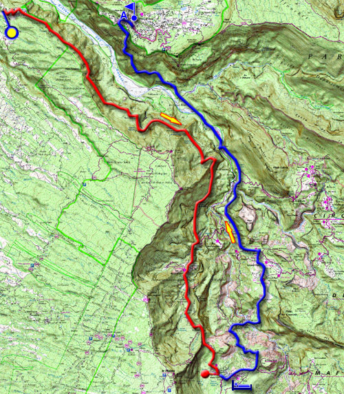 Les deux trajets de la boucle sont presque parallèles mais ne se ressemblent pas du tout. Une grande partie de la première journée s'effectue à plat par la Canalisation des Orangers alors que la deuxième comporte plusieurs difficultés dont la descente vers la Roche Ancrée ou les remontées vers Grand Place ou Dos d'Ane. Quel que soit l'itinéraire, on bénéficie de splendides panoramas sur le Cirque de Mafate. La deuxième journée demande une bonne condition physique. Le circuit de 39.5 km en quelques chiffres Première étape : 19 Km - D+ 1100m - de 7 à 8 heures de marche Deuxième étape : 20.5 Km - D+ 1200 m - de 8 à 9 heures Premier jour : Partir de Sans Souci au classique départ vers la Canalisation des Orangers. La montée est forte sur piste la plupart du temps avec quelques raccourcis par des sentiers qui coupent les lacets. Une fois parvenu au rempart, plus de difficulté pour atteindre le captage des Orangers. Le sol est plat, le passage très large même si des herbes peuvent parfois avoir poussé depuis le dernier nettoyage. On longe constamment la canalisation de transport de l'eau. Les paysages, depuis l'entrée dans le cirque jusqu'à la fin du parcours sont grandioses. La tuyauterie épouse au plus près la courbe de niveau. C'est pourquoi elle effectue des détours parfois importants comme lorsqu'elle se rapproche de la cascade Flamand par exemple. En fin de parcours, elle passe quand même dans un tunnel. On arrive en moins de 4 heures au croisement des sentiers vers les Orangers et en direction des Lataniers. Partir à droite et rejoindre le petit barrage du captage des Orangers. Le sentier se met alors à monter de manière assez sévère par endroits en longeant au plus près la ravine des Orangers. Plus loin, il s'en éloigne et une dernière montée amène aux premières habitations de l'Îlet des Orangers. Marcher jusqu'au réservoir et entamer la descente en lacets vers la Ravine du Maïdo. Puis c'est la Ravine Grand-mère que le sentier emprunte avant d'attaquer de nouveaux lacets pour rejoindre la Brèche reconnaissable de loin à son rocher pointu qui domine. Ne pas prendre à droite le sentier du Maïdo et franchir l'escalier bétonné pour entamer la descente vers Roche Plate. La marche est agréable sous les filaos qui envahissent le Piton de Roche Plate. Un petit cours d'eau se passe facilement avant d'arriver aux premières cases de Roche Plate. Se diriger vers le gîte choisi pour la nuit. Le lendemain, la journée sera plus rude. Marcher en direction du Bronchard en traversant l'îlet vers l'est. Partir sur la gauche au premier croisement et descendre vers le cimetière du village qui semble à l'abandon. A partir du cimetière, la pente du sentier Dacerle va aller de plus en plus en verticalité. On domine parfois les lacets qu'on va dévaler dans quelques minutes. Le sentier, pierreux et poussiéreux est parfois protégé ou sécurisé avec des câbles. Plus bas, après de nombreux efforts, on parvient à la petite chute d'eau de la Ravine de Roche Plate pour une halte rafraîchissante. Plus bas, prendre à droite au croisement et passer quelques montées et descentes successives avant d'arriver à la Rivière des Galets. Un sentier débute à gauche en direction de Cayenne. Il est possible de le prendre si l'on désire. Celui de Grand Place se récupère après le gué proche d'un bassin alimenté par une courte chute. Une nouvelle montée assez rude de 350 m s'effectue comme toujours pas de nombreux lacets. Au col, descendre vers Grand Place qu'on voit très bien au pied du Piton Carré ou du Piton Papangue. Partir sur la gauche en arrivant à l'école et marcher en direction de Cayenne sur un sentier en escalier très caillouteux. A partir de Cayenne, trois itinéraires sont possibles par les flancs du Piton Tortue ou par la rivière. Poursuivre tout droit sur un sentier facile qui rejoint la passerelle du Bras d'Oussy après avoir passé quelques portions un peu techniques ou vertigineuses. Franchir l'édifice métallique qui domine les bassins qu'on devine 50 m plus bas. Nouvelles montées et descentes vers la Porte sur un sentier pierreux de qualité qui se finit par des marches en pierre aux alentours d'un gué sur la Rivière des Galets. Franchir ce premier gué sur de grosses roches régulièrement installées pour ne pas se mouiller les pieds. On franchira encore quelques gués identiques avant d'arriver à Deux Bras où attendent habituellement les taxis pour revenir au village de la Rivière des Galets. En cas de fatigue, louer les services de ces taxis et remonter à pied à Sans Souci. Sinon, traverser le gué du Bras de Sainte-Suzanne et entamer la difficile remontée à Dos d'Ane. Marches, lacets, cordes, échelles, tout y est pour finir en beauté cette longue boucle dans Mafate. Une fois les touffes de bambous atteintes, on peut dire que l'arrivée est proche. Les sportifs qui en ont encore dans les jambes se lanceront sur le sentier de bord pour rejoindre sans difficulté les quartiers de la Rivière des Galets. En restant à Dos d'Ane, des bus redescendent régulièrement vers les villes littorales. Une fois à la Rivière des Galets, il est possible de retrouver Sans Souci en traversant la rivière et en remontant un sentier facile à trouver (Randonnée 1537).