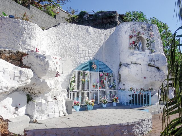 C'est le blanc, le bleu ciel et le rouge qui attendent le visiteur de Notre Dame de Lourdes de Terre Sainte. La partie gauche est dédiée à Saint-Expédit, la droite à la Vierge. Cet endroit très fréquenté se remarque de loin. En règle générale, ces deux entités sont séparées. Ici, elles se côtoient sans pourtant mélanger les couleurs, les symboles ou les artifices. Selon la légende, Saint-Expédit, légionnaire romain converti au christianisme, fut décapité pour ses croyances par Dioclétien, 303 ans avant notre ère. Non reconnu par l'église, ce saint martyr fait l'objet d'un culte très développé à la Réunion depuis 1930. On peut lui demander tout ce qu'on veut à condition que ce soit vite exhaussé !