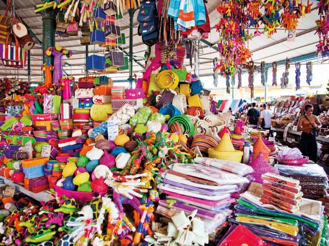 Un grand kiosque métallique de 36 m de diamètre et 13 de hauteur, construit en 1876, presque circulaire (dodécagone) enferme plusieurs boutiques d'épices, de fruits et légumes et principalement des objets artisanaux tout droit issus de la grande Île malgache, toute proche. L'espace pour circuler est suffisant et les vendeuses ne sont pas trop insistantes. Quatre fontaines surmontées de statues d'angelots entourent l'édifice qui n'est ouvert que de 7 h à 18 h. A l'emplacement des boucheries du XIXème siècle, quelques snacks permettent de se rafraichir aux abords du marché. Profiter d'un mercredi pour effectuer la visite ou acheter quelques souvenirs car, tout près, à la gare routière se tient le marché hebdomadaire des fleurs. Orchidées, anthuriums, fleurs en tout genre donnent lieu à une flânerie supplémentaire.