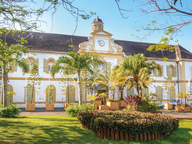 Cet ancien bâtiment du Roi servit d'entrepôt dès sa construction en 1770. La proximité de la Rivière d'abord permettait un chargement rapide des chaloupes qui transportaient les marchandises sur des bateaux plus grands attendant au large. En 1825, ces bâtiments sont cédés aux services municipaux. Les greniers à grain (café, blé ....) sont transformés en pièces qui sont toujours les mêmes 200 ans plus tard. Le bâtiment, long d'une quarantaine de mètres, enduit à la chaux, est d'un bel aspect et n' a pas été remis en état depuis les années 75. Visiter près de l'hôtel de ville : la fontaine et sa statue de bronze, le monument au morts et son poilu de 1919, la statue de François Césaire de Mahy et le buste de Méziaire Guignard dont on a emprunté la rue pour se rendre sur les lieux. Terminer par une courte balade dans le jardin avant de filer vers la rue des Bons Enfants.