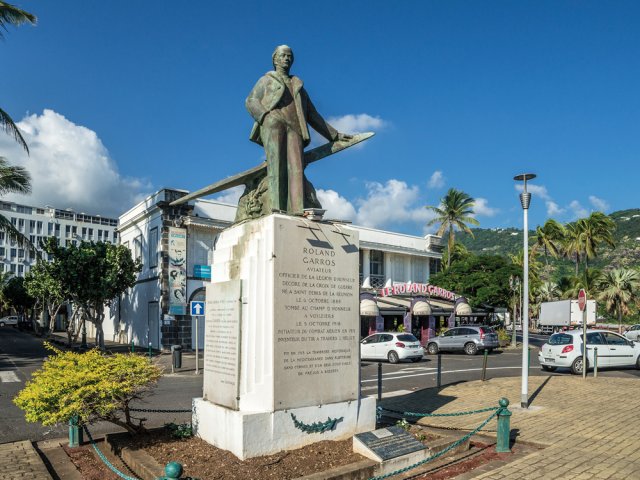 Roland Garros (1888 – 1918) Cet aviateur n'a vécu que quelques années à la Réunion. Si ce nom évoque à tout un chacun des tournois de tennis, l'intéressé ne pratiquait ce sport qu'en amateur. En revanche, il était un sportif et se fit remarquer très jeune par le cyclisme, le football, le rugby et plus tard le sport automobile. Il achète une boutique de vente de voitures de sport et en 1909, s'offre son premier avion, un Santos-Dumont. Il passe son brevet en 1910, bat le record d'altitude en 1911, effectue la première traversée de la Méditerranée en moins de 8 heures. Fait prisonnier durant la guerre après un atterrissage forcé, il s'évade au bout de trois ans et, affaibli, reprend du service aérien avant d'être détruit en vol au-dessus des Ardennes la veille de son trentième anniversaire. La statue était exposée à Paris avant d'être transportée à la Réunion en 1926. Une plaque en marbre apposée sur l'avant résume la vie de l'aviateur tandis que des citations de Clemenceau, Pétain et Gouraud occupent les côtés.