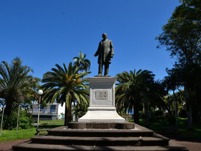 La statue en fonte du personnage siège au cœur du jardin qui borde l'hôtel de ville de Saint-Pierre. Il domine du haut de son piédestal construit sur un socle carré constitué de quatre marches de pierre de taille. Le cadre arboré et verdoyant mérite à lui seul la balade. La sculpture a été installée ici en 1939, pour le 104ème année de naissance de ce personnage politique. François Césaire de Mahy (1830 - 1906), surnommé le Grand Créole, médecin et plus tard journaliste se lance dans la politique et obtient très vite un mandat de député qu'il honorera jusqu'à son dernier souffle après de multiples réélections. Il est même nommé ministre de l'agriculture en 1882 sous le gouvernement de Jules Grévy puis devient plus tard ministre de la Marine et des Colonies en 1883. Il est pour beaucoup dans la guerre déclenchée avec Madagascar pour la colonisation de l'île. 36 ans de sa vie seront consacrées à la politique.